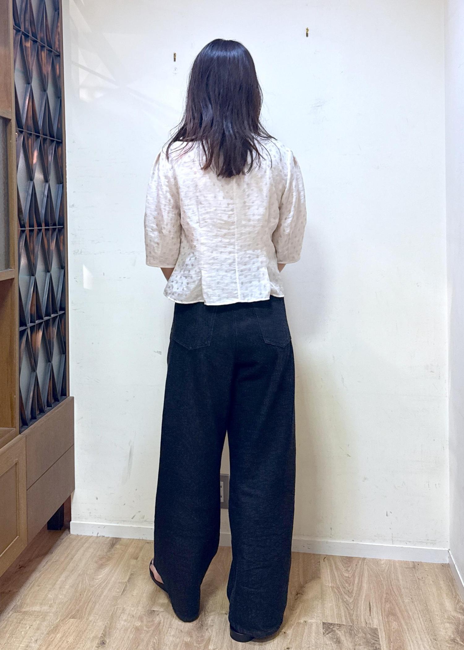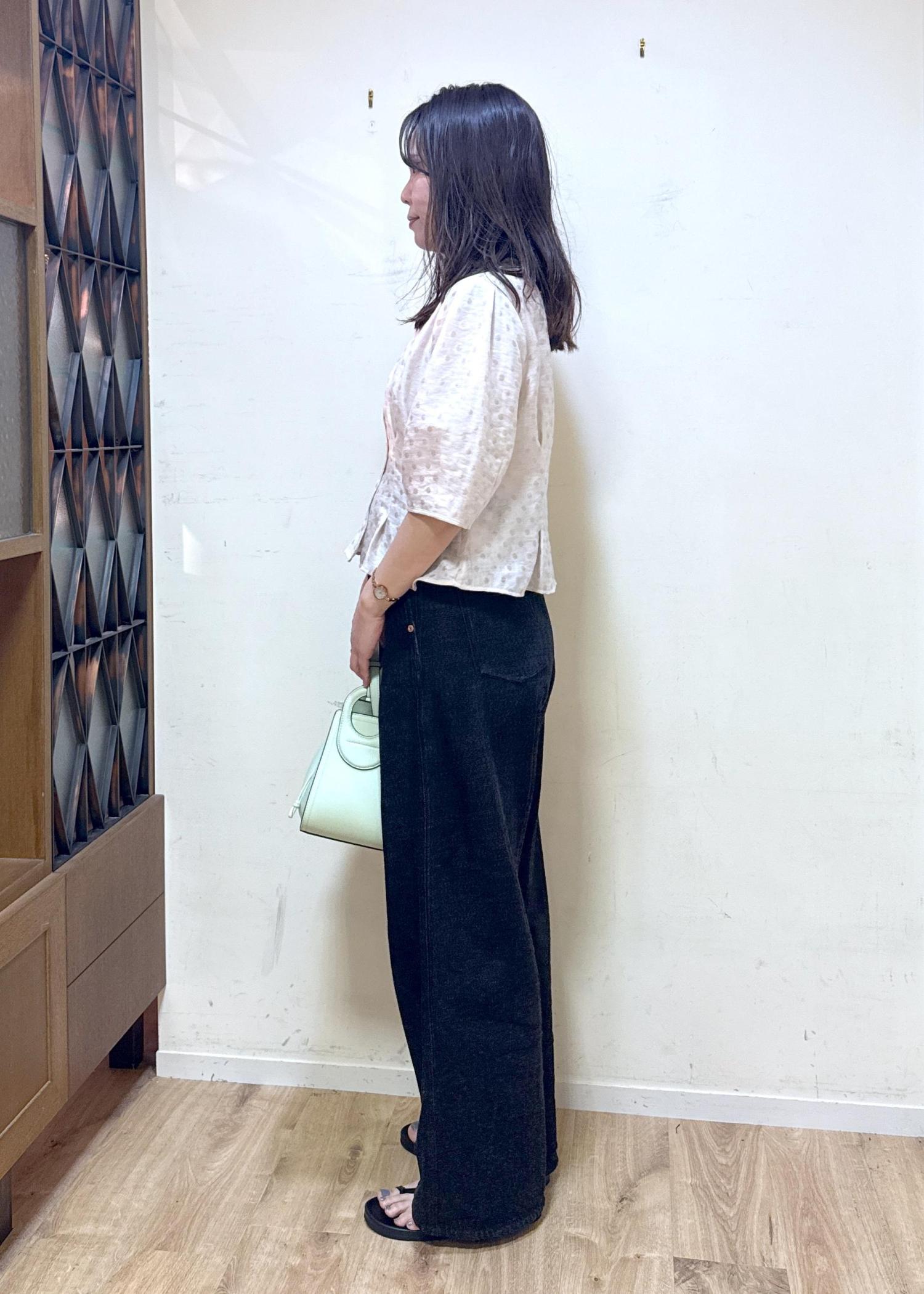 フェミニンな印象のこちらのブラウスをブラックデニムとコーディネートしました。