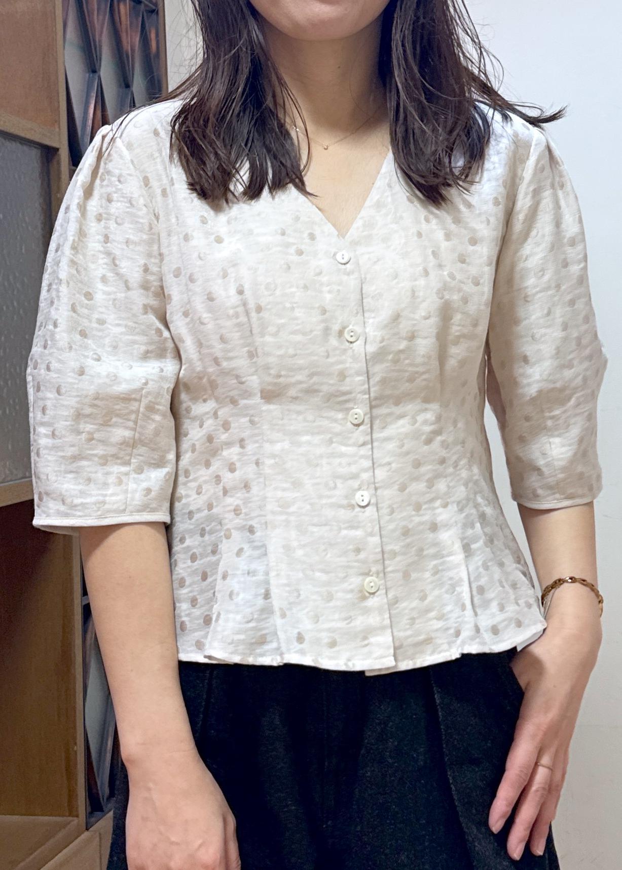 ROPÉ【洗える・羽織にもなる】Vネック5分袖パフスリーブブラウスホワイト系 / F¥18,700レビュー163センチ Fサイズ着用