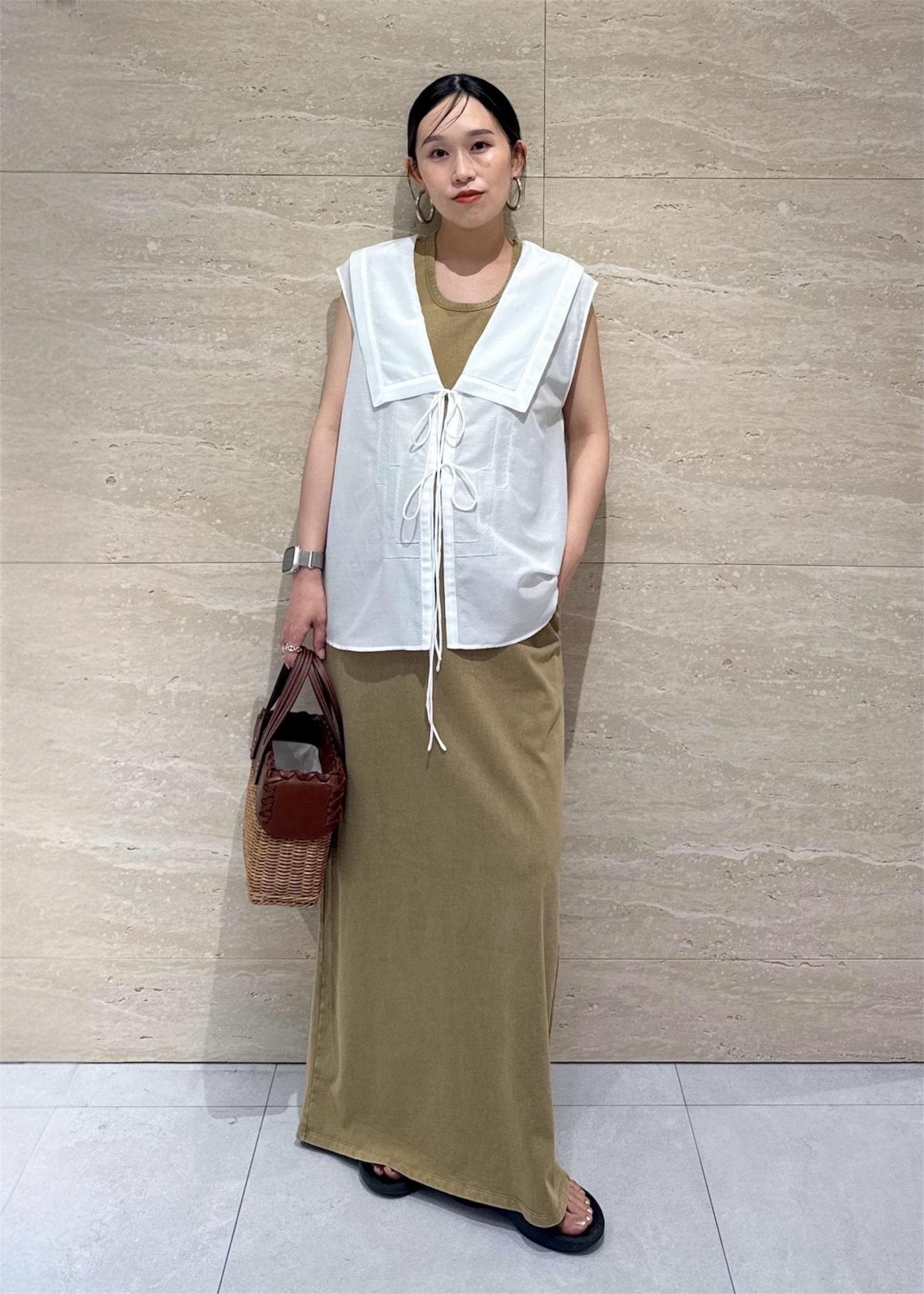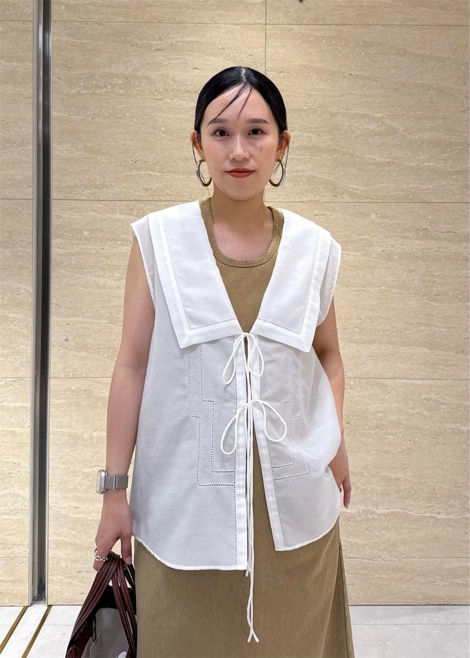 シンプルなワンピースに、デザイントップスを合わせフェミニンさを加えてコーディネートしてみました。