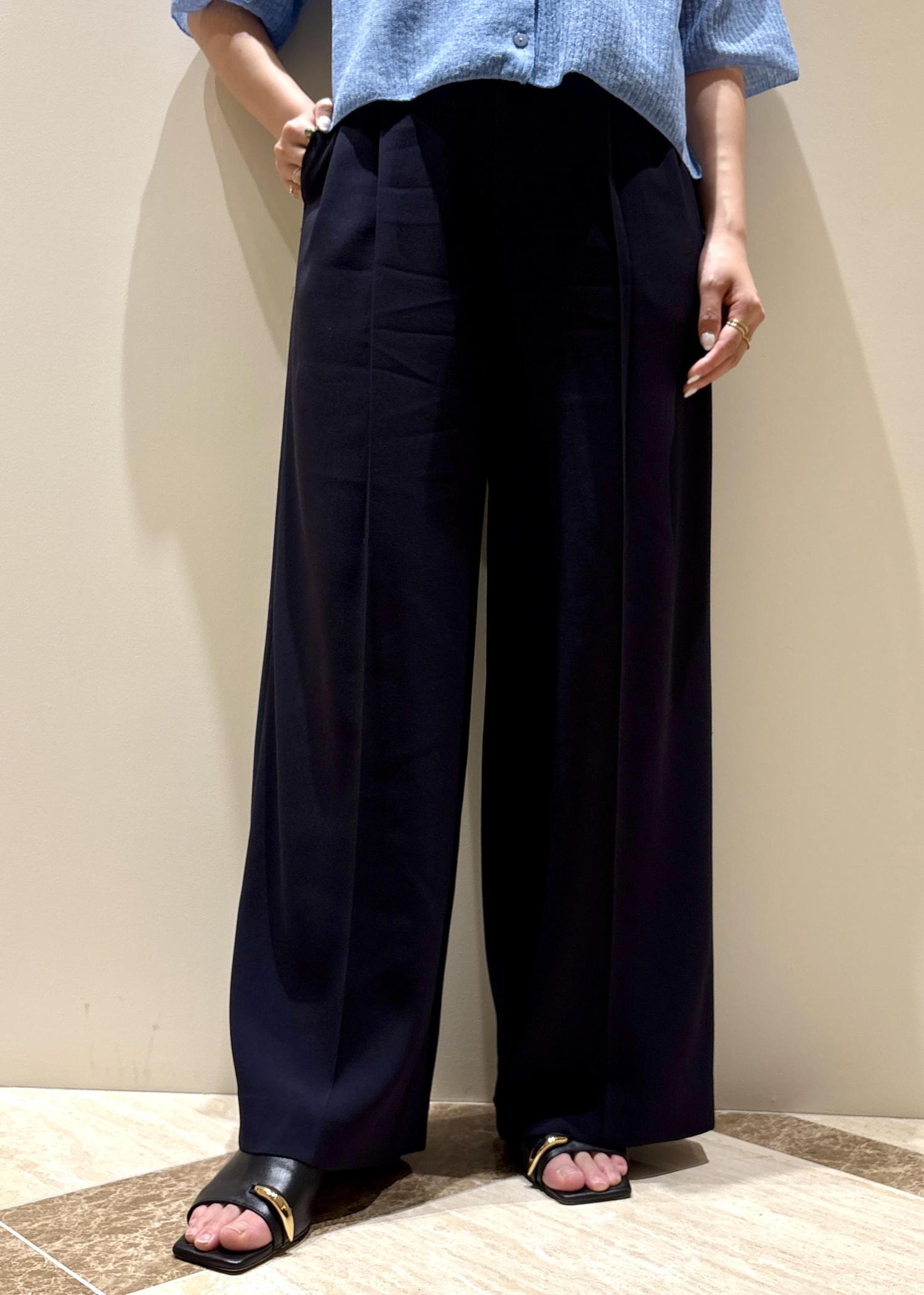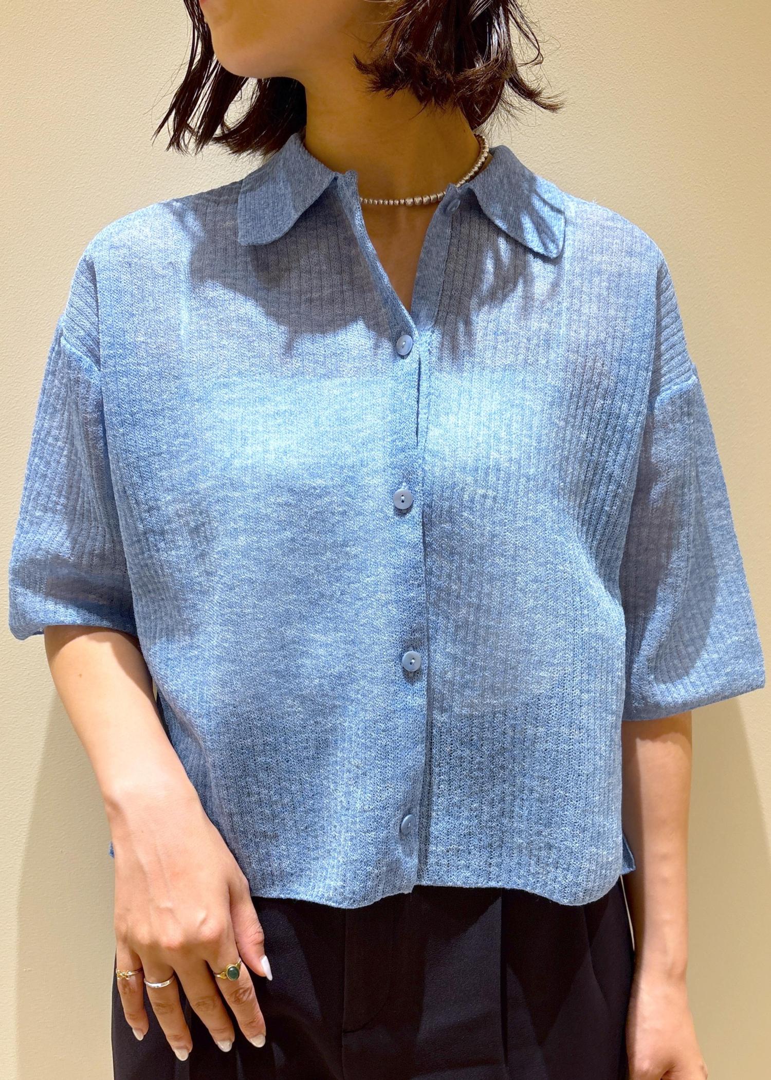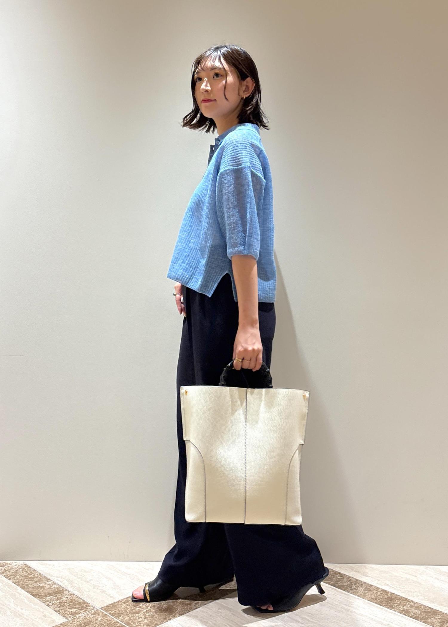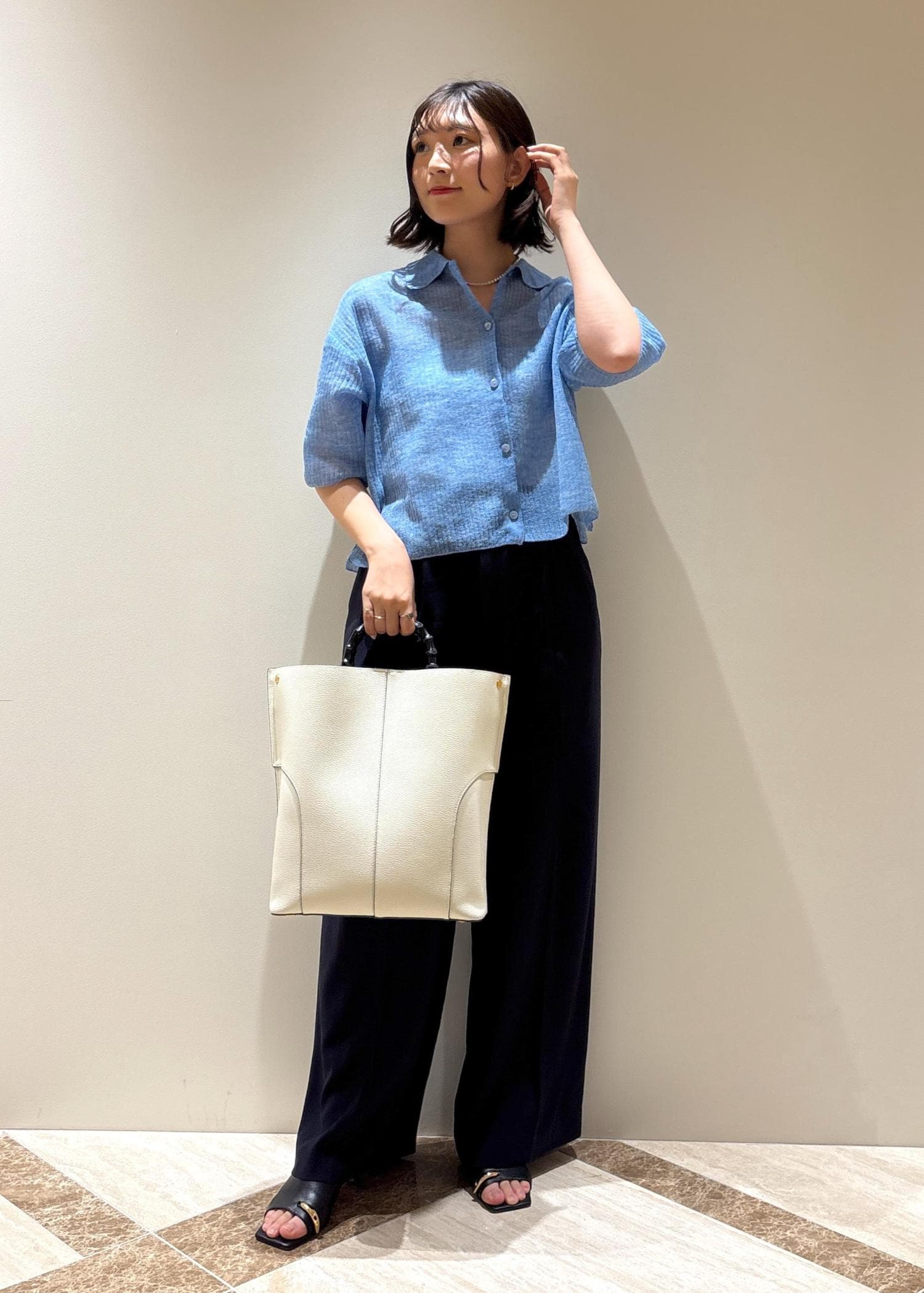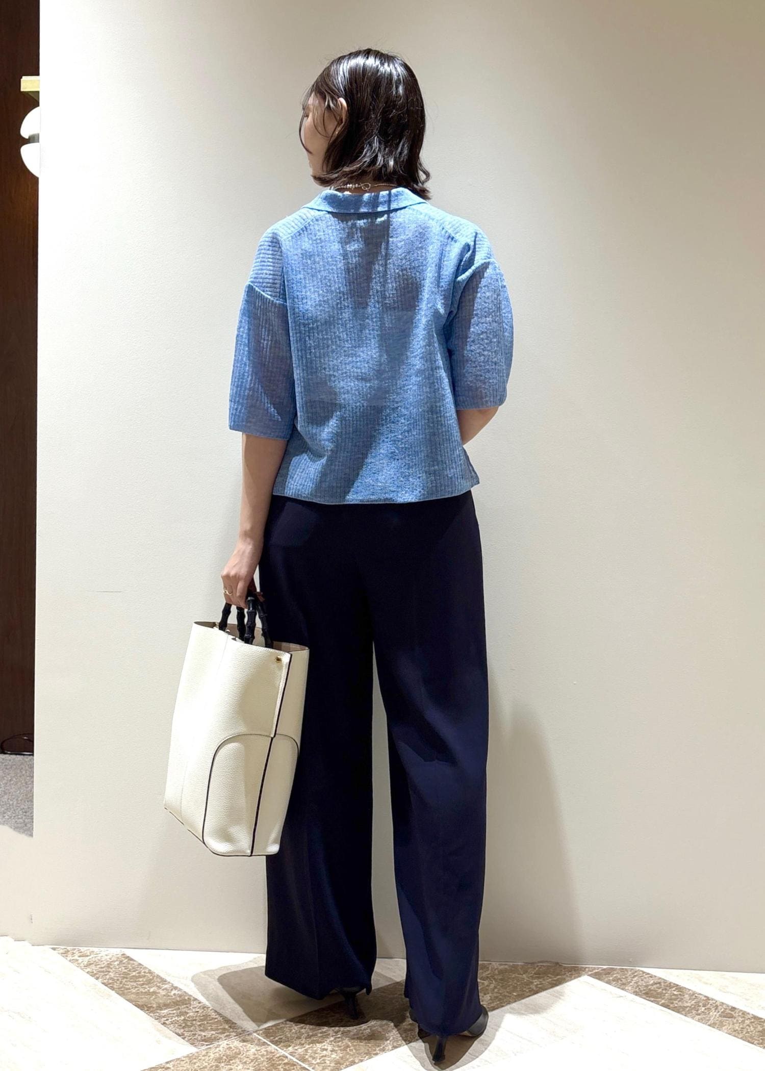 ブルーのシアーポロシャツにサラッとしたワイドパンツを合わせ、オンオフ兼用で着用できるスタイリングにしてみました!