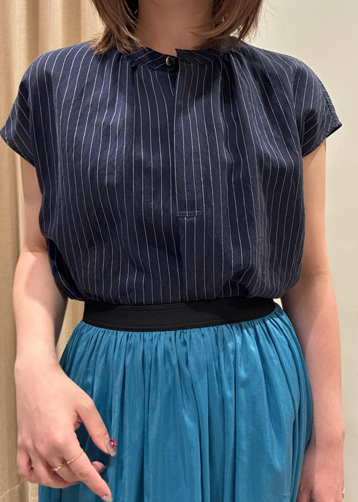 アウトレットROPÉ【洗える】キュプラシルク フレンチスリーブブラウスネイビー / F¥9,900レビューシャリ感があり肌ばなれの良い生地感。