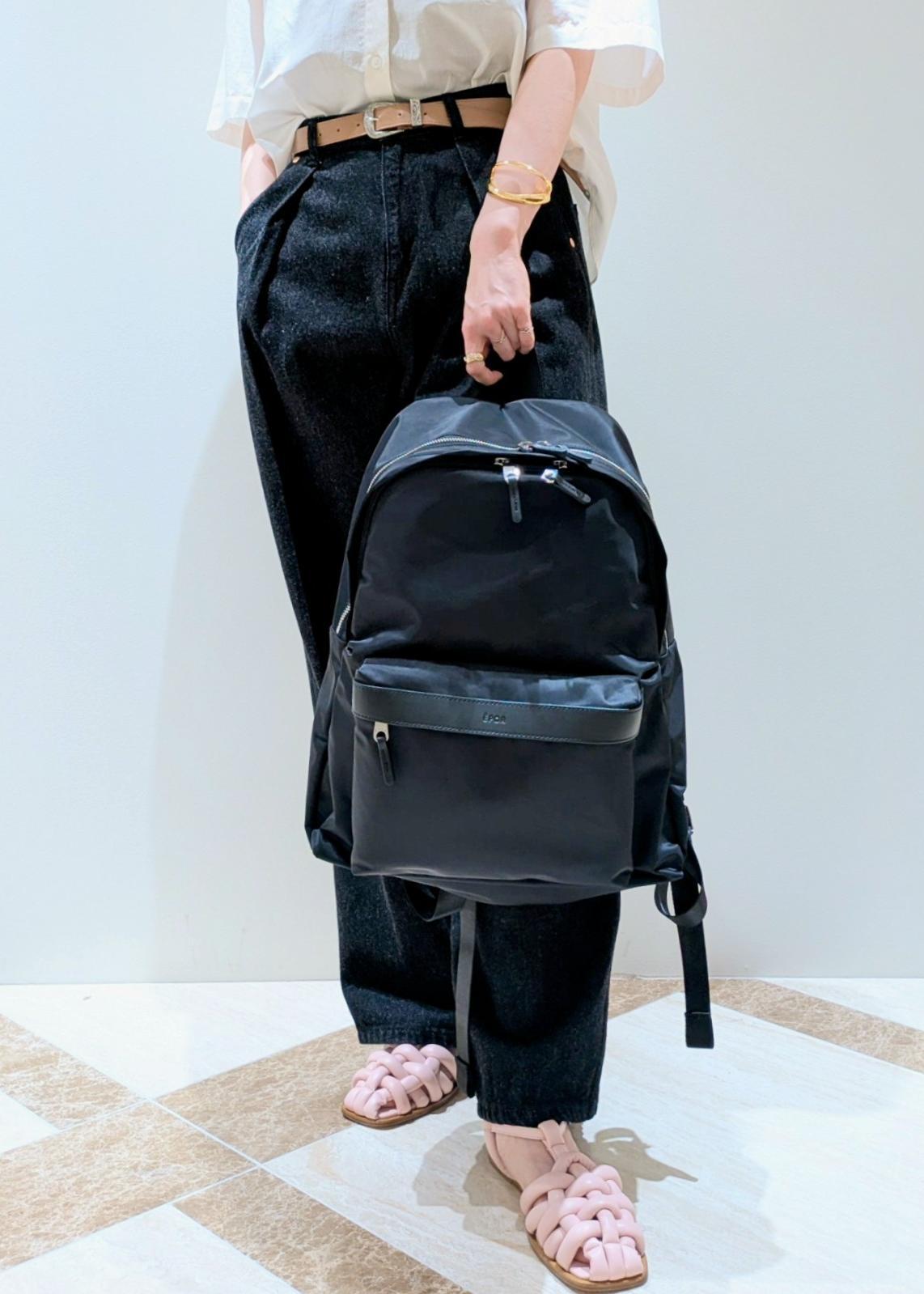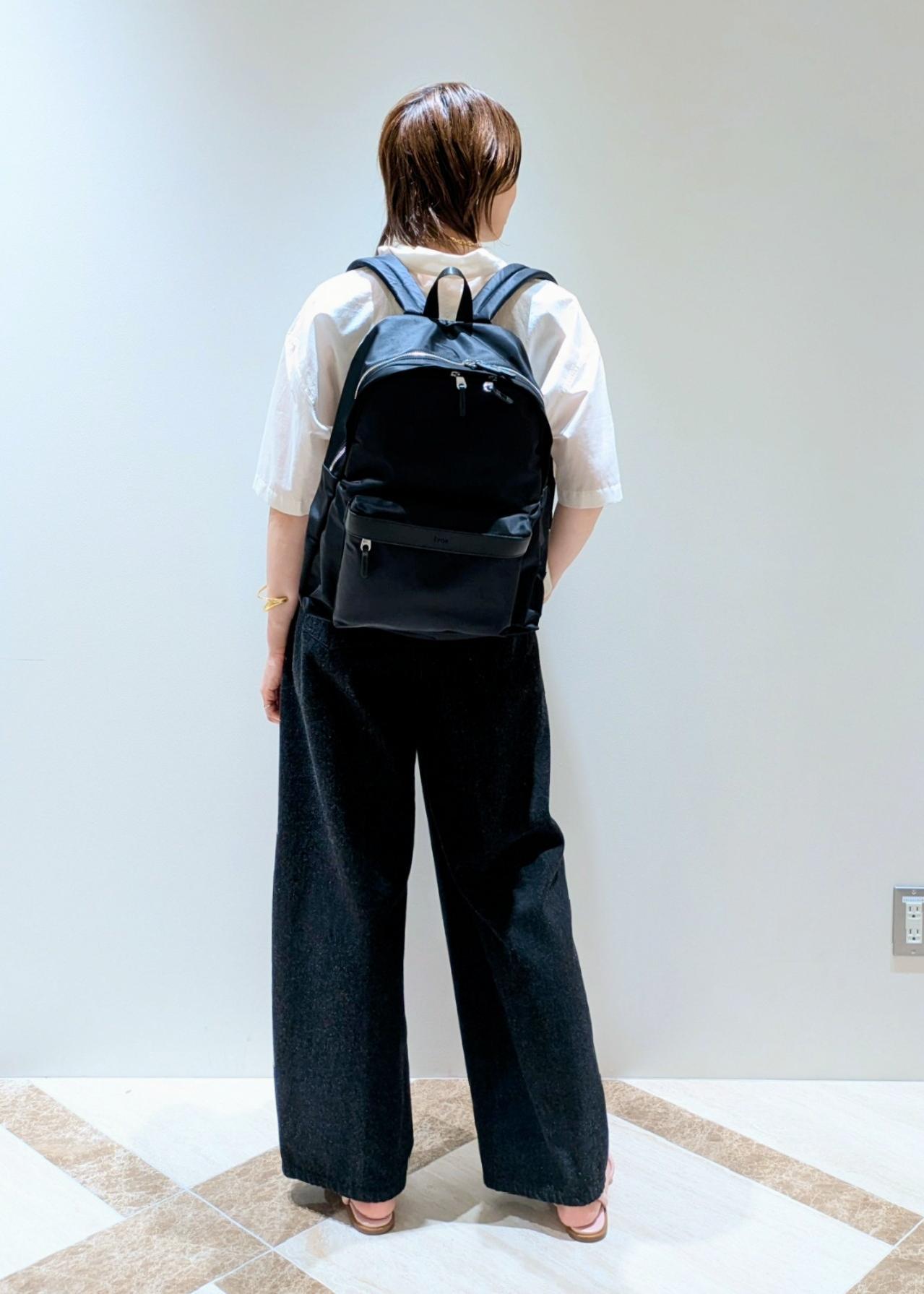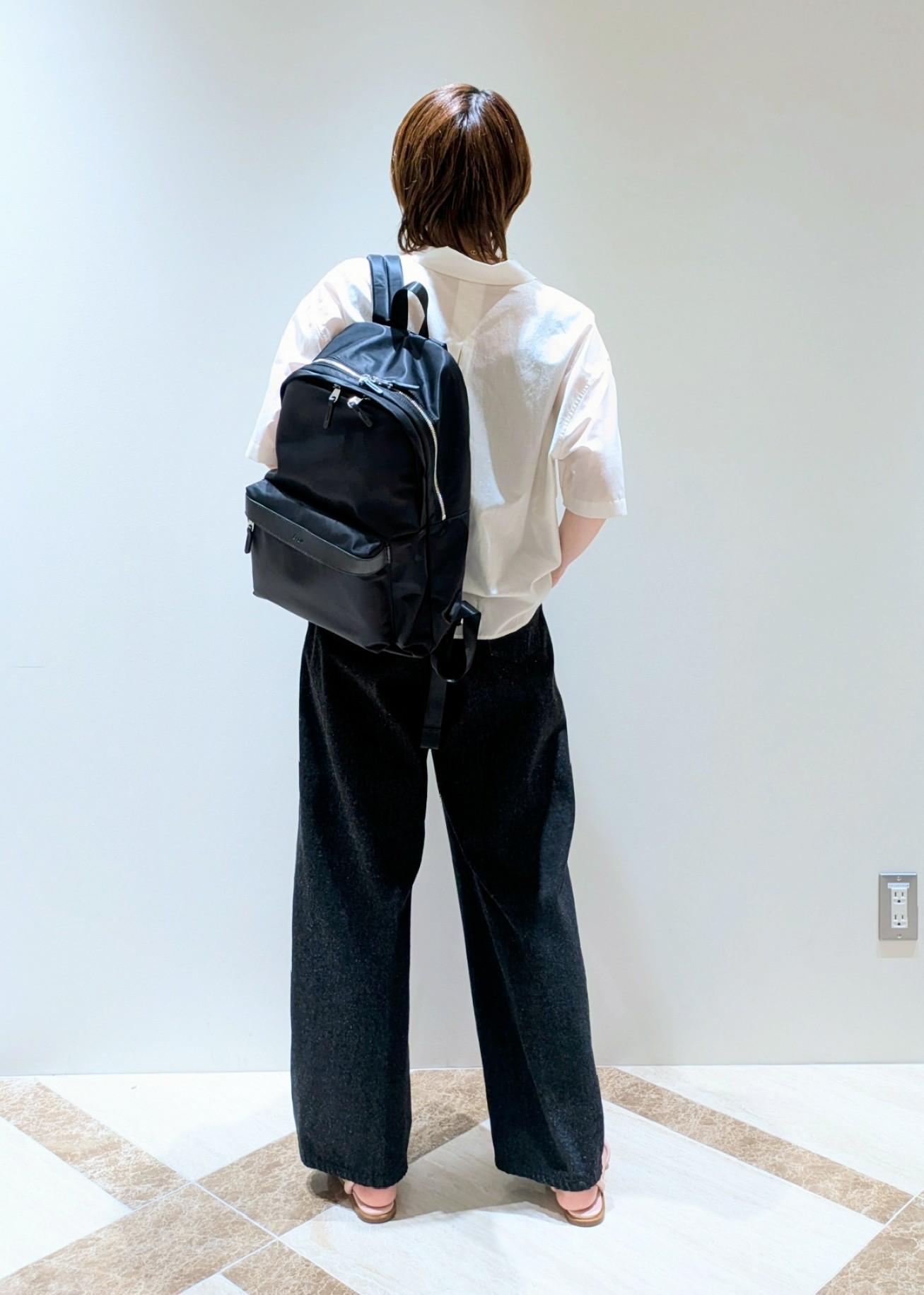 カジュアル過ぎないハリのある素材なので、かっちりめなスタイリングにも馴染む万能リュックです。 -