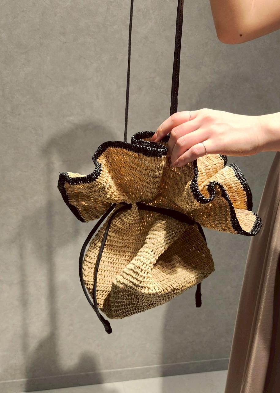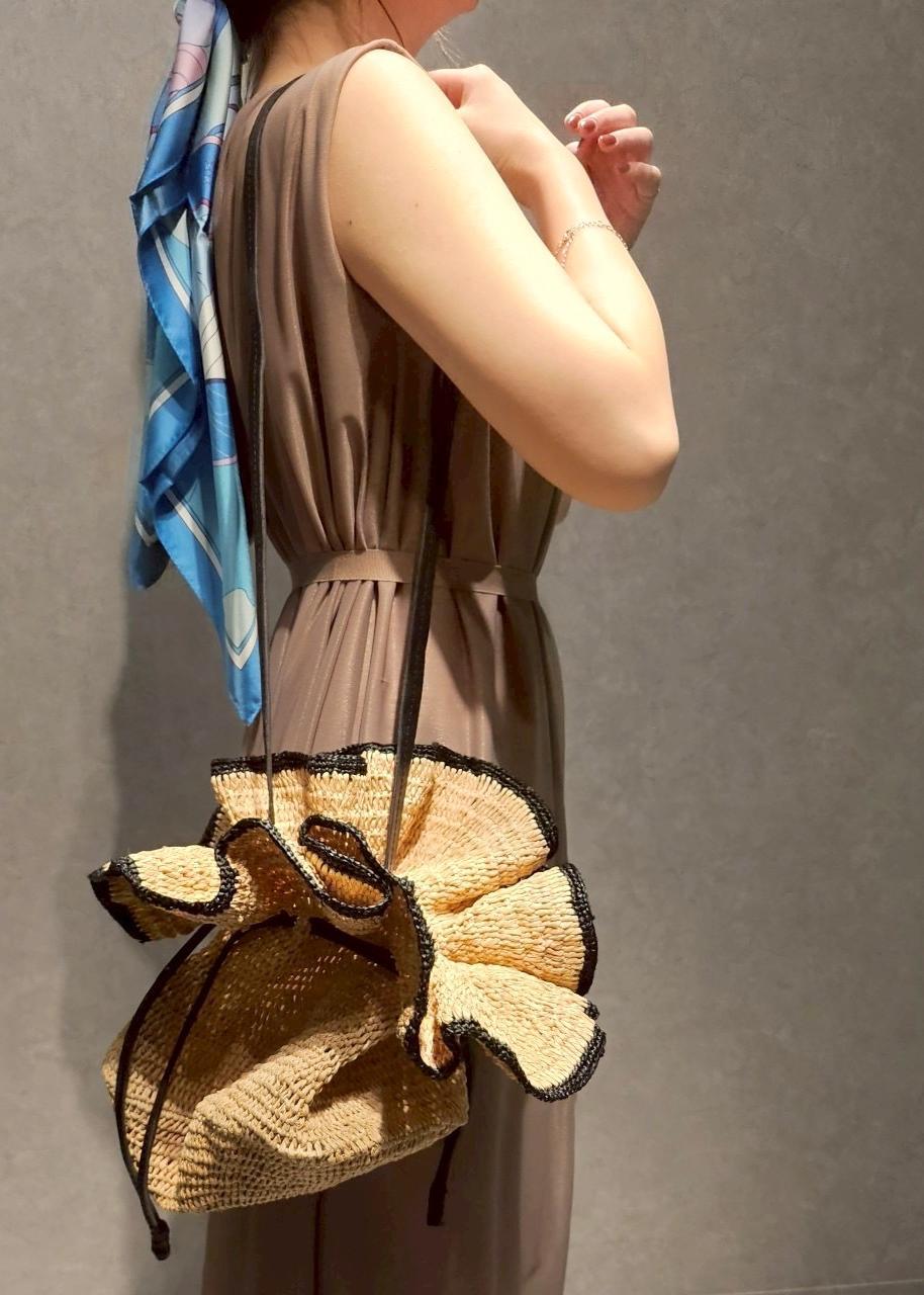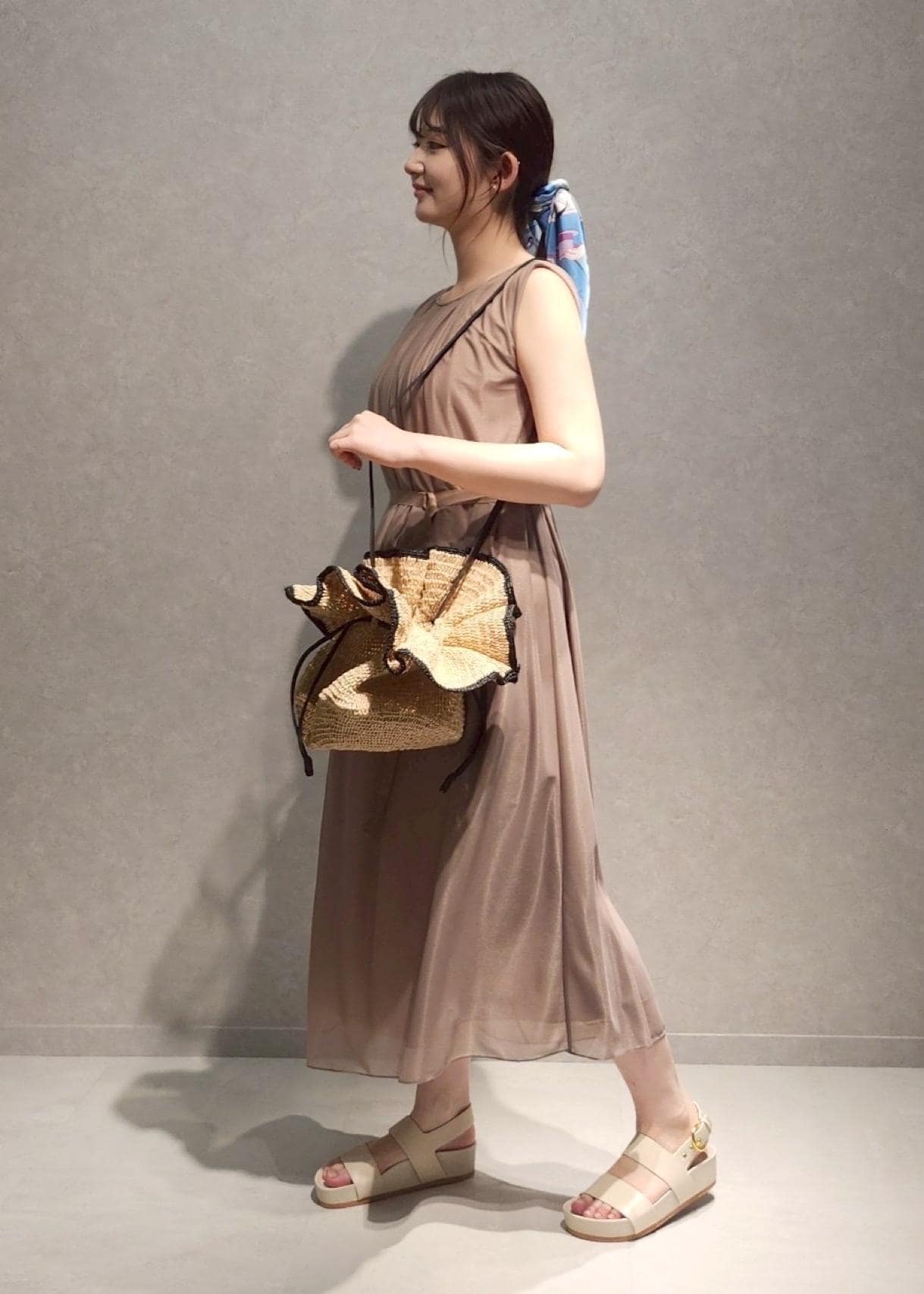 ラフィアバッグと厚底サンダルで夏らしさをプラス。