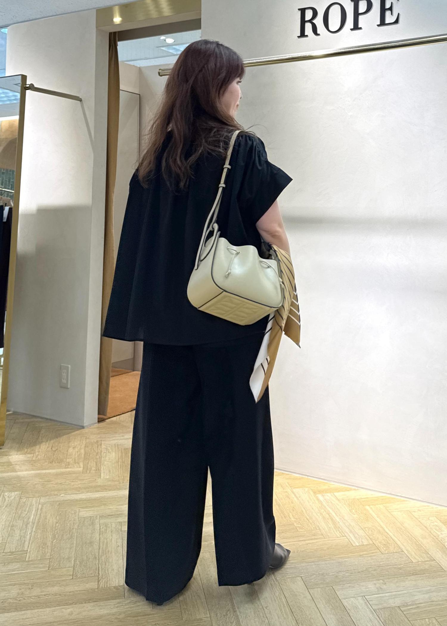 コーディネートが重くならないようバッグとスカーフのアクセントをプラスしました。