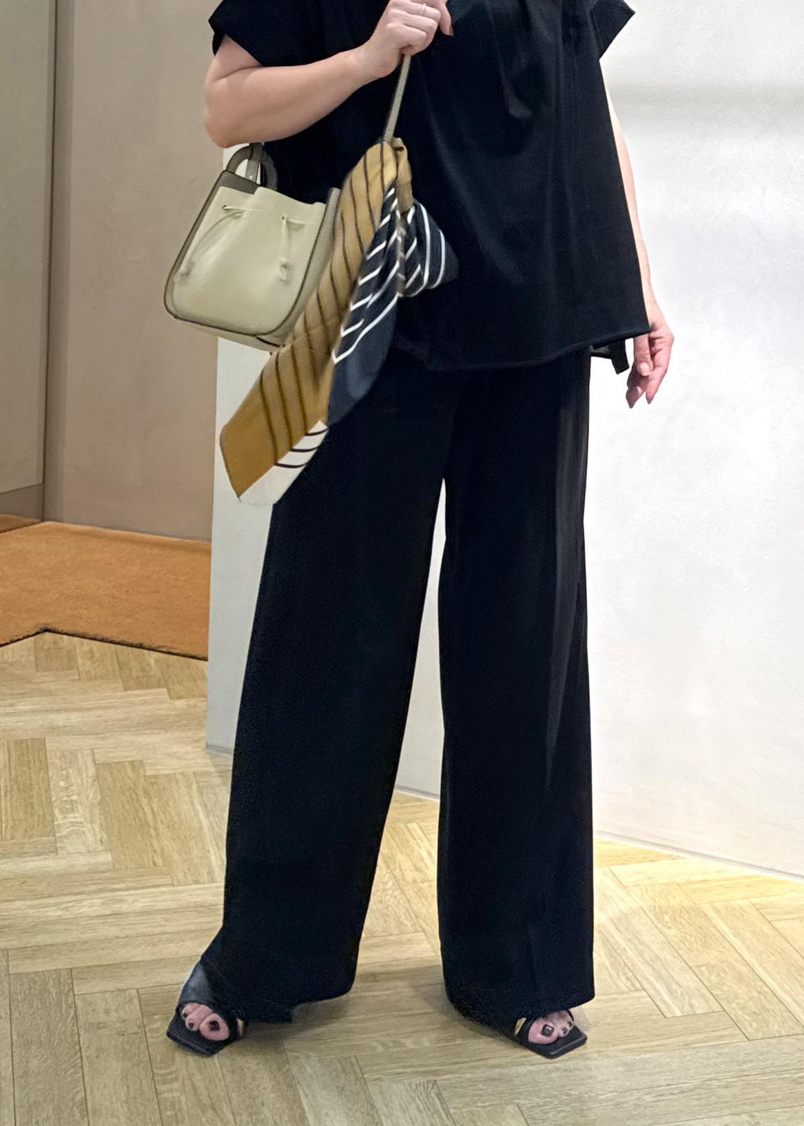 落ち感があり足のラインを綺麗に見せてくれますし私は幅が広すぎないワイドかなと思うので足捌きがスムーズだったりすっきり見えするなと思いました。 -