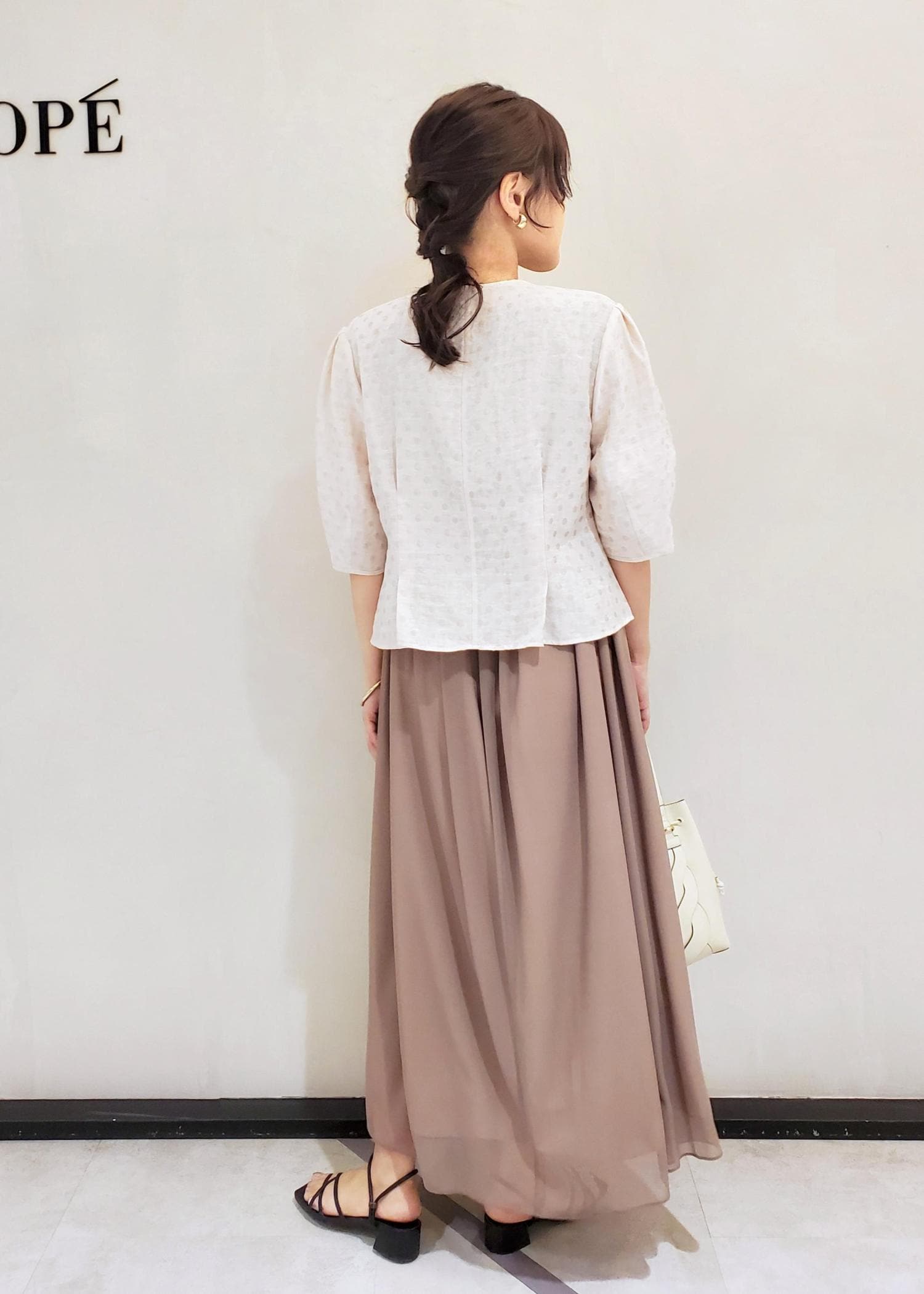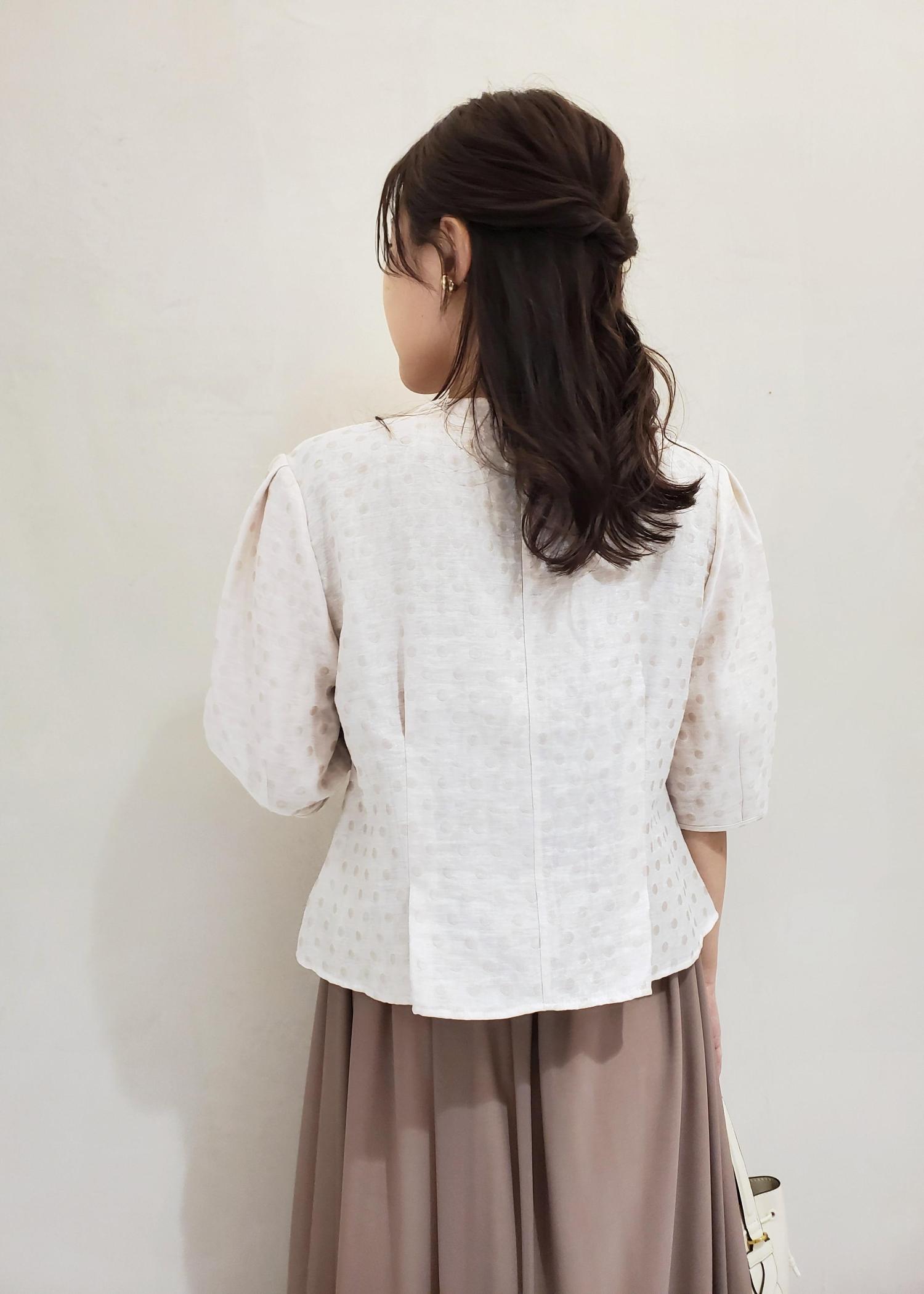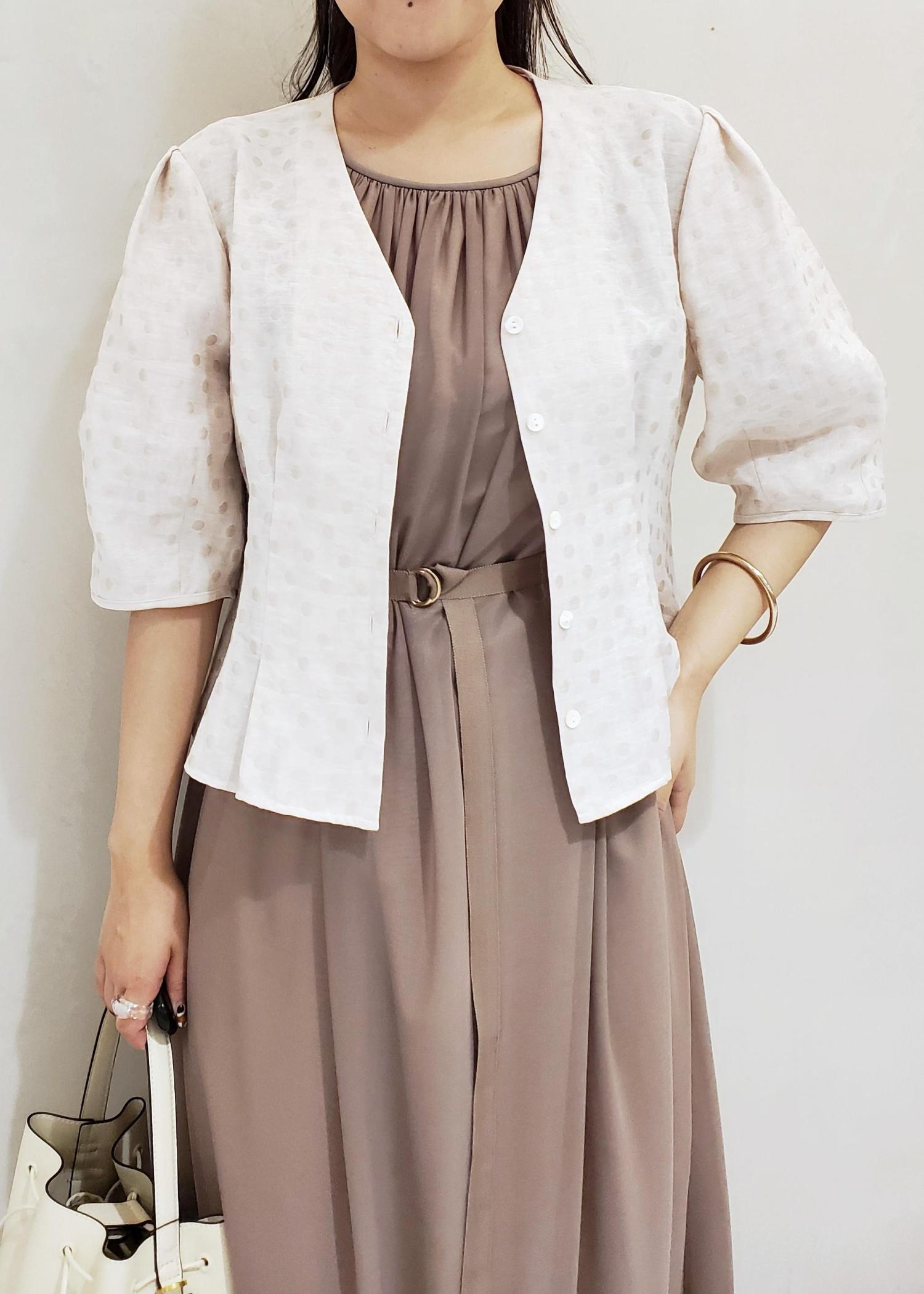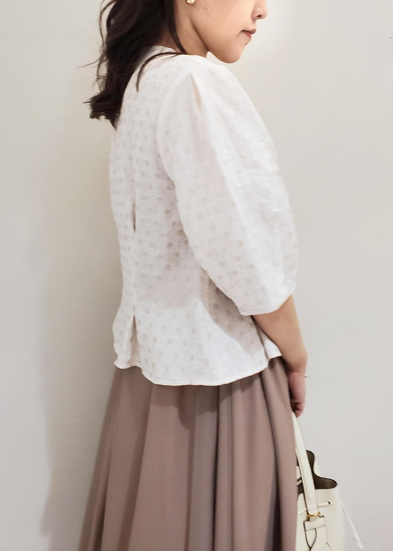 お袖はふんわりとしていてパフスリーブで二の腕のラインを拾いにくく、ウエスト周りは絞られており比較的コンパクトなサイズ感です。