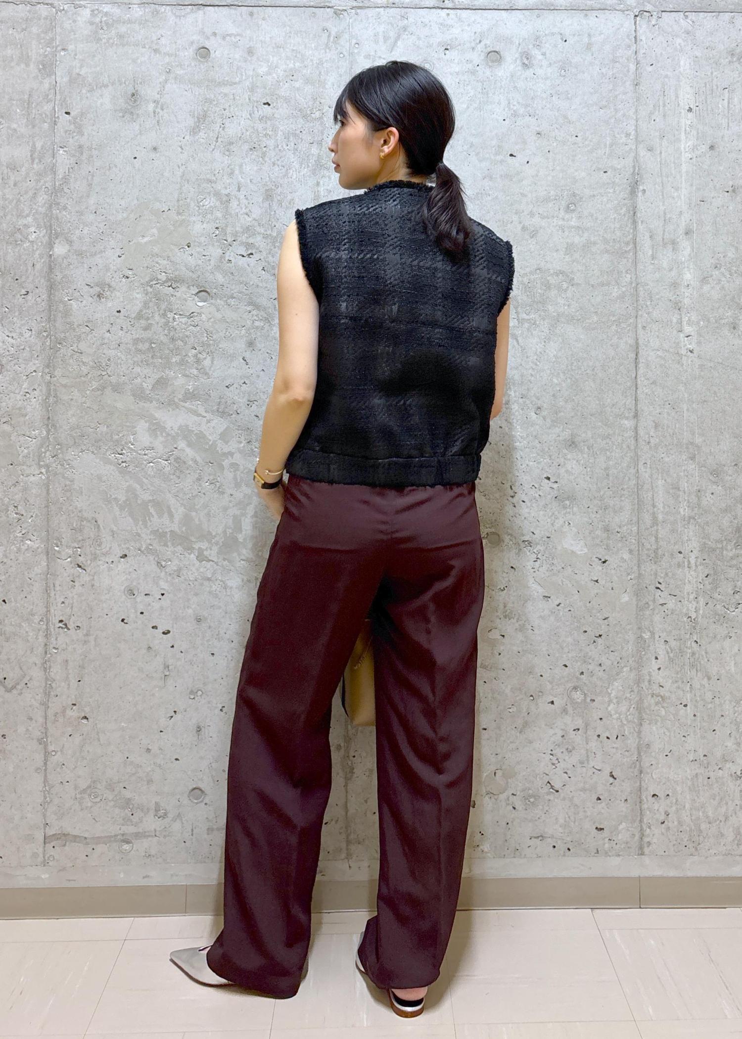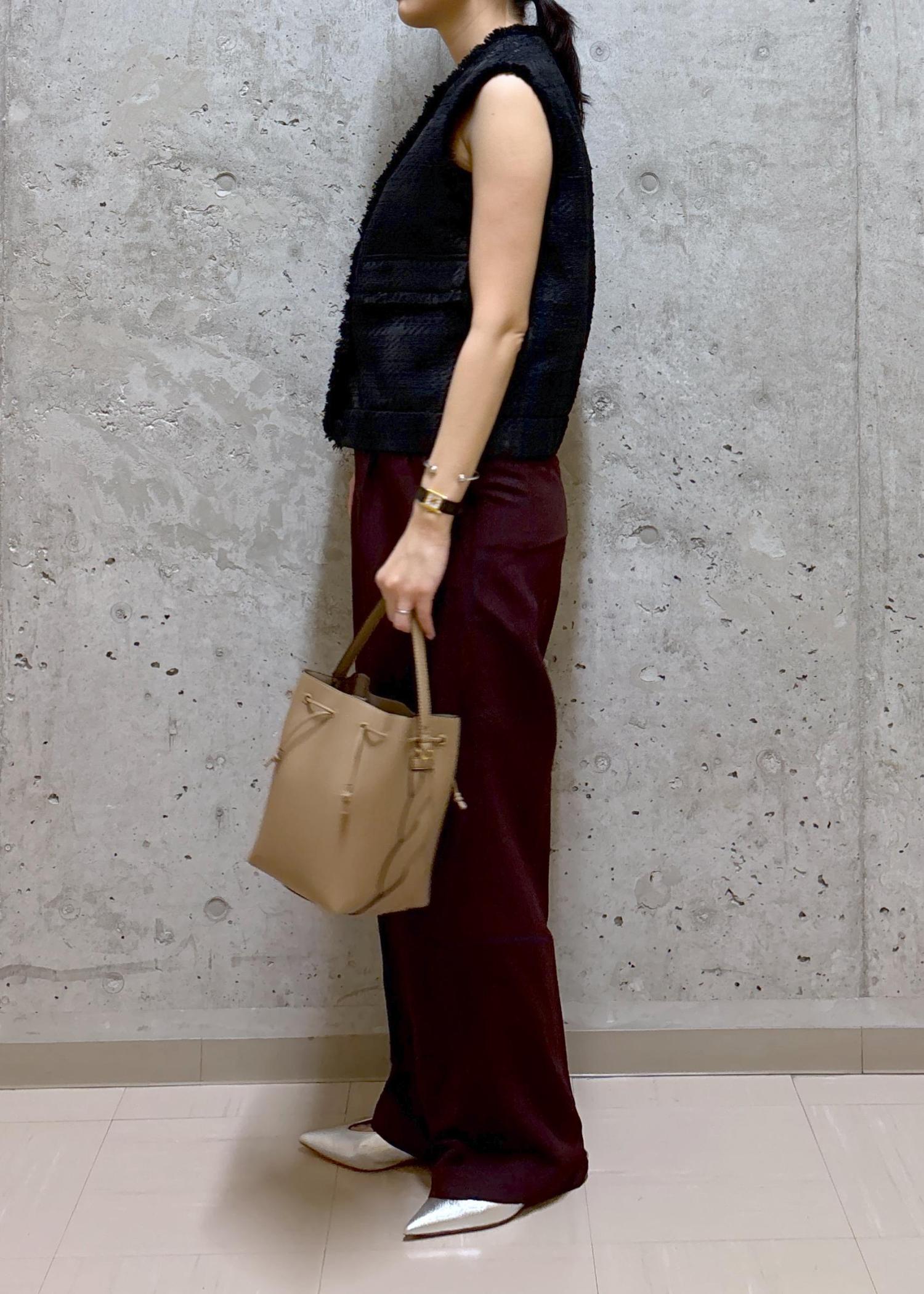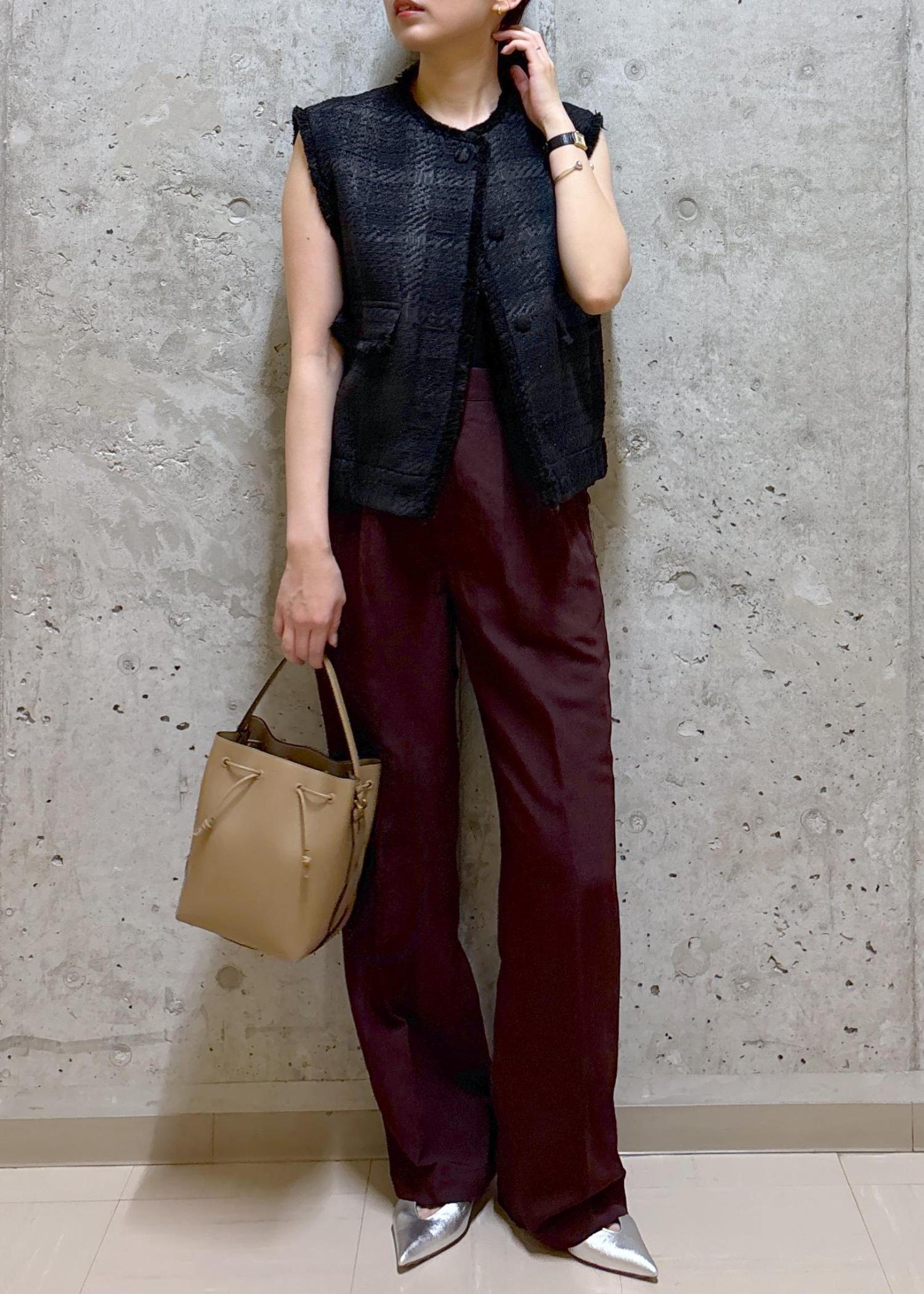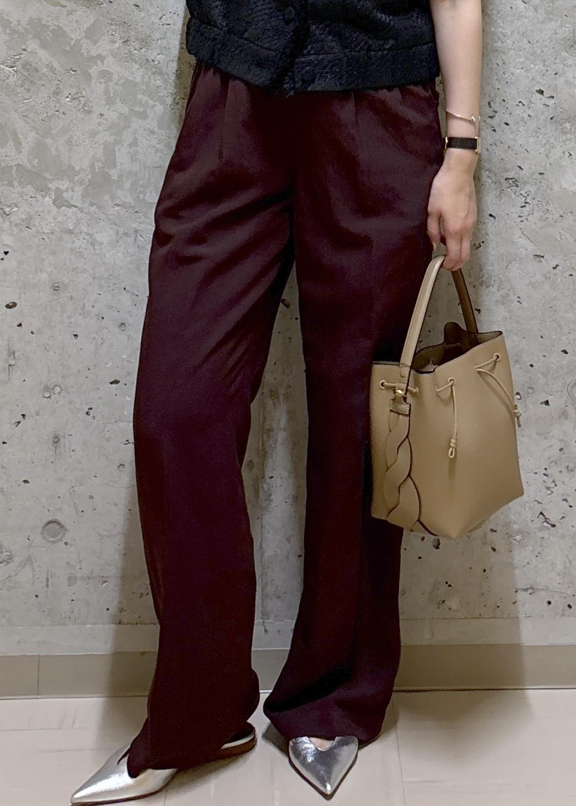 ボルドーのワイドパンツを合わせ、洗練されたモードスタイルに。