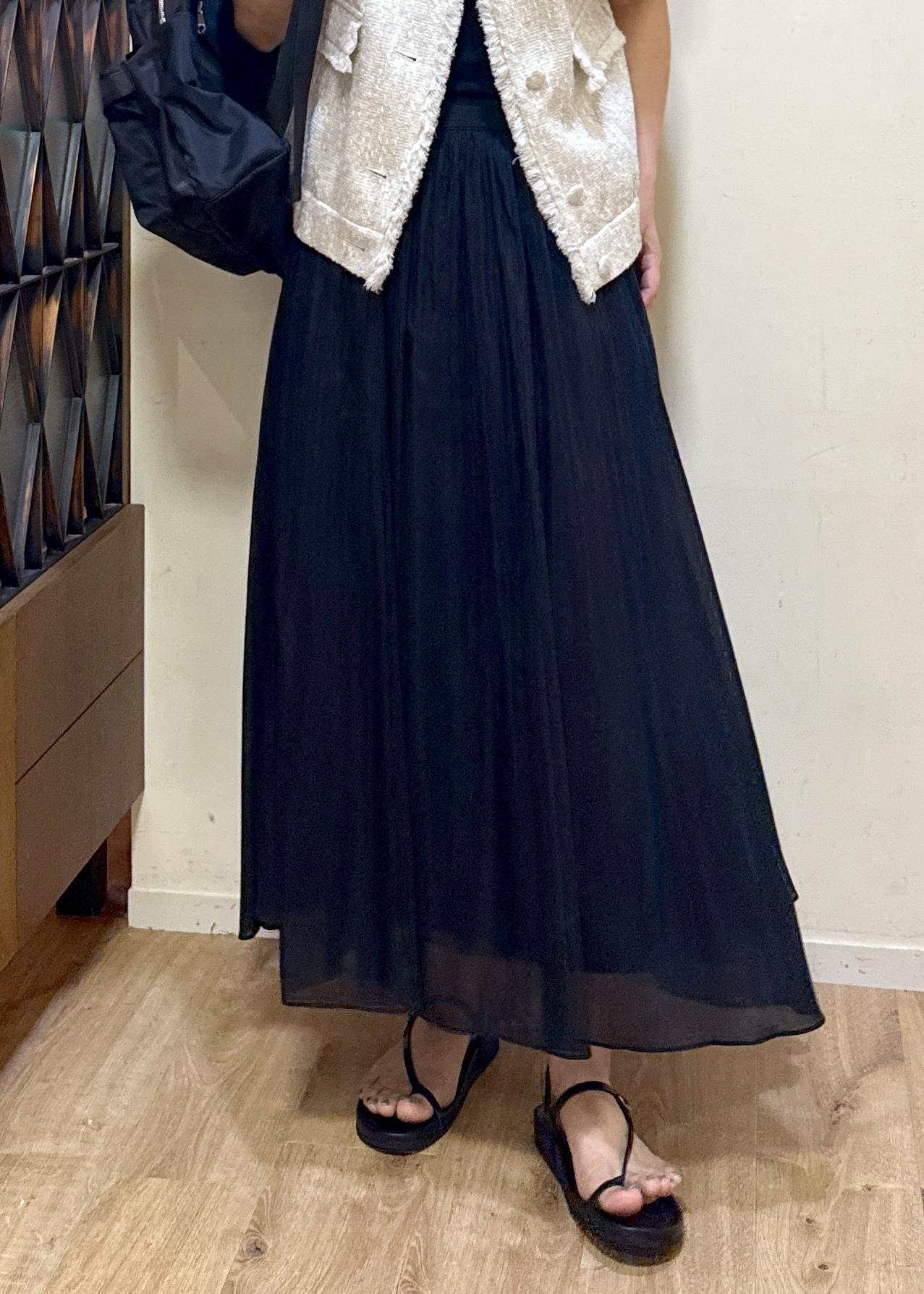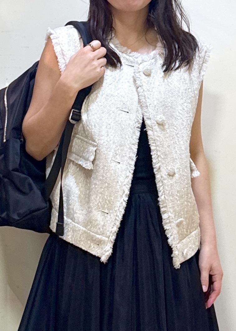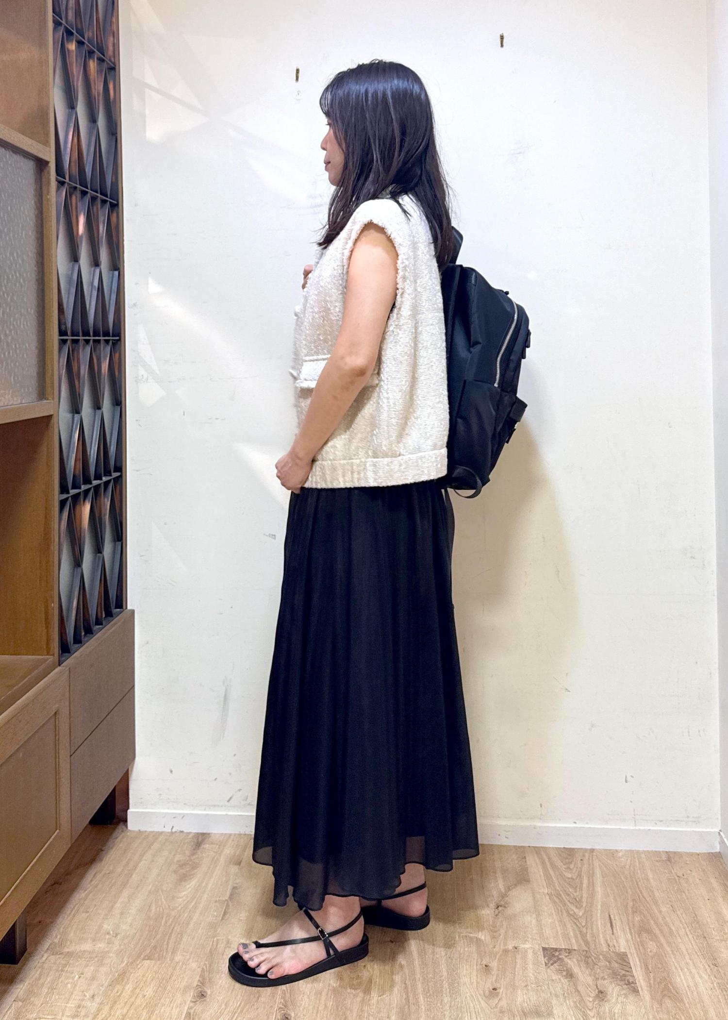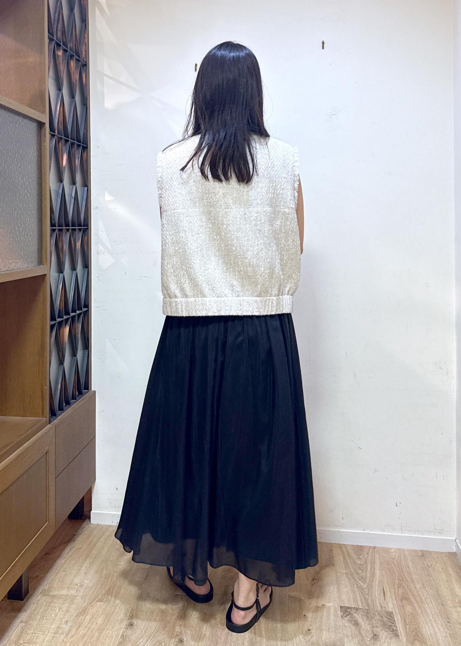 麻混のサマーツイードジレをふんわりスカートとコーディネートしました。