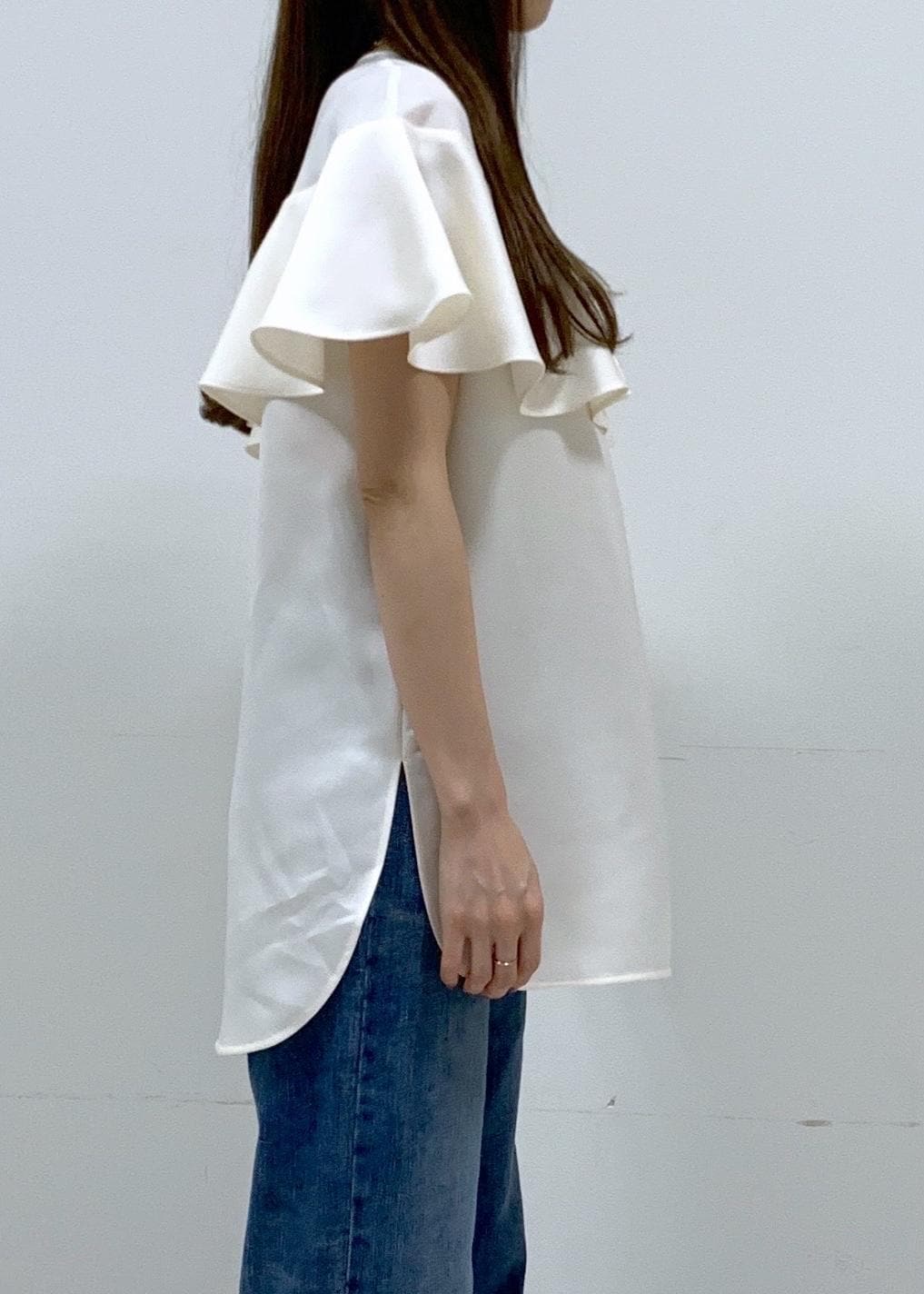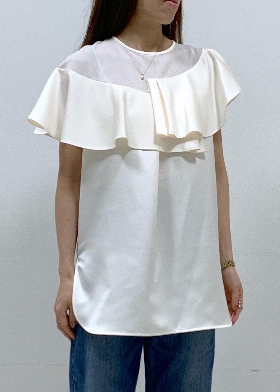 アウトレットROPÉサテンラッフルブラウス/洗えるオフホワイト / F¥12,650レビューデコルテ部分は透け感の有る生地で、ラッフル部分と身頃は適度に張りの有るサテン素材のブラウスです。