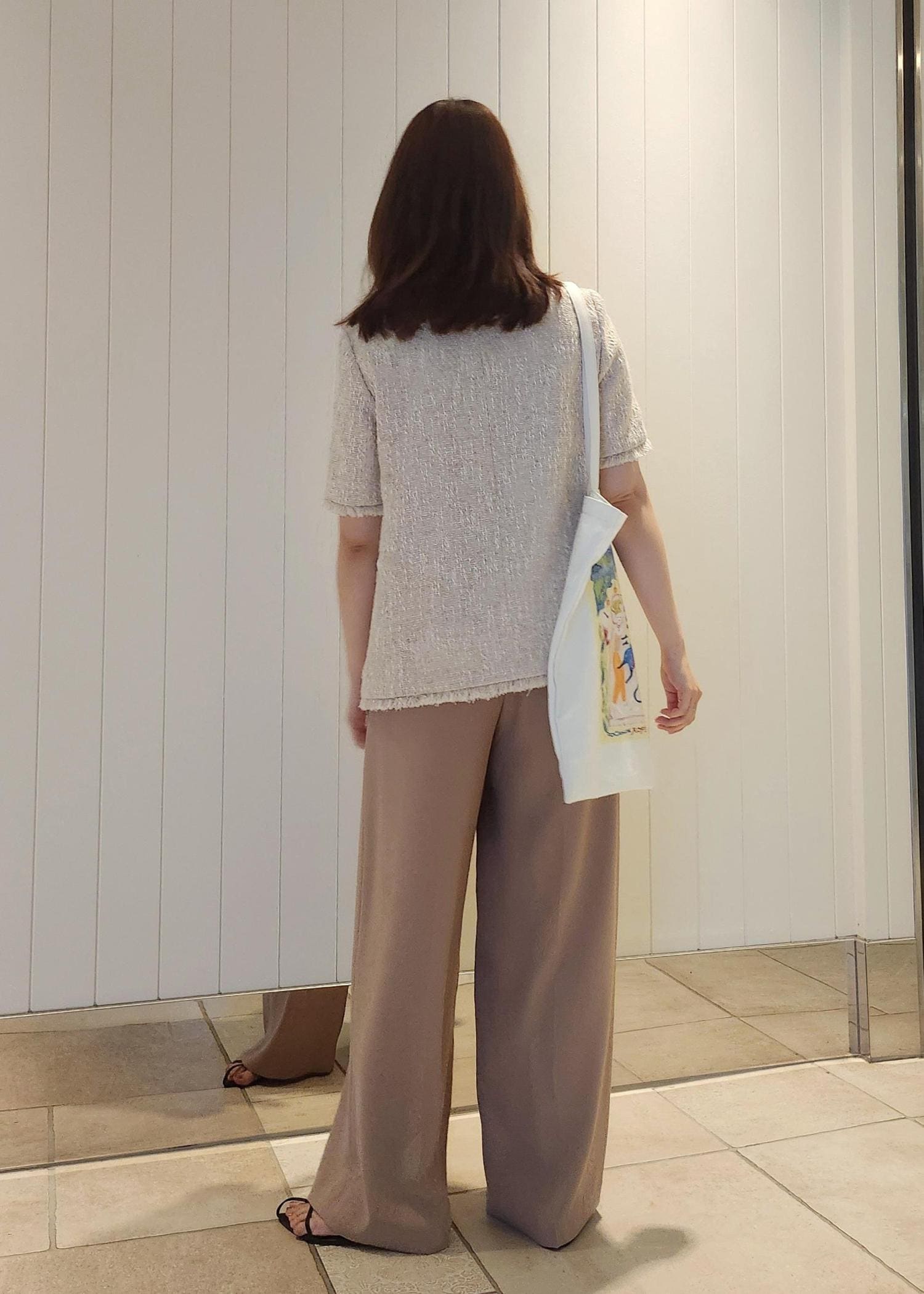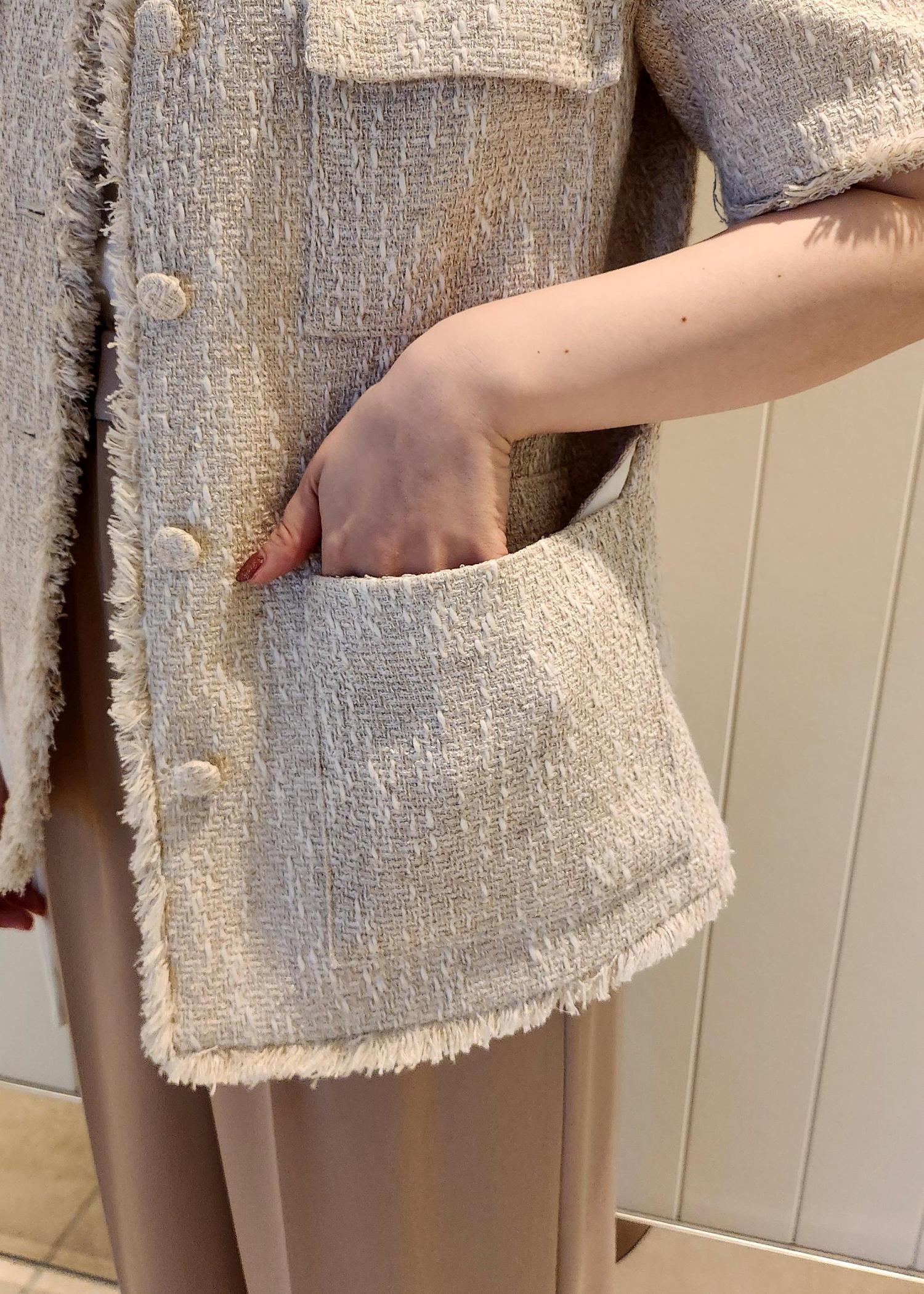 袖丈は肘が少しでる丈感で、麻混なので夏でも着れるツイードです。 -