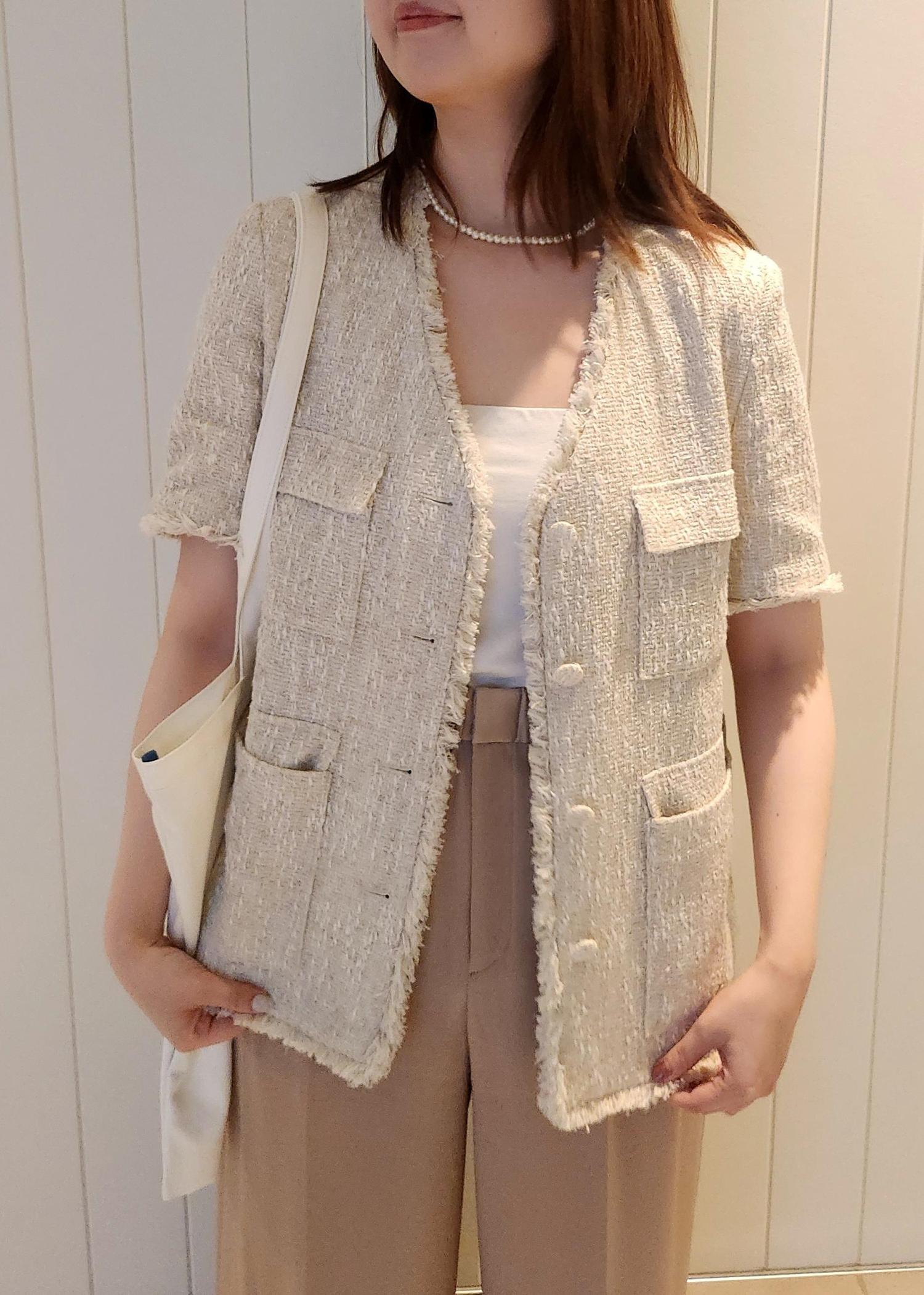 アウトレットROPÉサマーツイードハーフスリーブジャケットオフホワイト / F¥23,100レビューVネックで首回りがスッキリしているので着ぶくれせず着用できます◎
