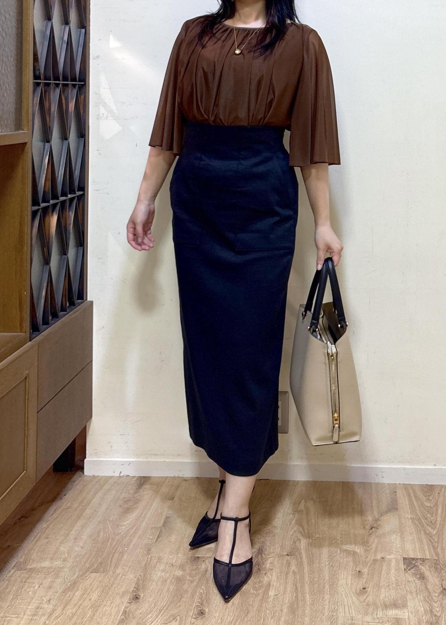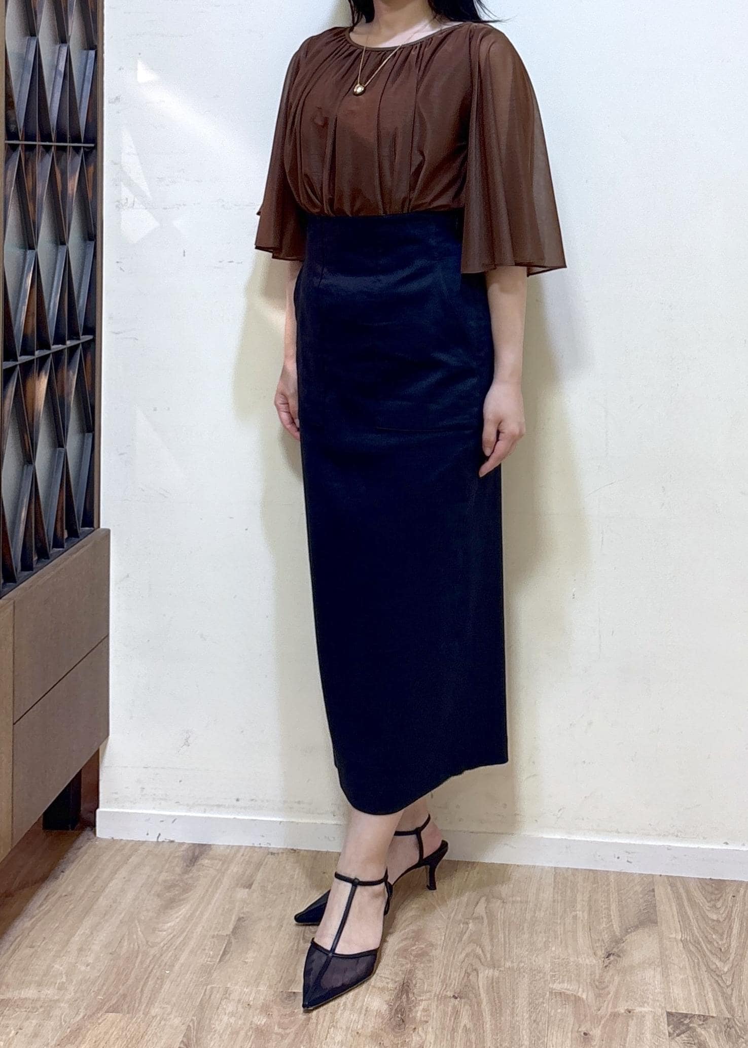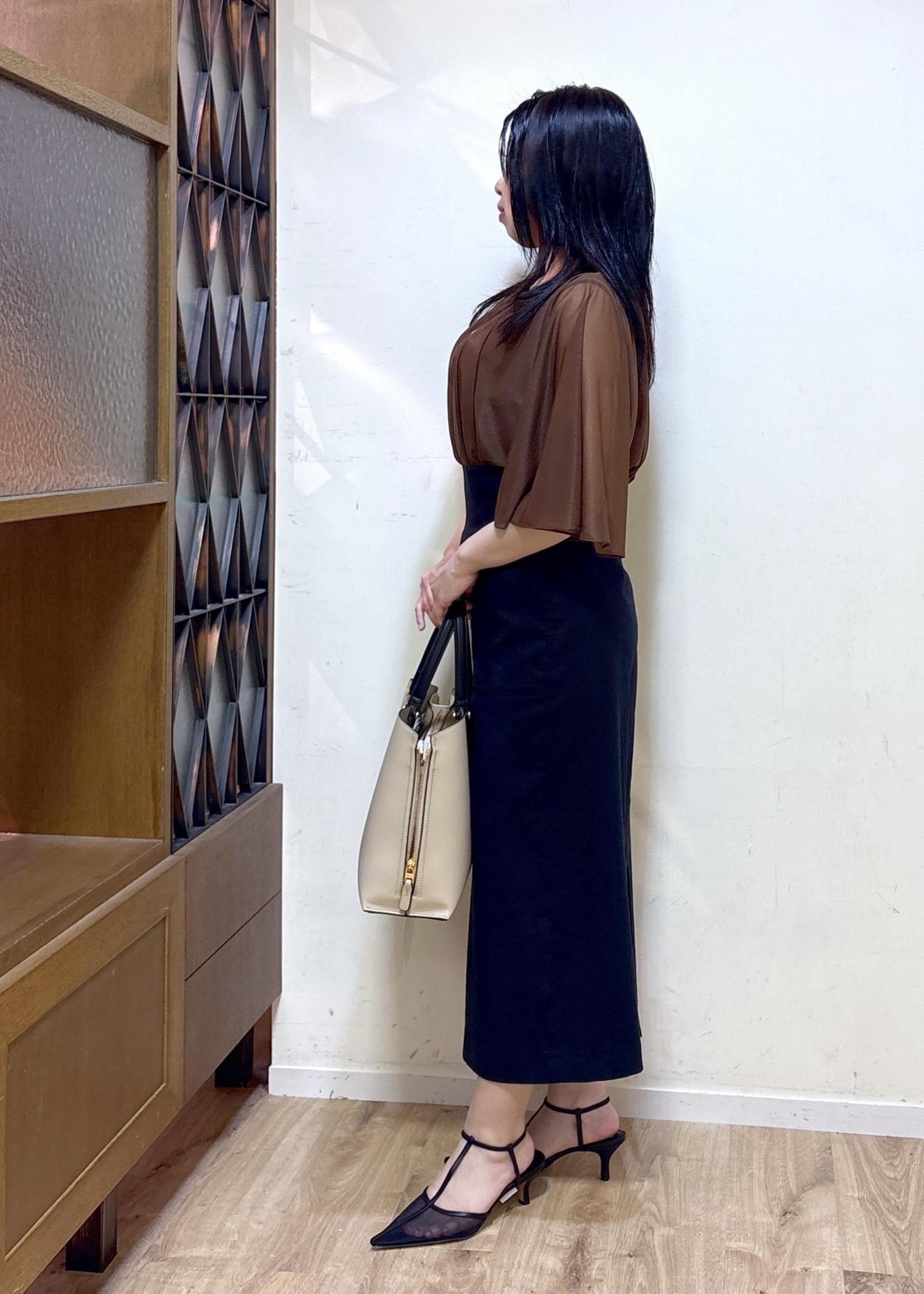 着丈は私の身長で足首が見えるほどで、後ろのスリットは膝裏あたりと深くないので品よく見えます。 -