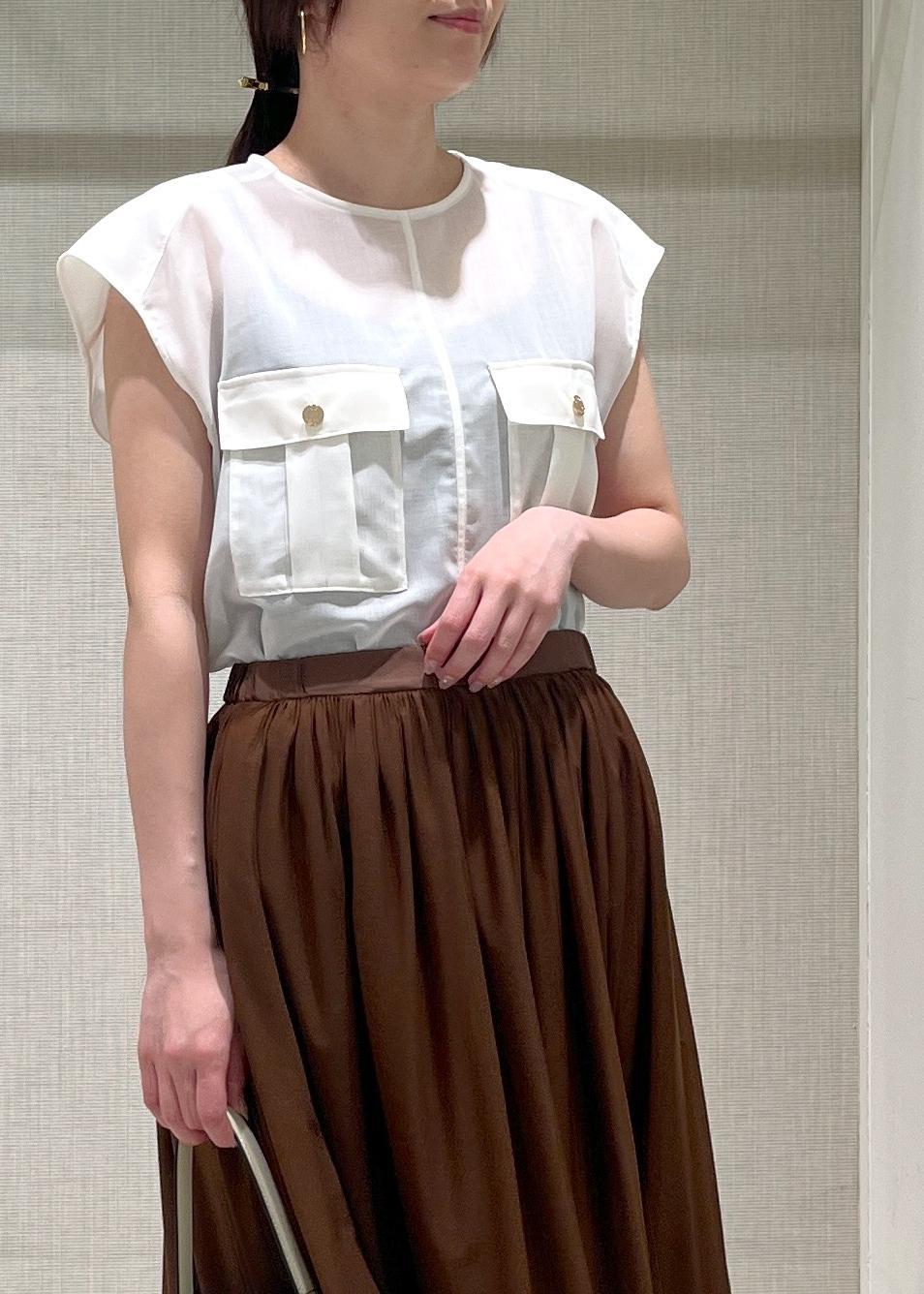 サラッとした着心地のシアー素材とゴールド釦が引き立つ、クルーネックのノースリーブブラウスは夏におすすめの1枚です!フレンチスリーブで二の腕も程良くカバーできるのが嬉しいポイントです♪