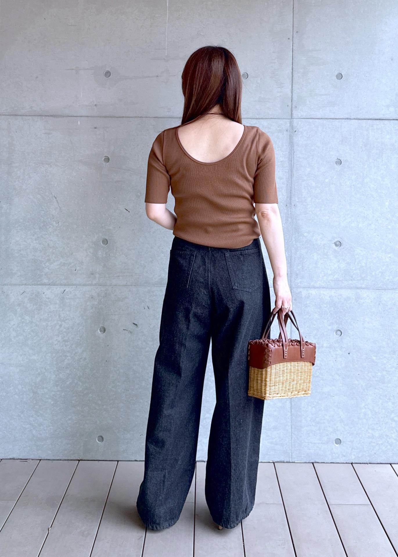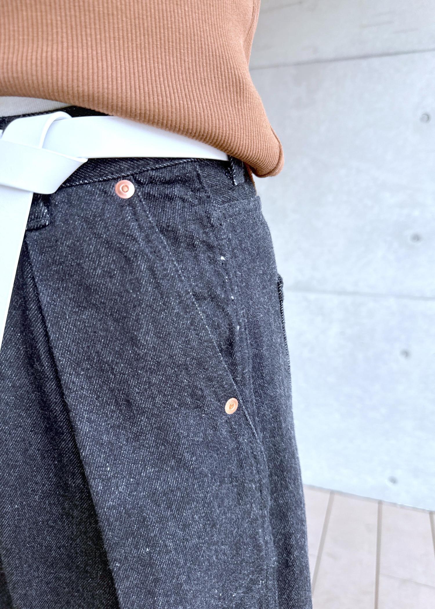 ウエストにタックがしっかり入っているデザイン性が通常のデニムよりおしゃれに見せてくれるのでシンプルにTシャツと合わせても様になります。