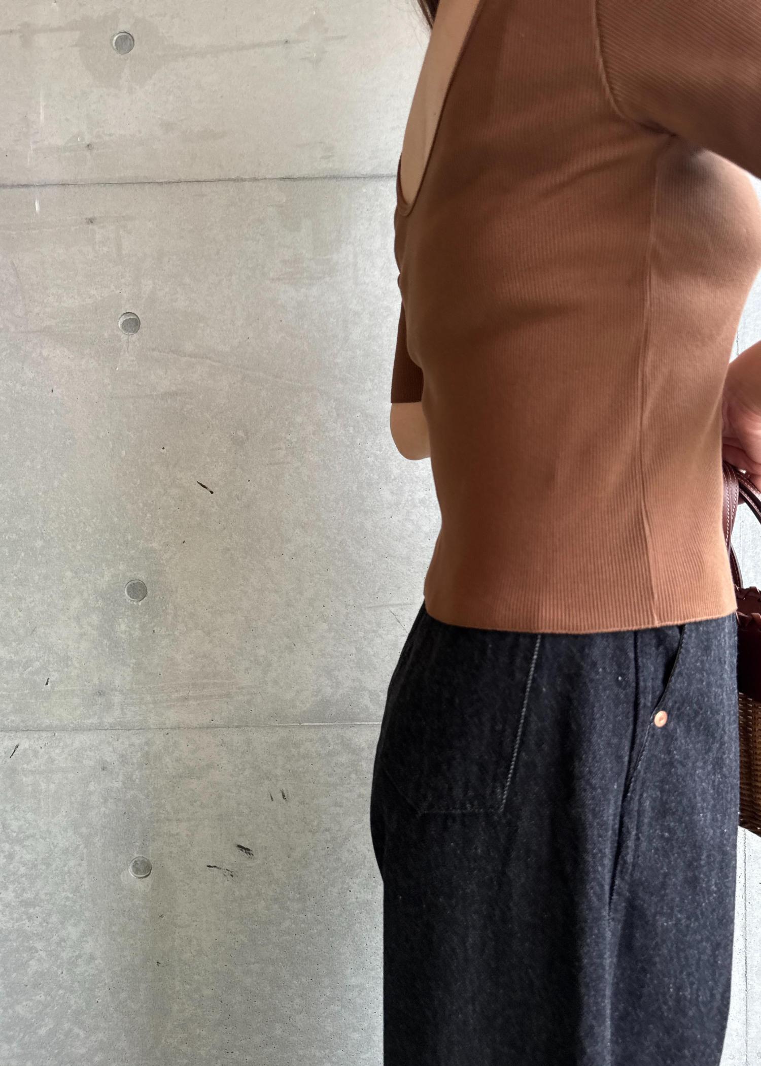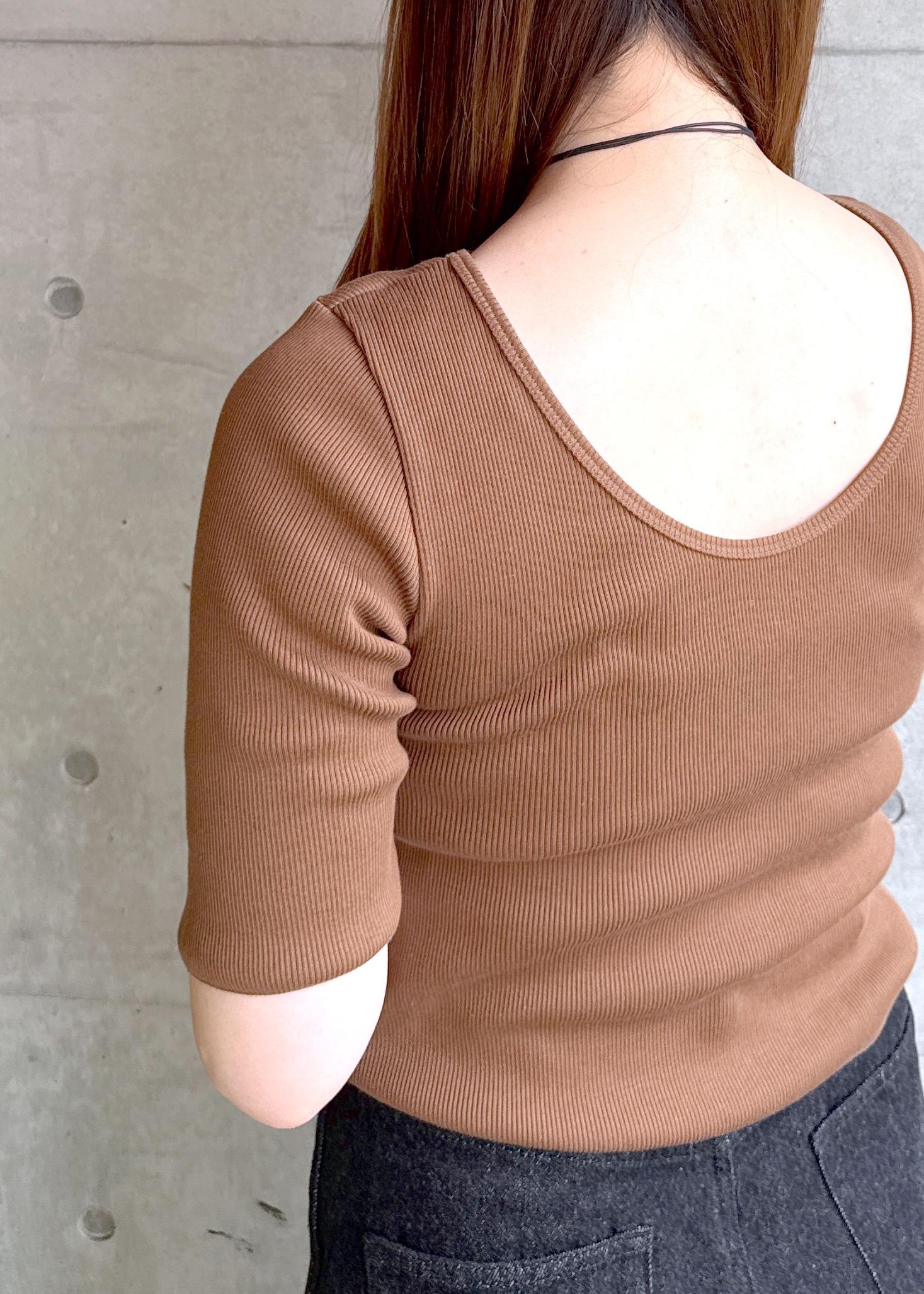 アウトレットROPÉ【洗える】テレコ5分袖ニットプルオーバーブラウン / F¥8,250レビュー着丈はボトムのボタンにかぶるくらいのやや短め丈です。