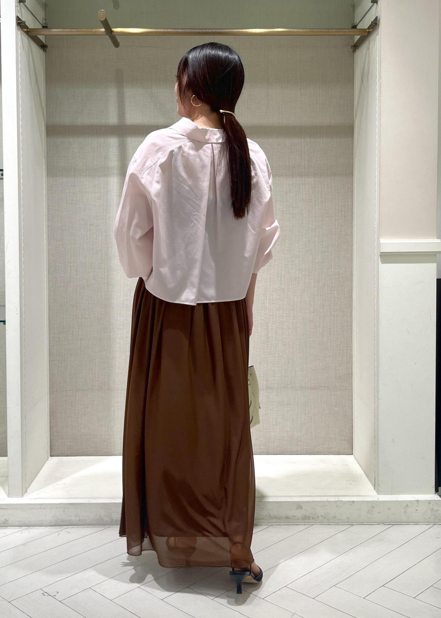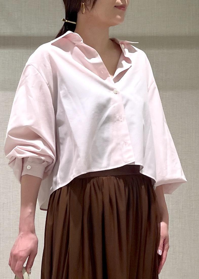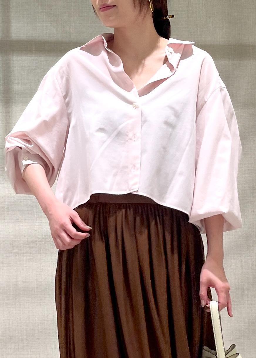 タック袖のボリューム感がこなれた印象の、羽織りにもなる今季トレンドのクロップド丈シャツコーデ♪