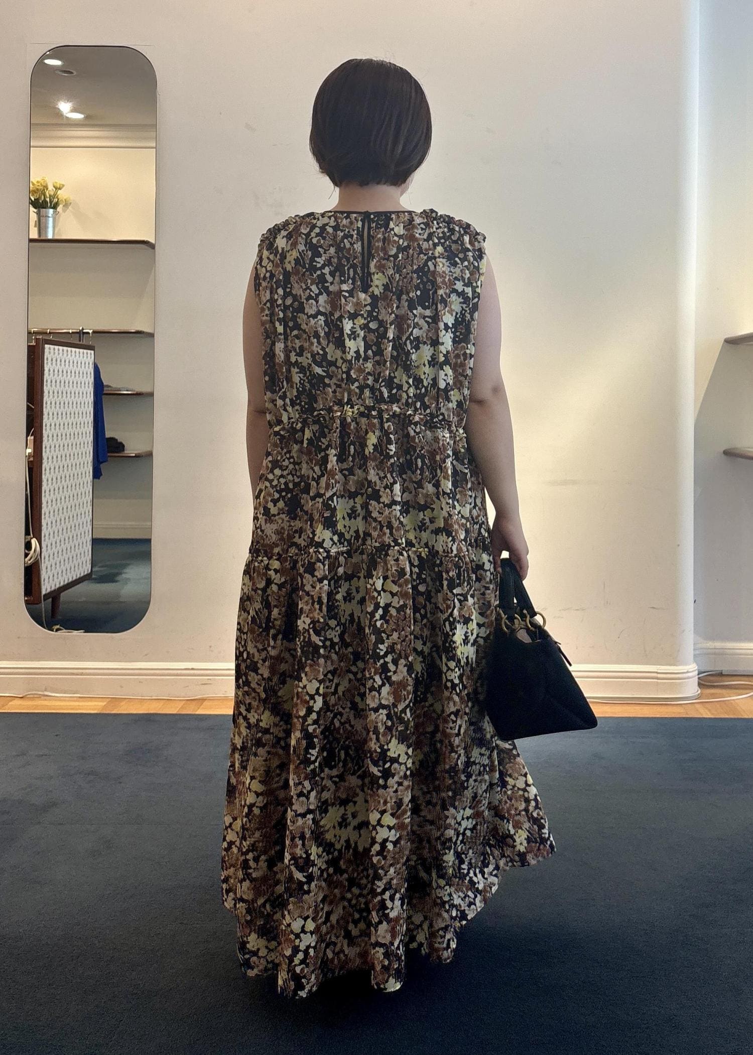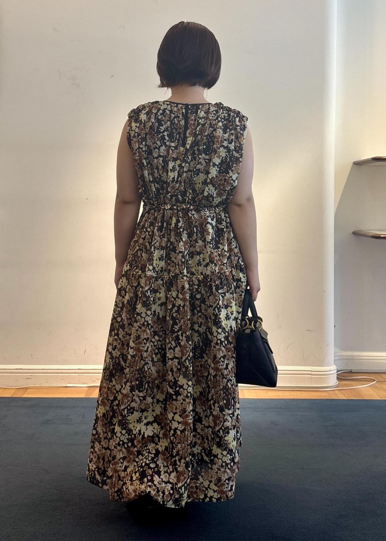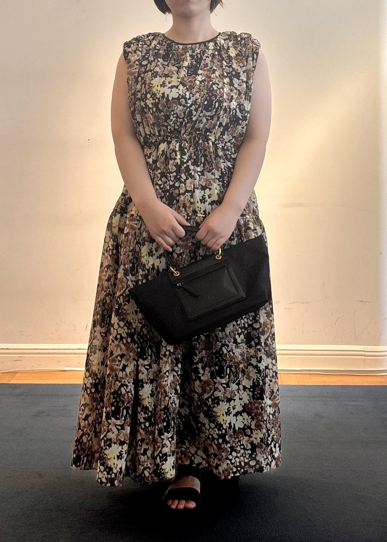 アウトレットROPÉフェイディドフラワープリント・無地ドレス/洗えるダークブラウン / F¥17,600レビュー中でウエストが絞れるワンピースになっていて、絞るとスカートが広がりがありボリューム感UP!