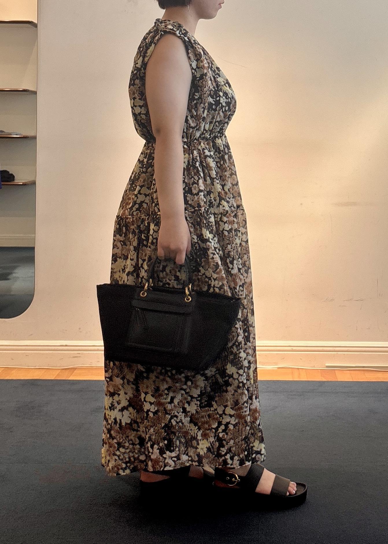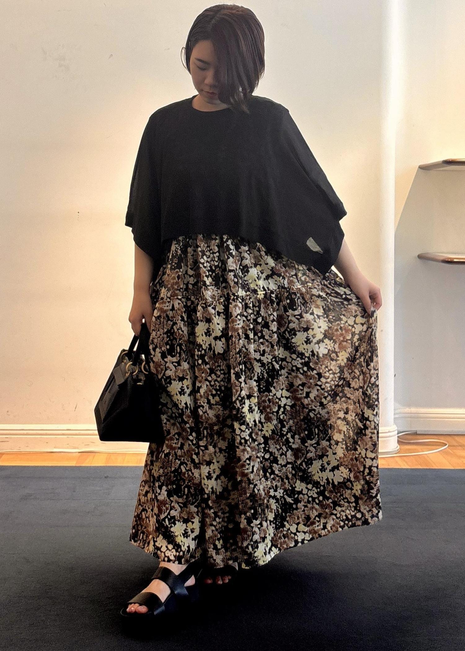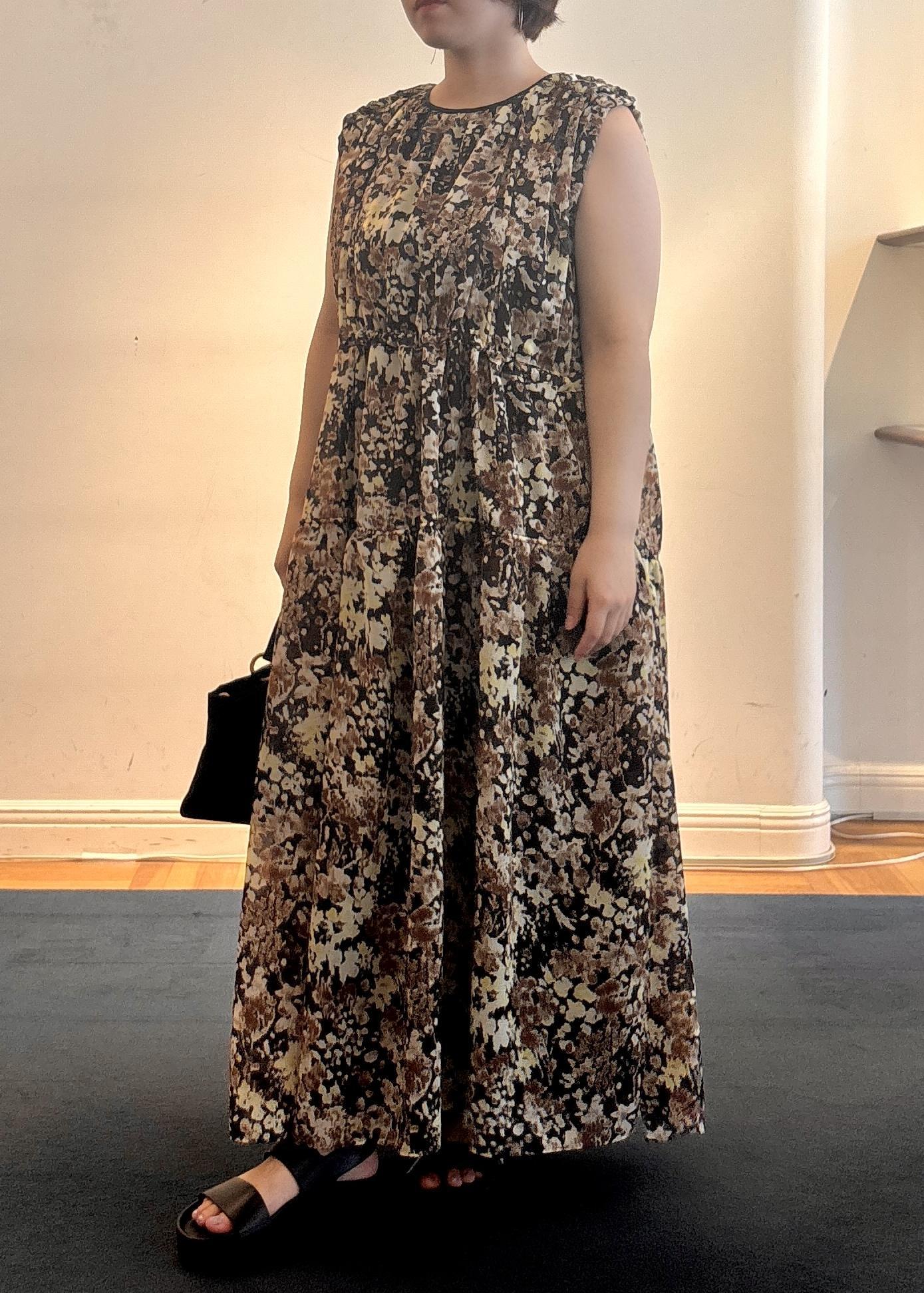 アウトレットROPÉフェイディドフラワープリント・無地ドレス/洗えるダークブラウン / F¥17,600レビュー中でウエストが絞れるワンピースになっていて、絞るとスカートが広がりがありボリューム感UP!