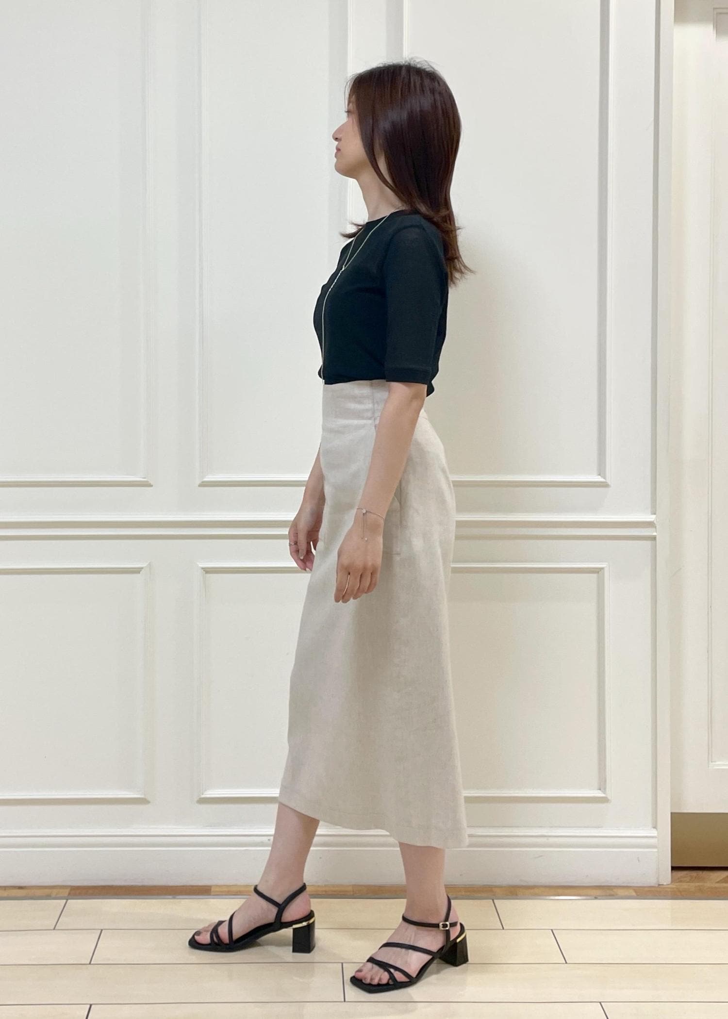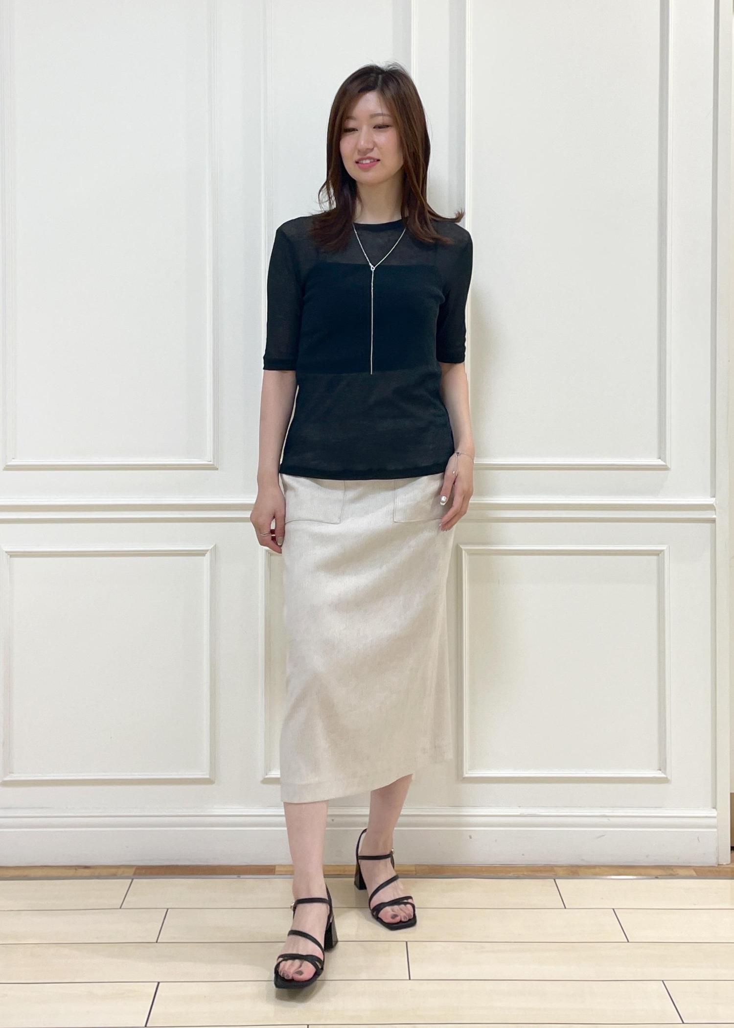 シャツインとアウト、どちらの着こなしも上手くいく万能スカートです◎ -