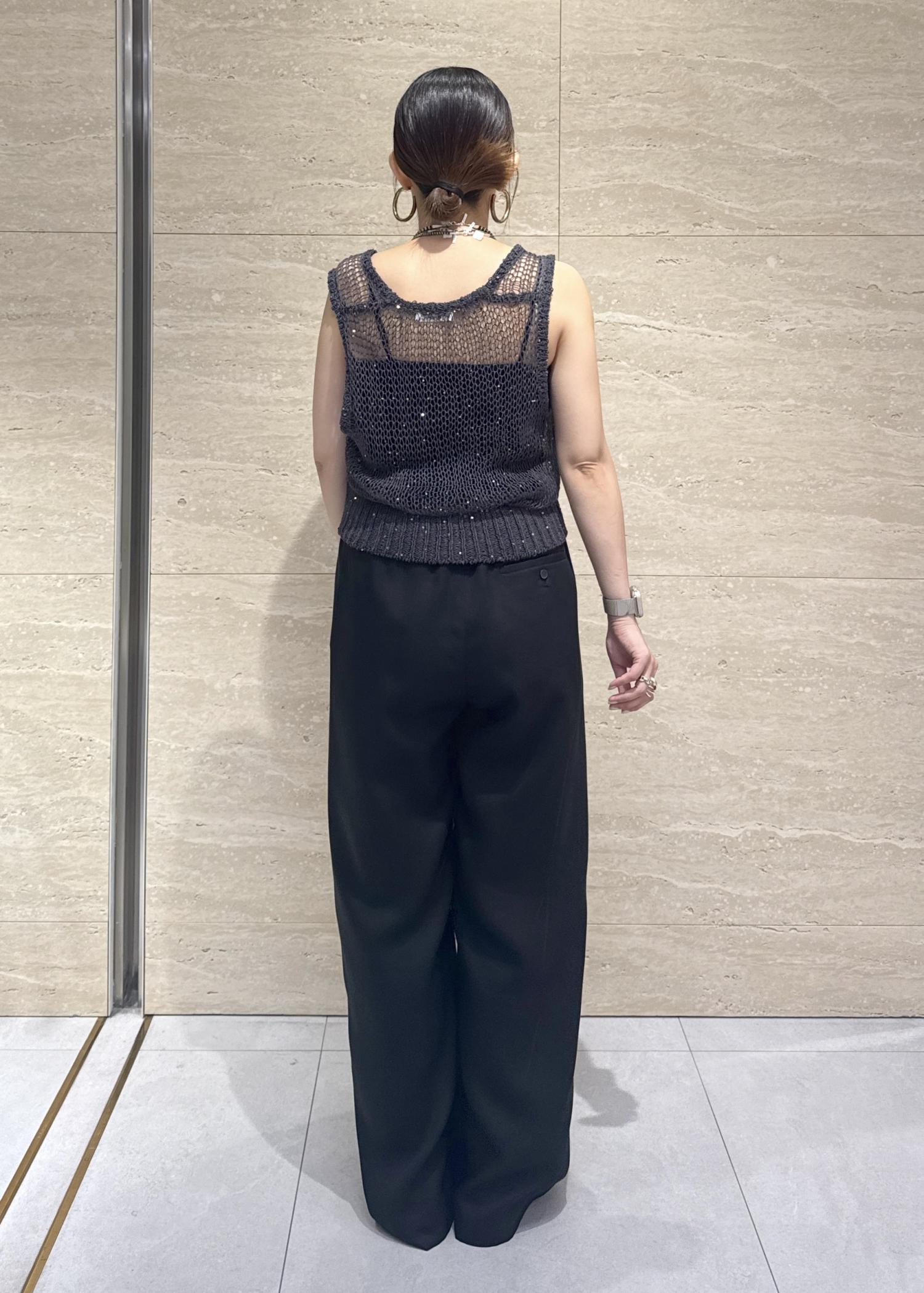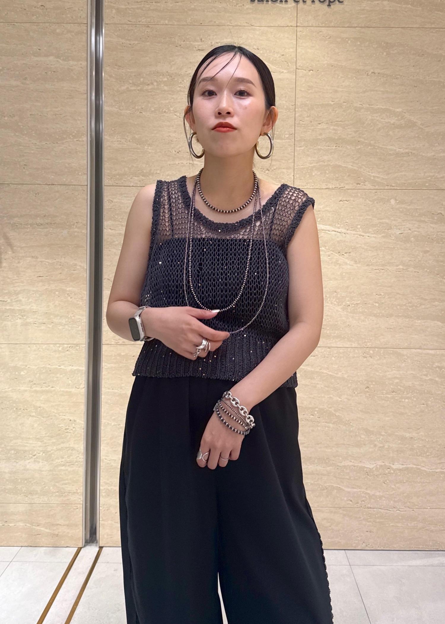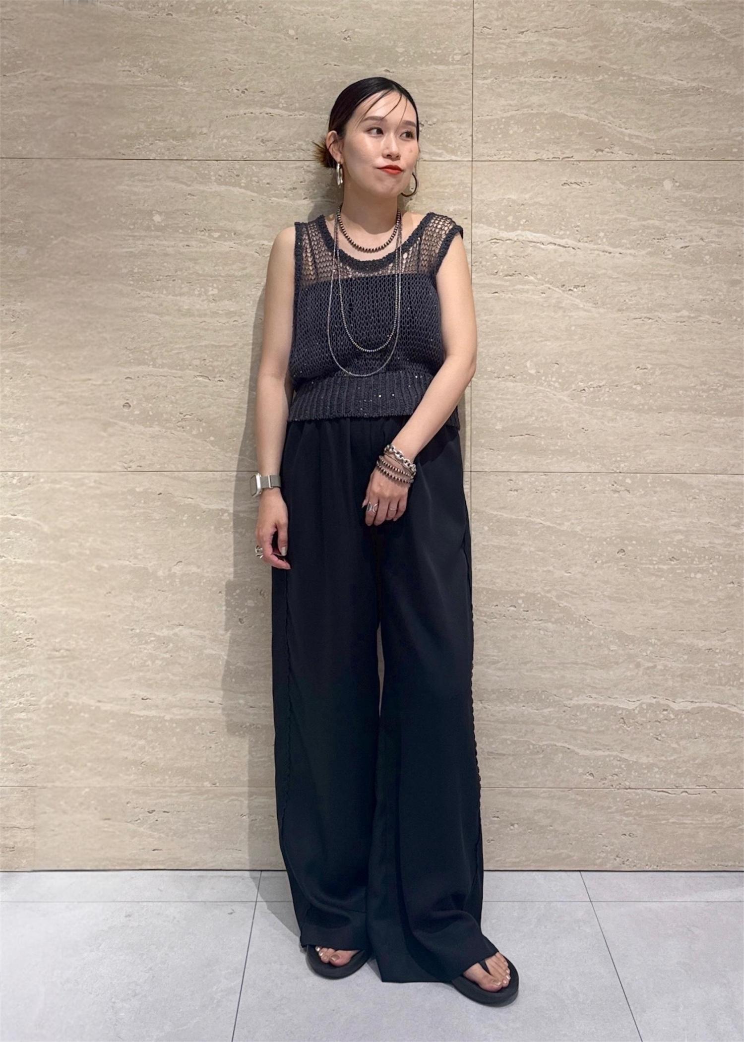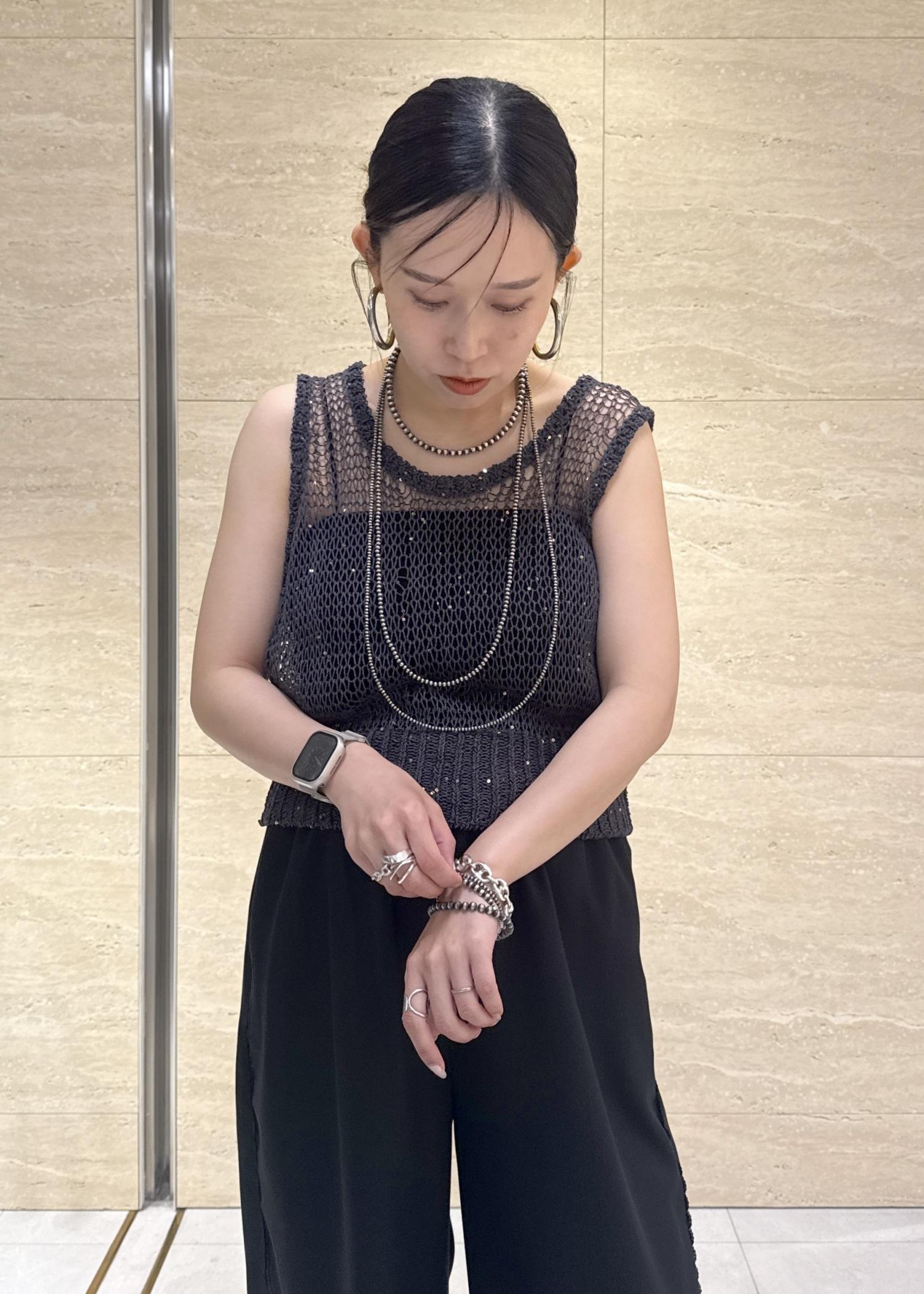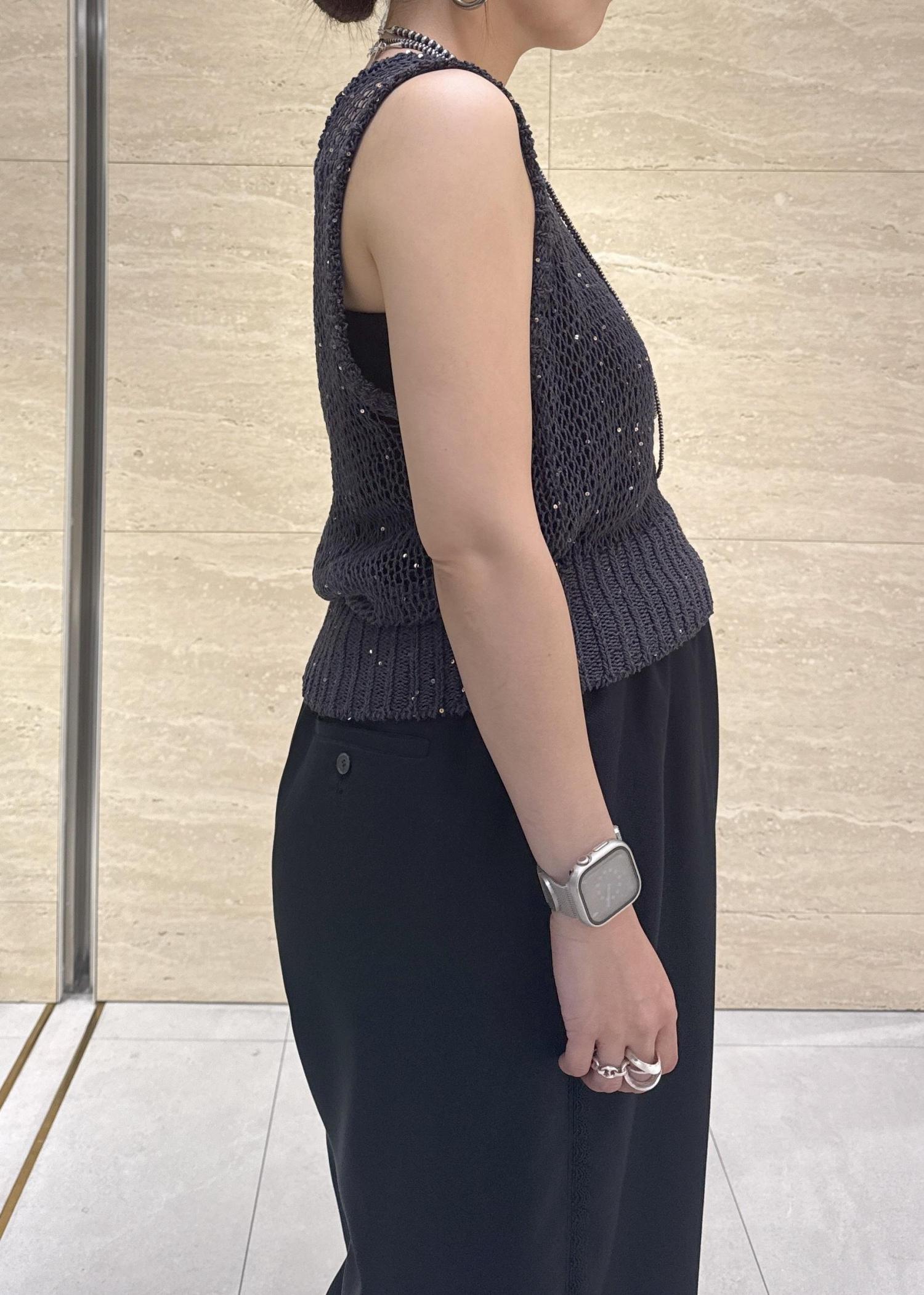 ざっくりとした編み目で、インナーで印象を変えたり、肌見せを楽しめます。