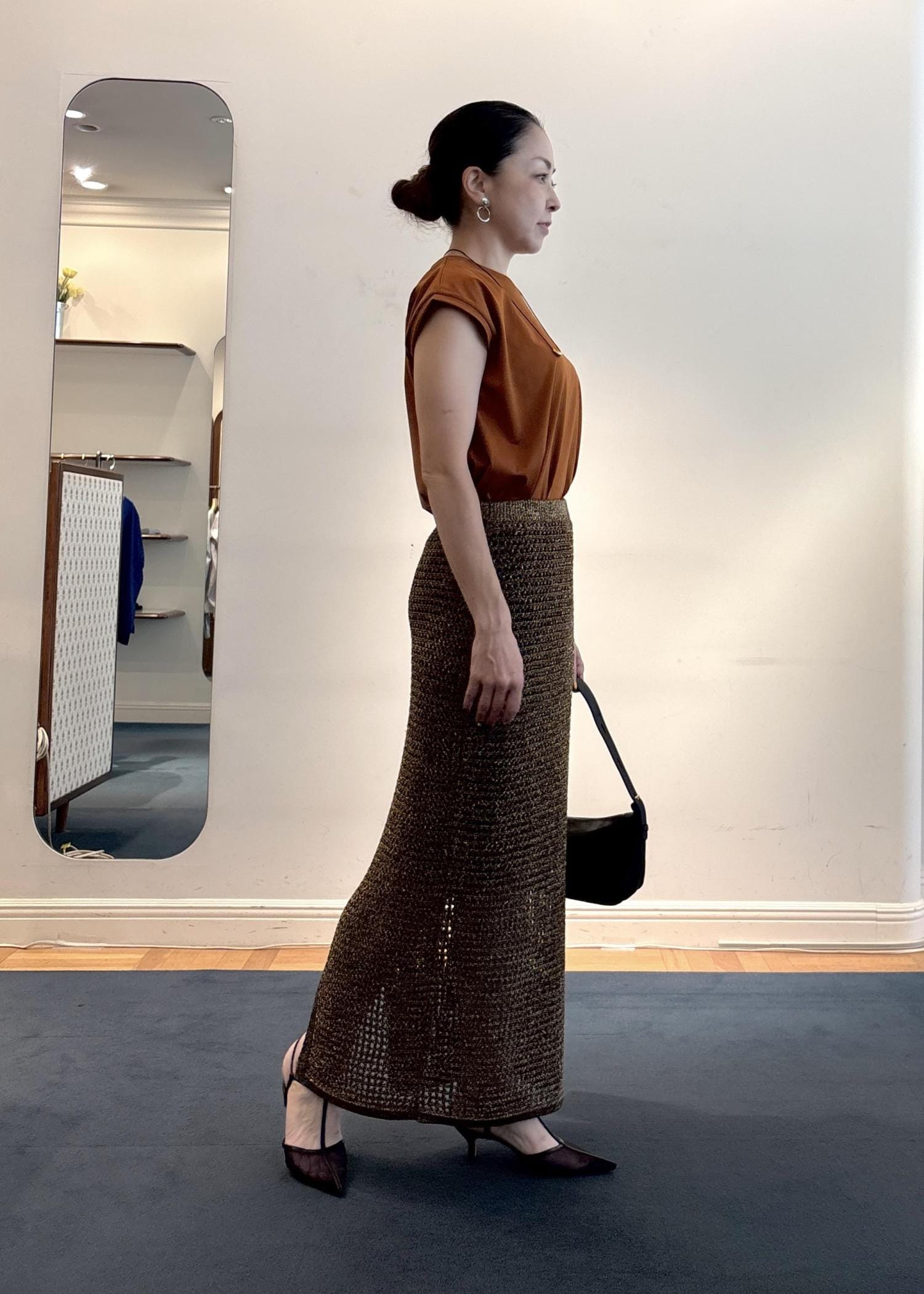 インパクトのあるラメスカートを合わせて女子会などにいかがですか?