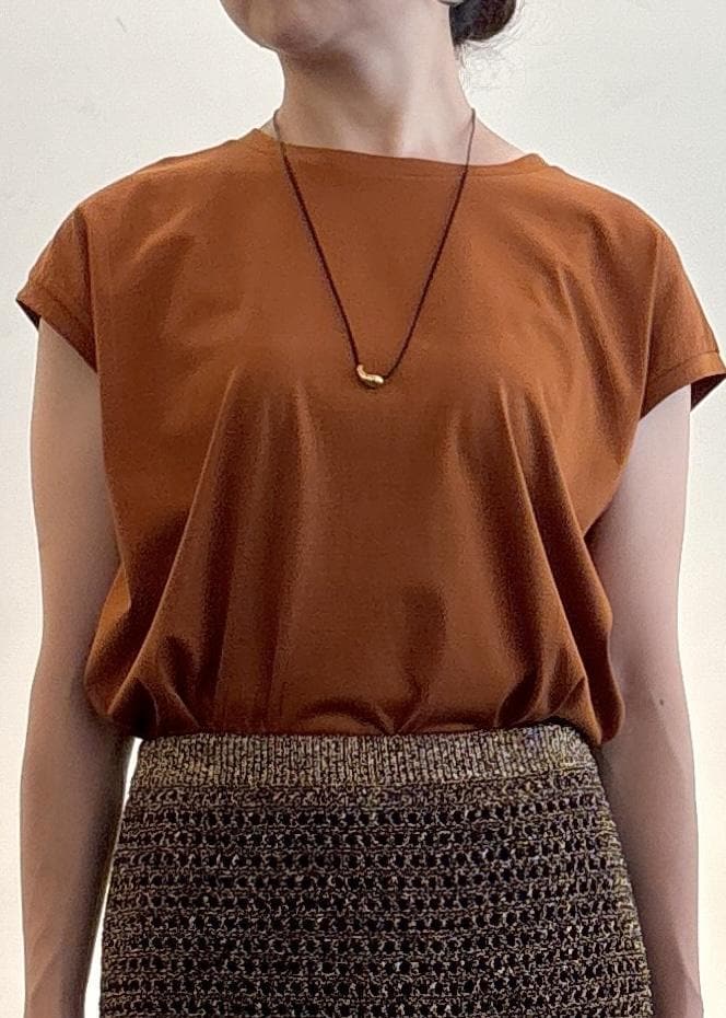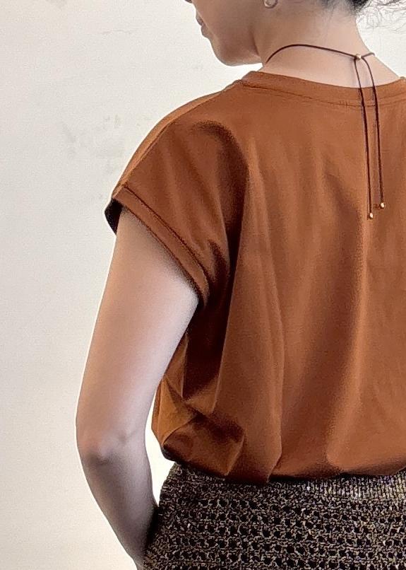 テラコッタカラーはシンプルなTシャツでも着映えするので、ボトムを替えてオンにもオフにも着回せます。