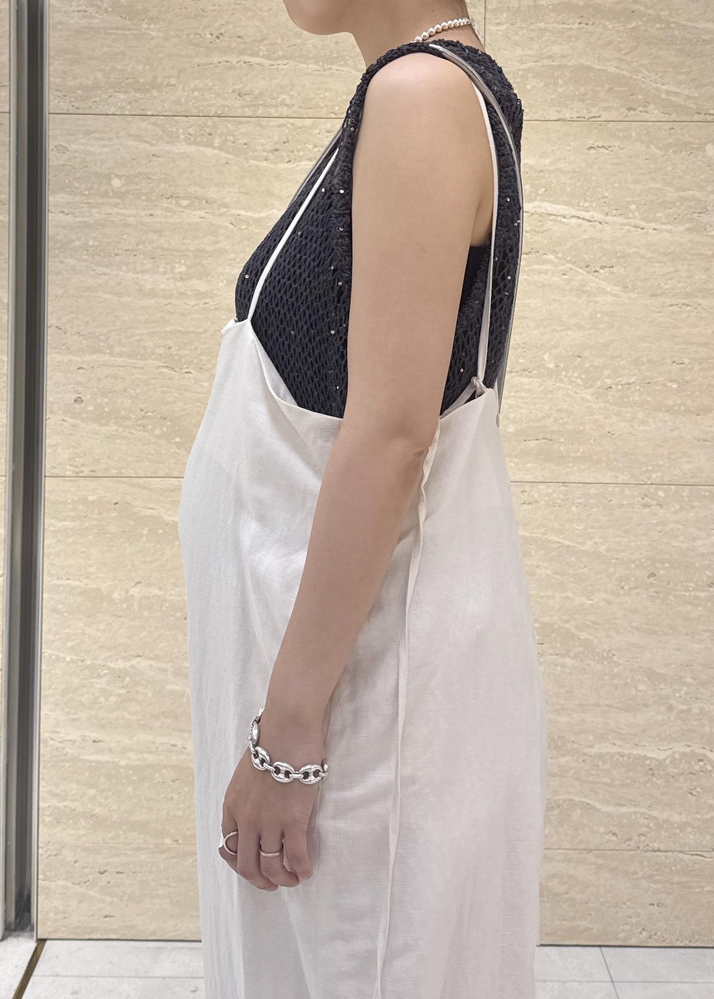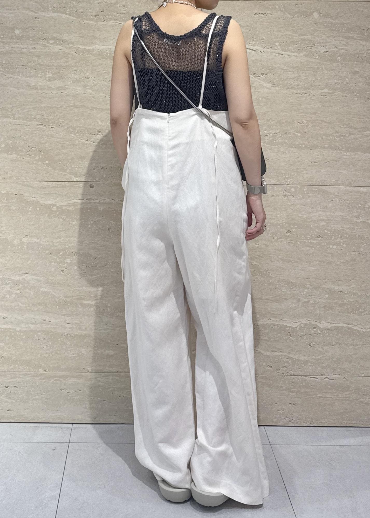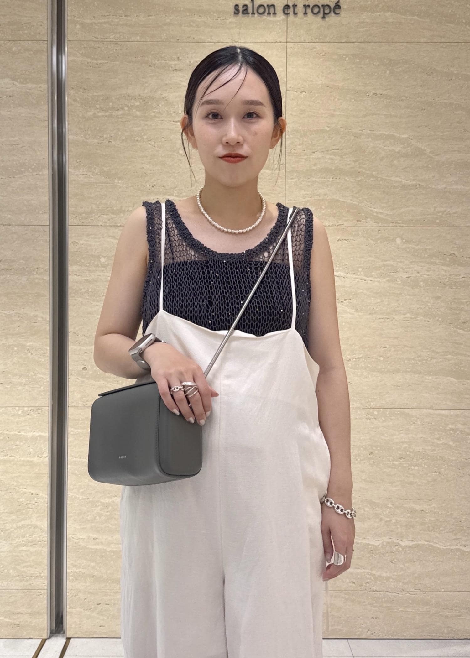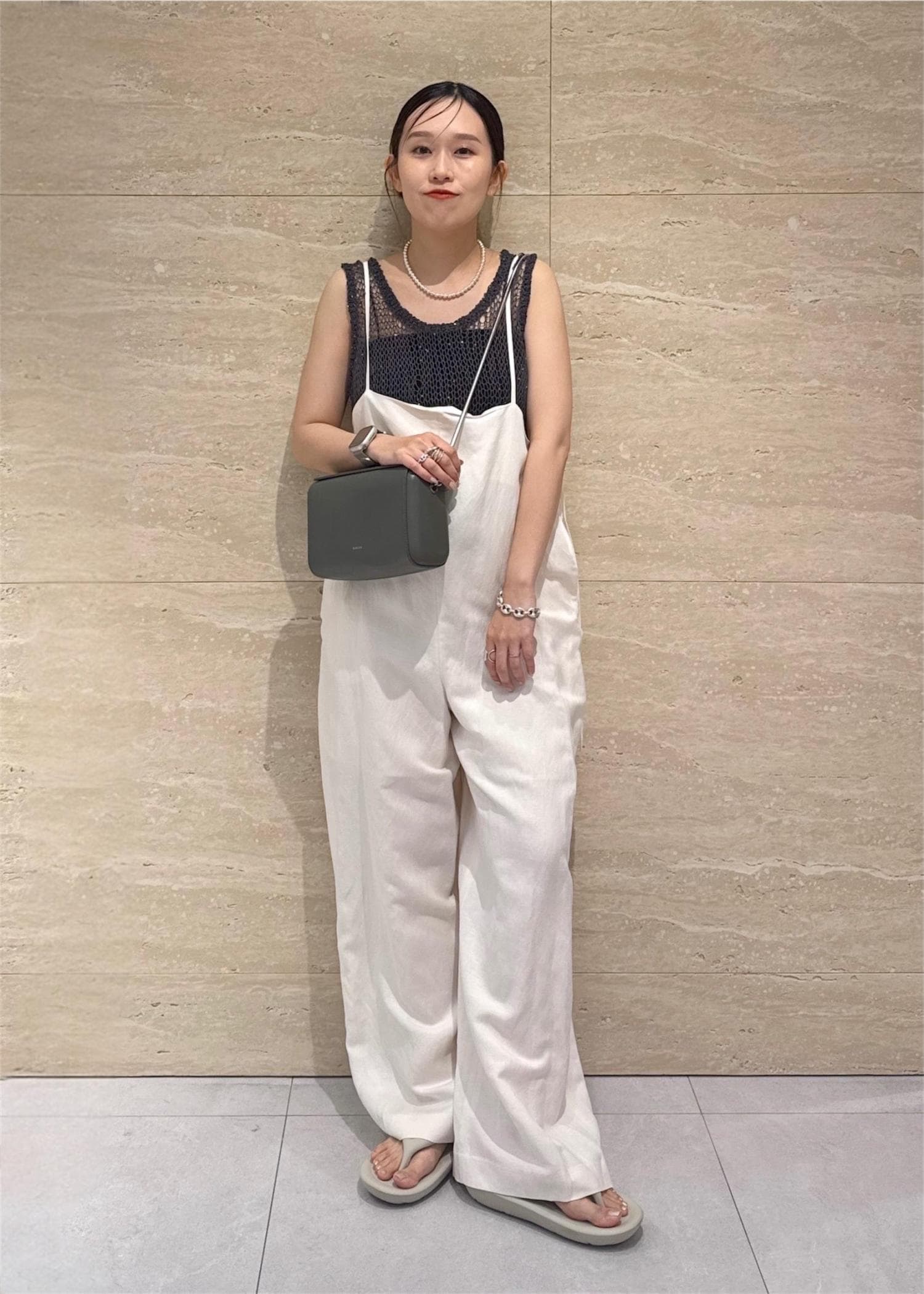 子供っぽくなりがちなサロペットを、肌見せのインナーと合わせ、大人っぽい抜け感を演出。