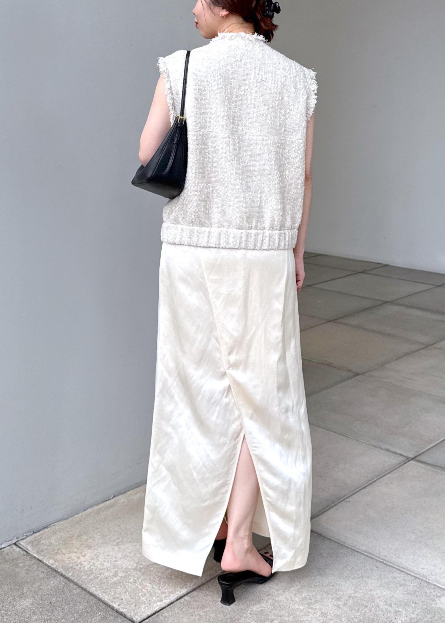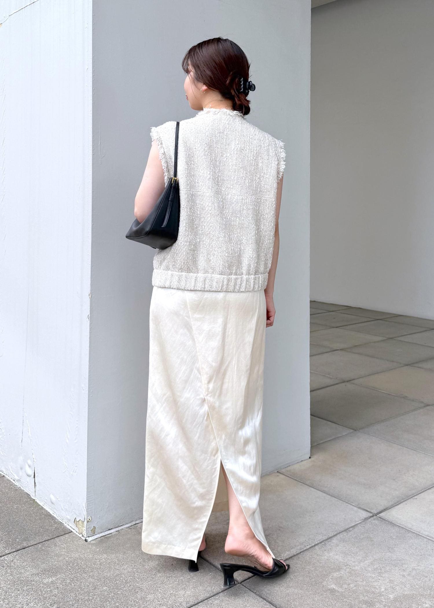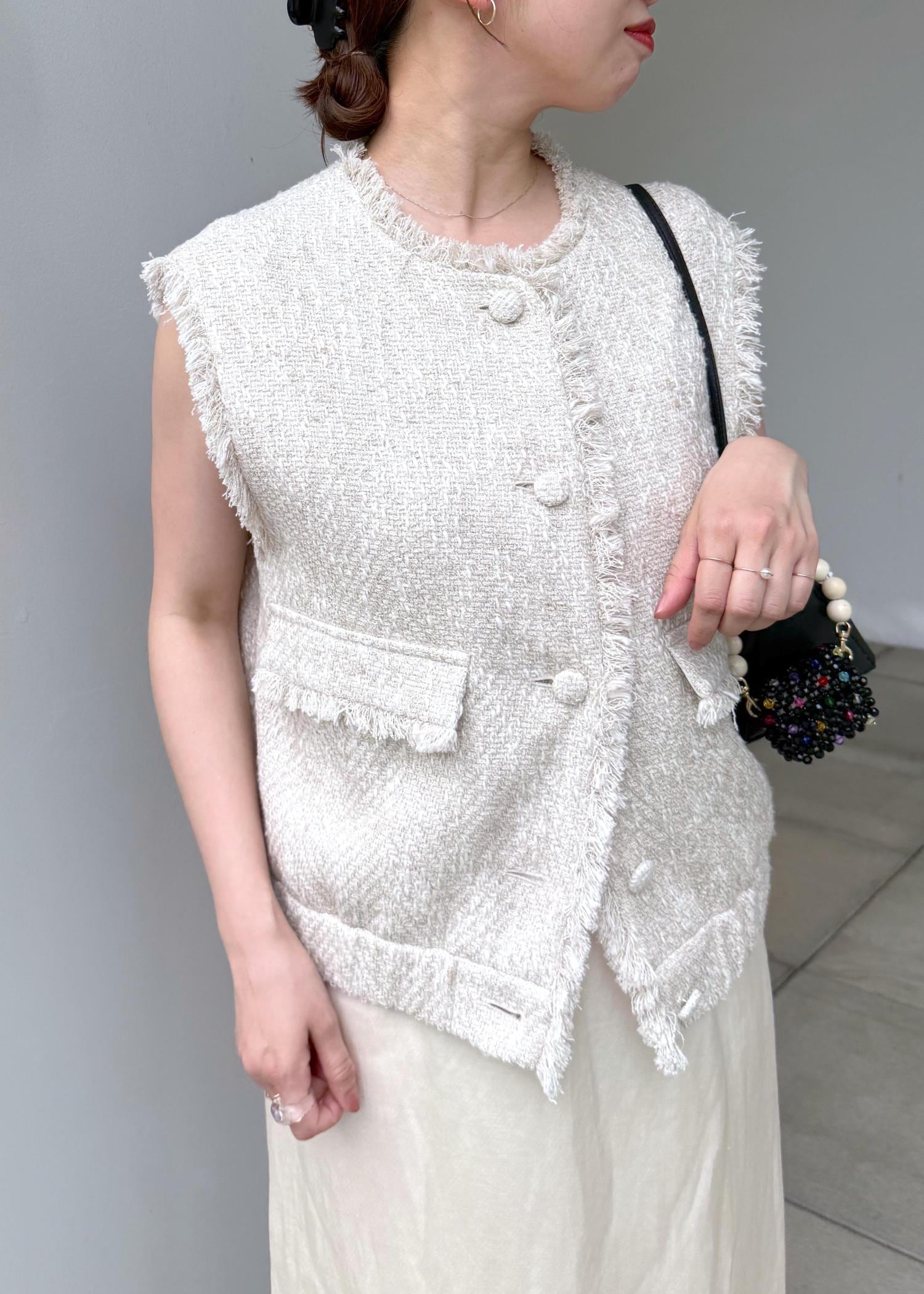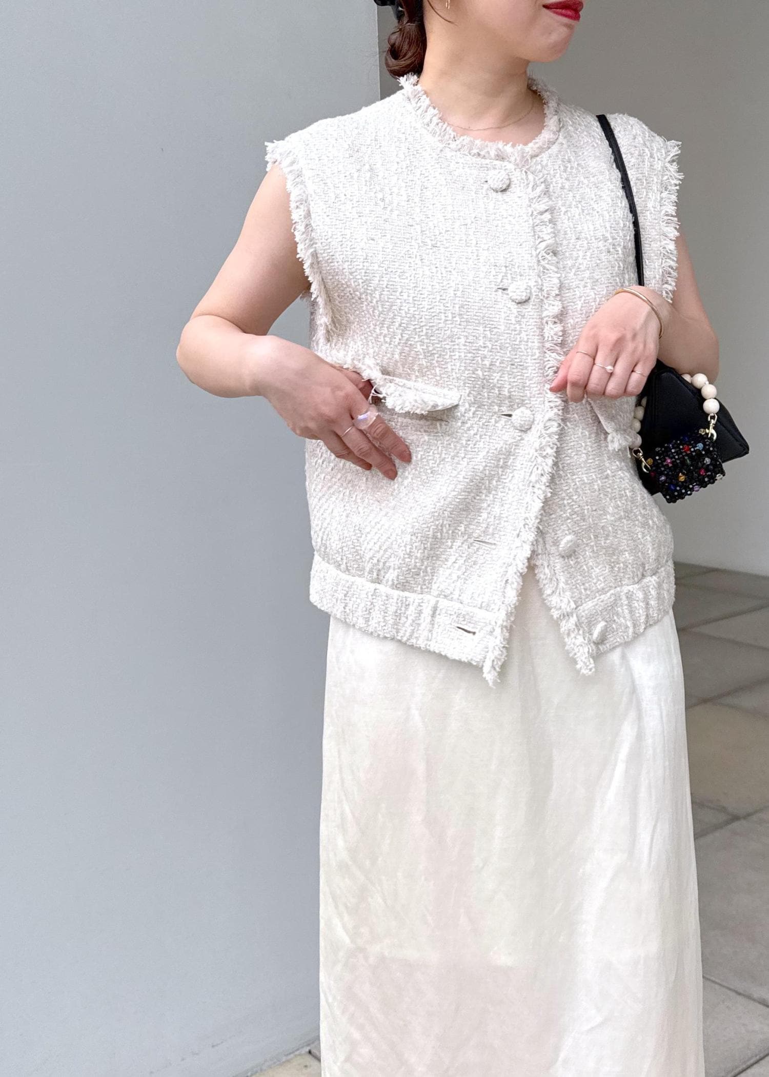アウトレットROPÉサマーツイードジレオフホワイト / F¥25,080レビュー肩先が隠れるくらいに肩幅にゆとりがあり、ゆったりめのサイズ感です。二の腕が少し隠れるのも嬉しいポイント◎