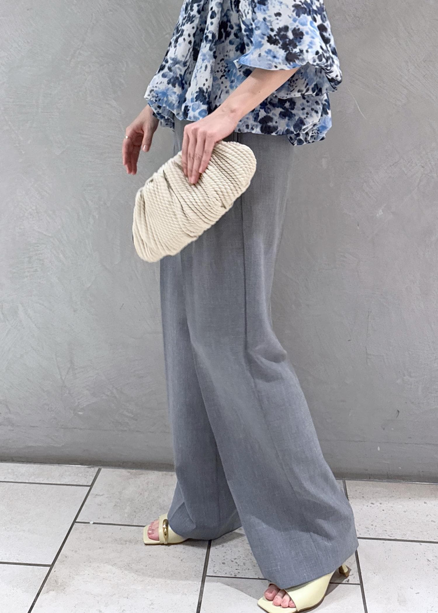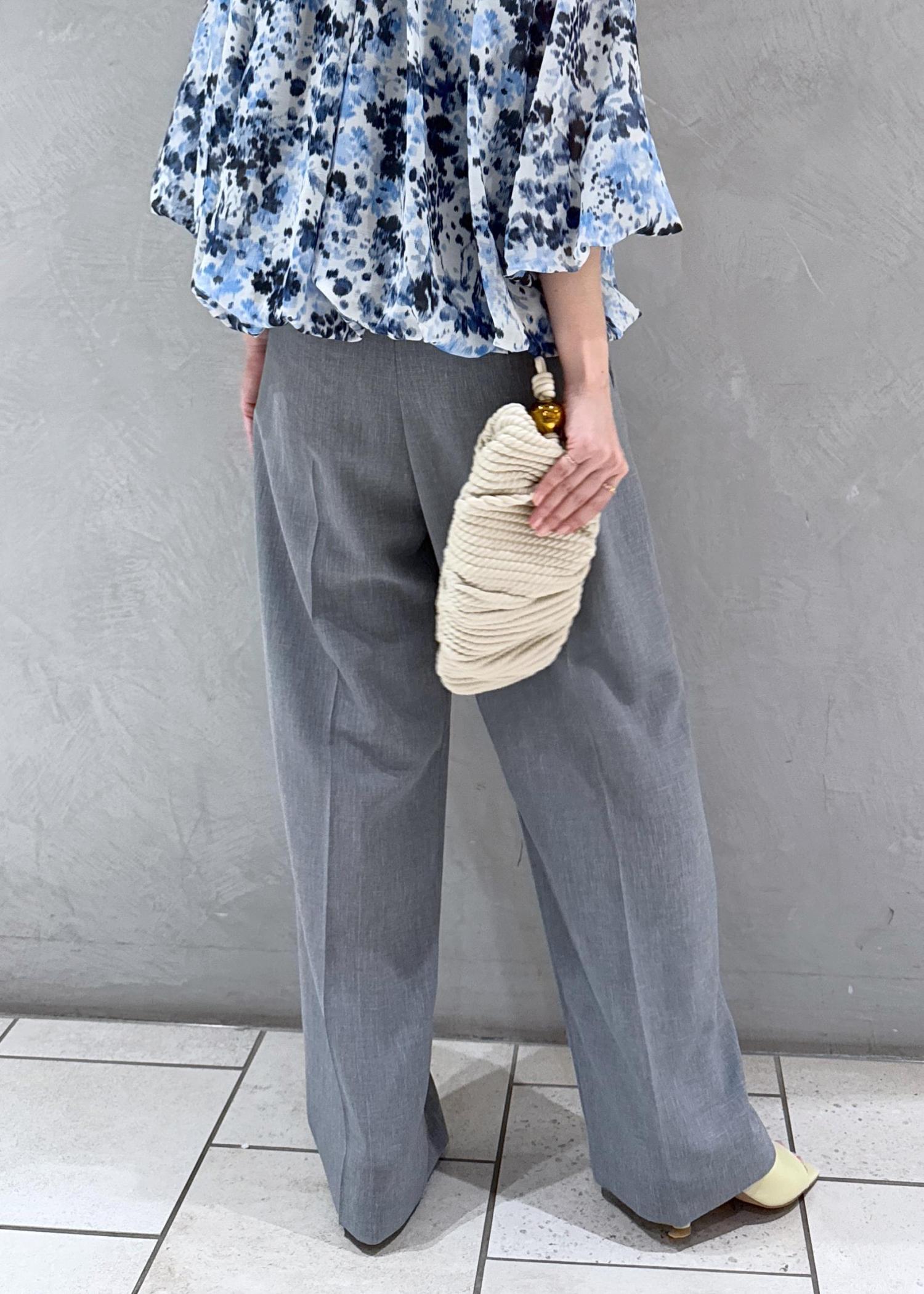 グレーのリネンライクパンツを合わせて可愛らしくなりすぎないよう合わせました。