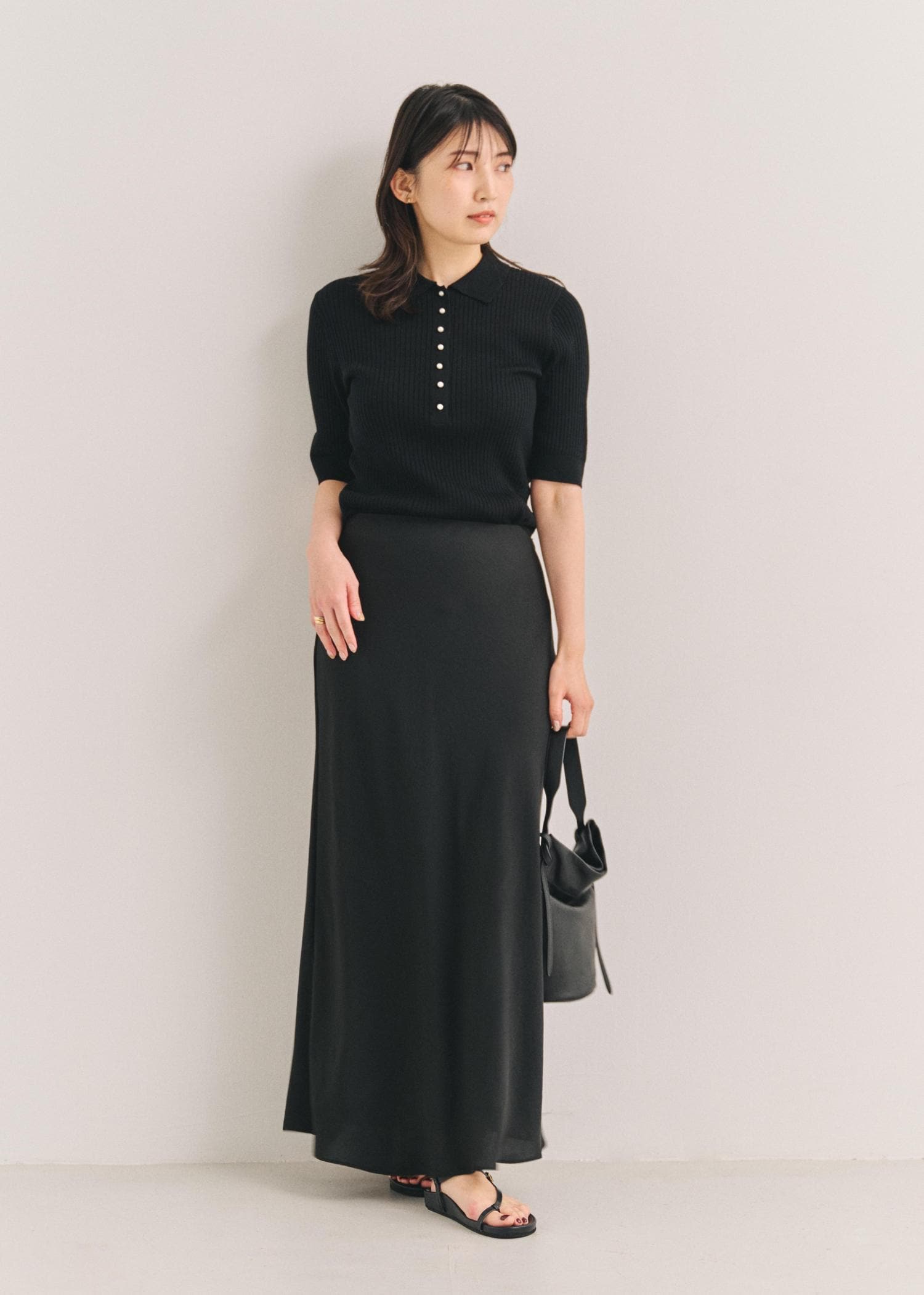 ニット×サテンの異素材ミックスで奥行きのあるスタイリングに。