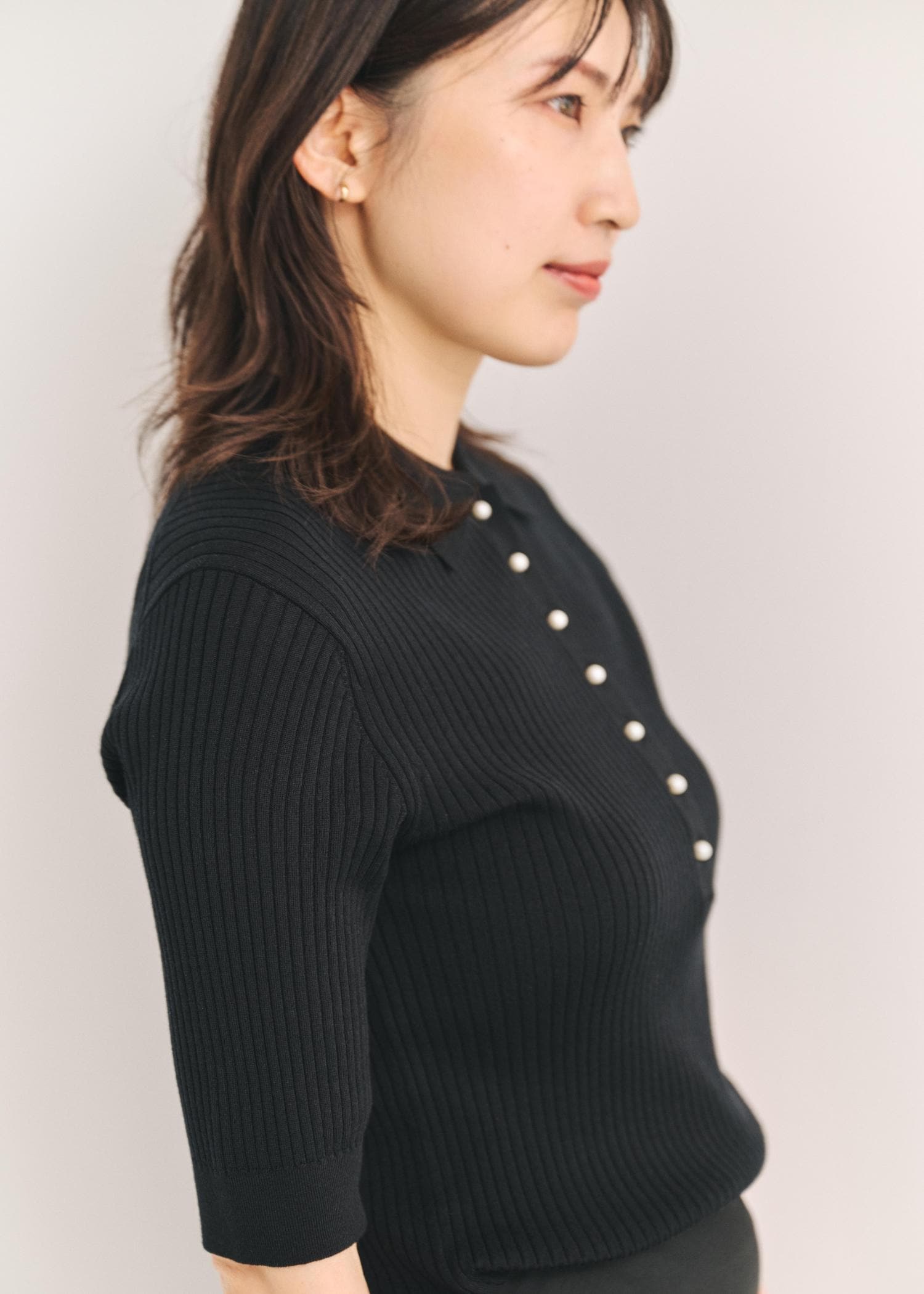 小さめパールボタンがアクセントになった、キレイめに着られるポロニットです。