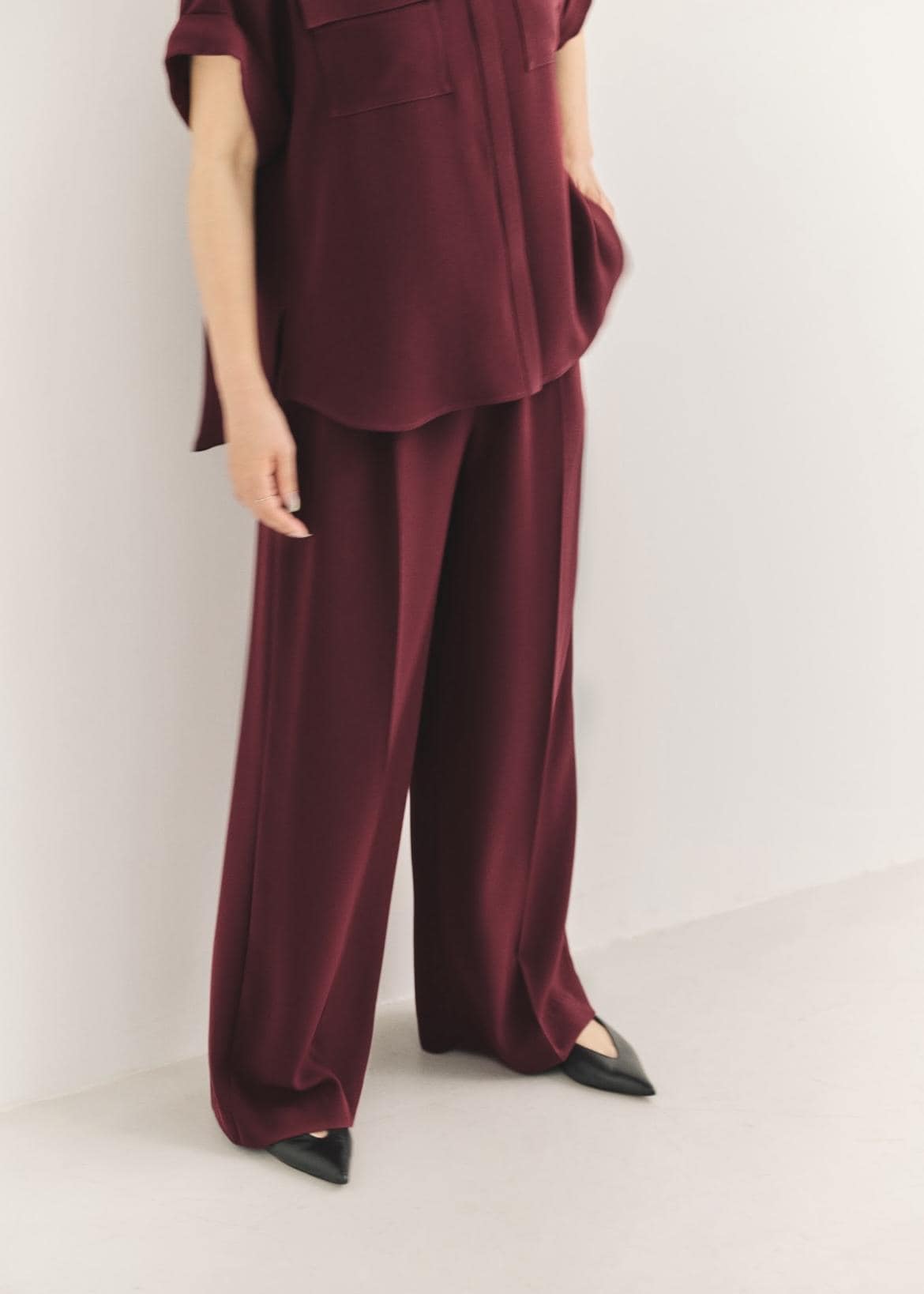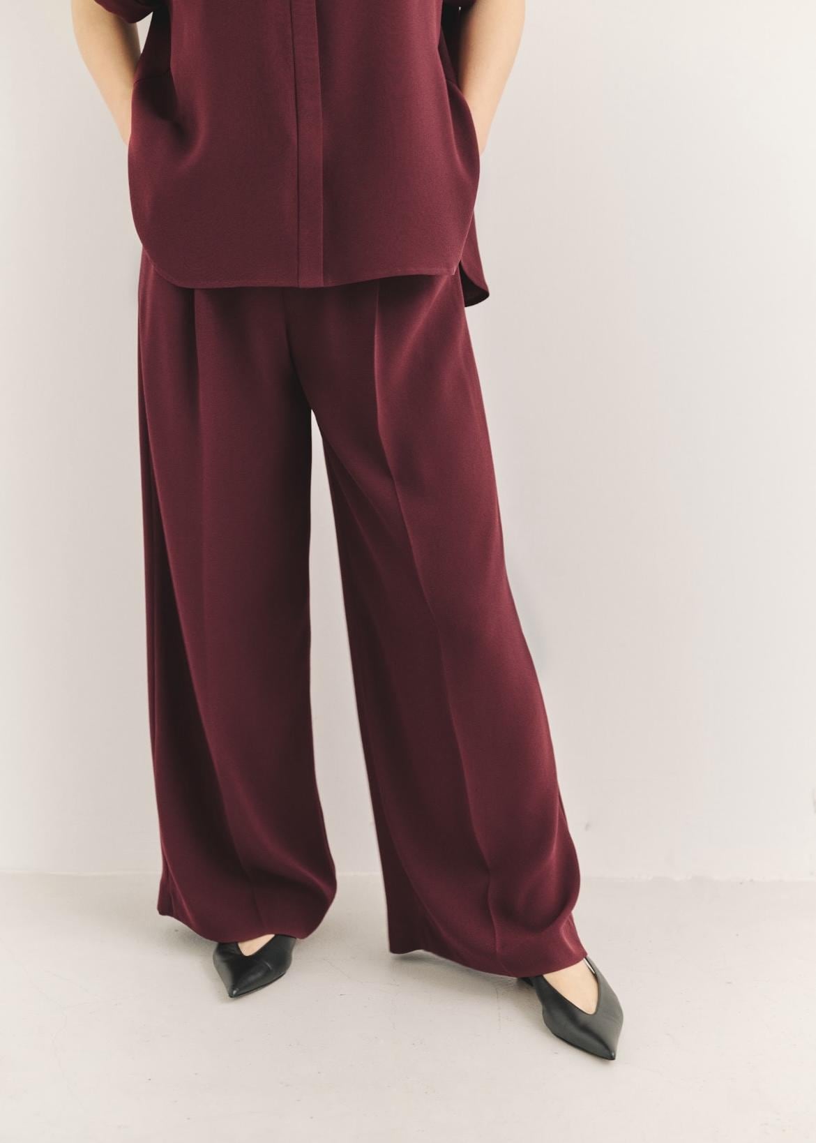 ROPÉ【洗える・カセット服】ライトトリアセイージーワイドパンツ/お仕事・通勤・セットアップ対応ワイン / 38¥25,300レビューウエストは総ゴムで中に紐があるので調節ができます。すとんとした落ち感と肌離れしてくれるので