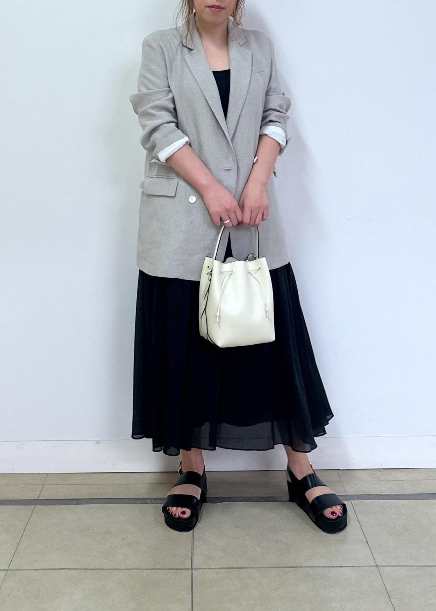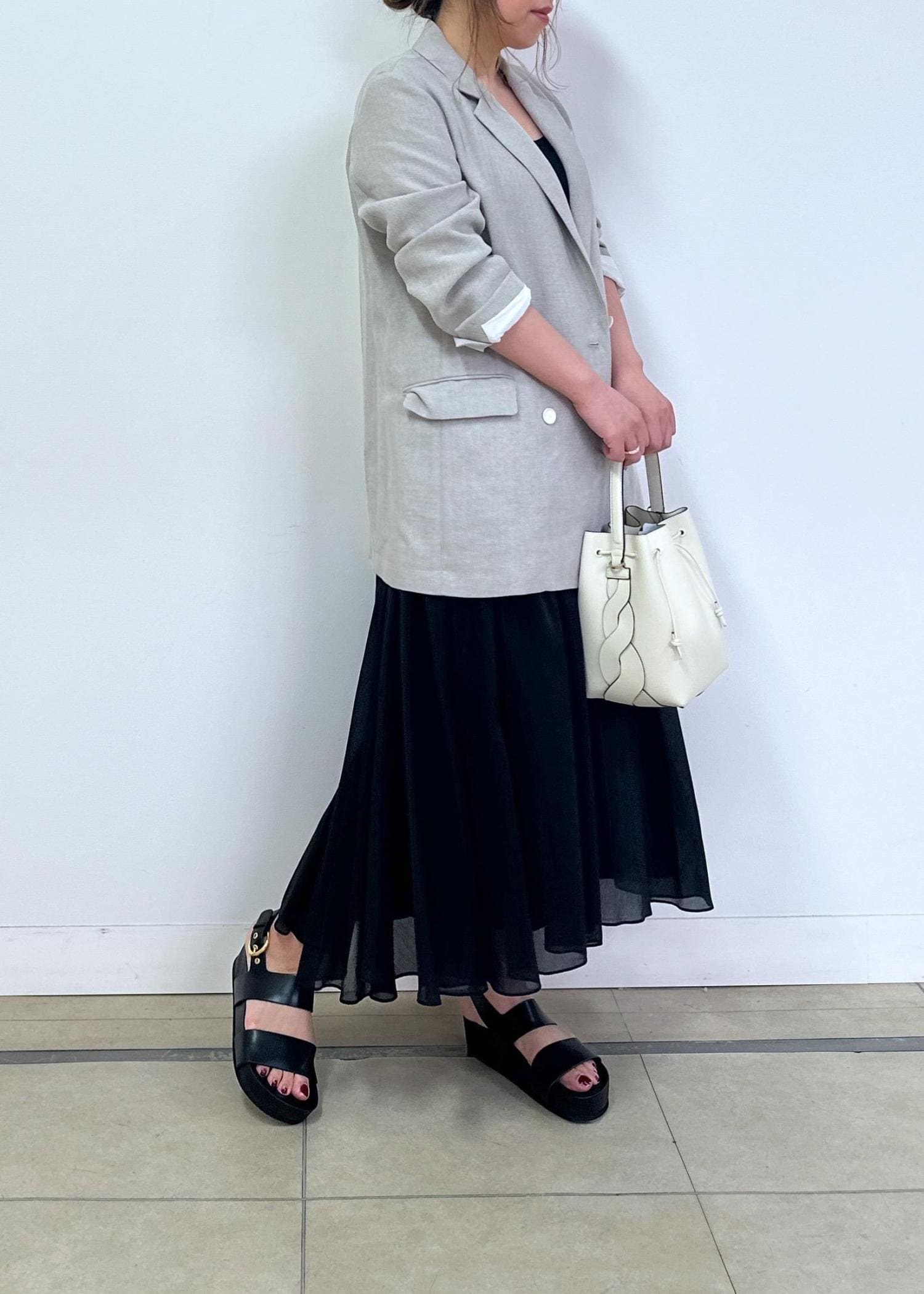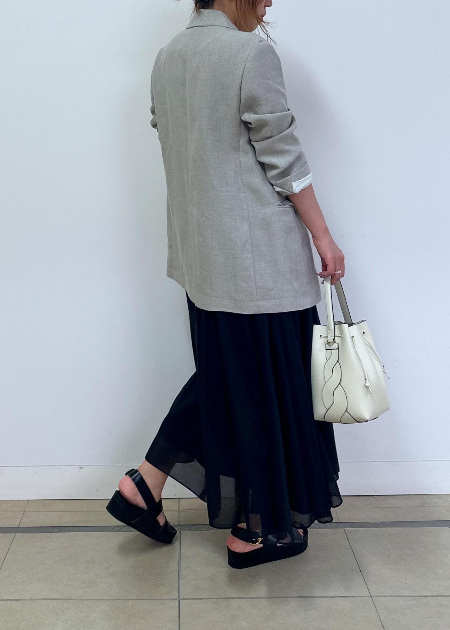 ベージュのジャケットに黒のスカートで合わせてみました。
