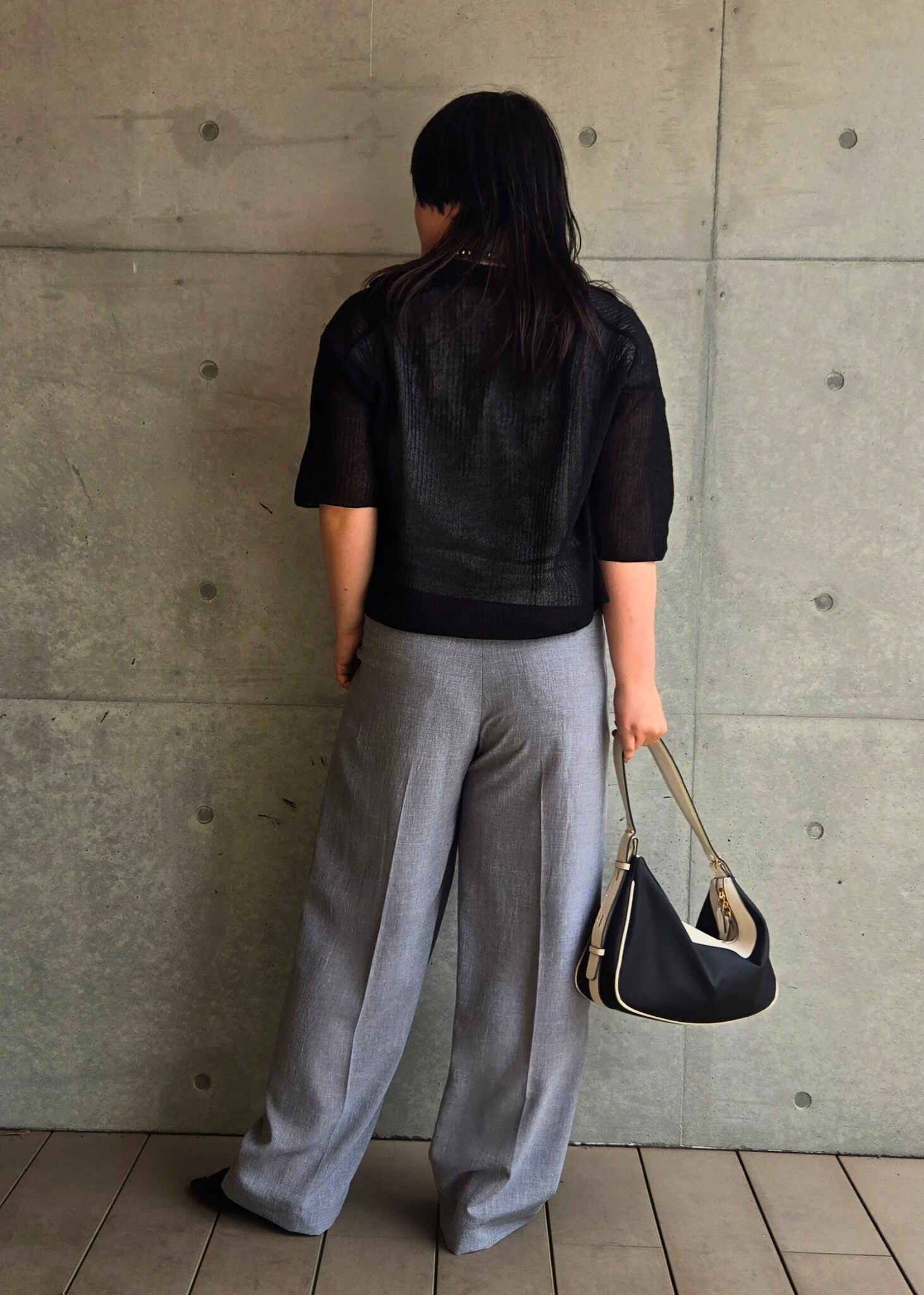 下にストンと落ちるワイドパンツでオンオフどちらでも使えるます。