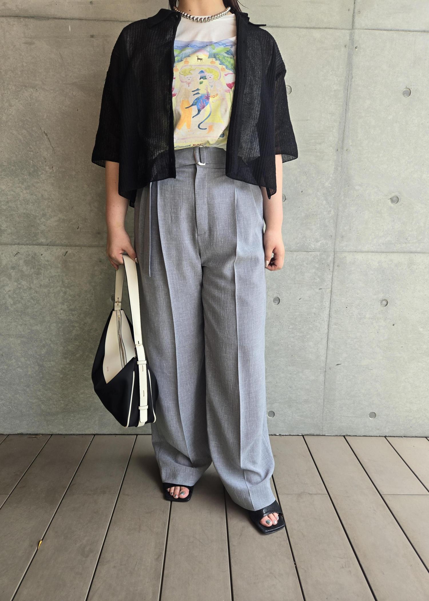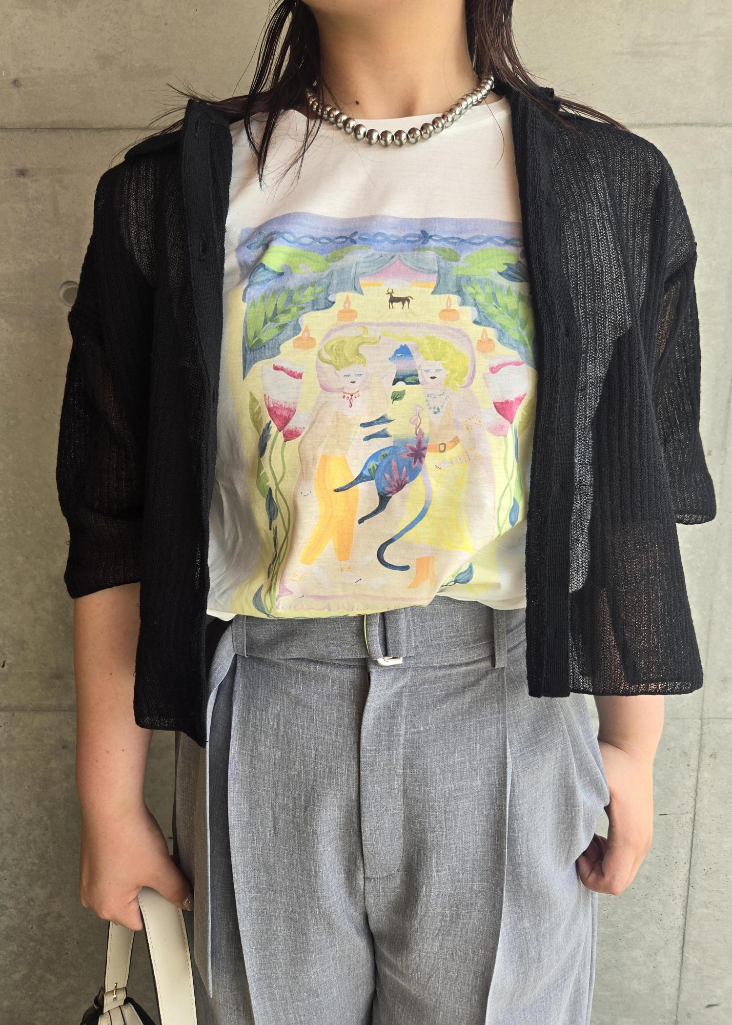 華やかなカラーリングで描かれた絵をプリントされたTシャツにリネン混のポロシャツを羽織りとして合わせ、ボトムはワイドパンツでウエストゴムで肌離れが良いもので合わせました!