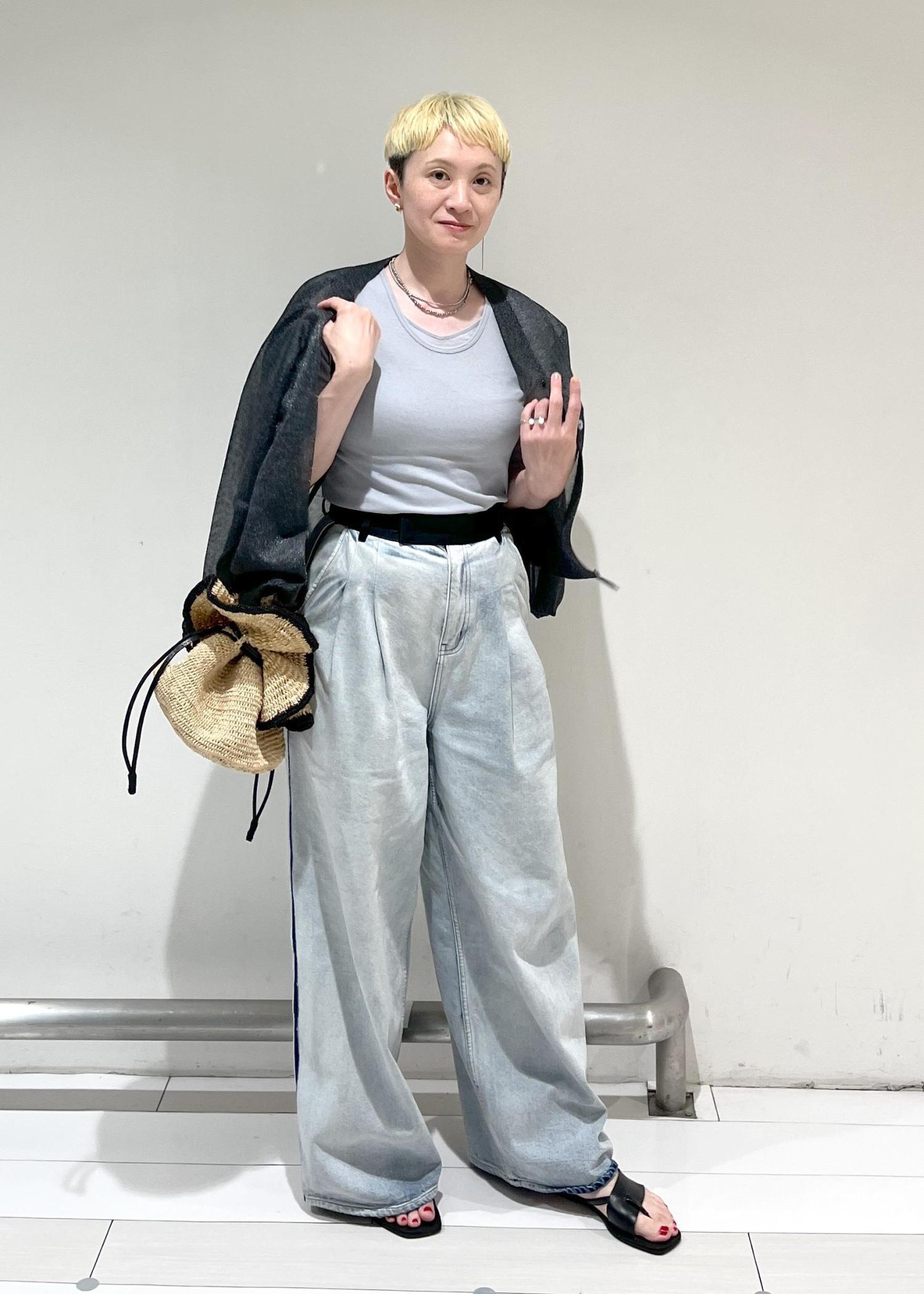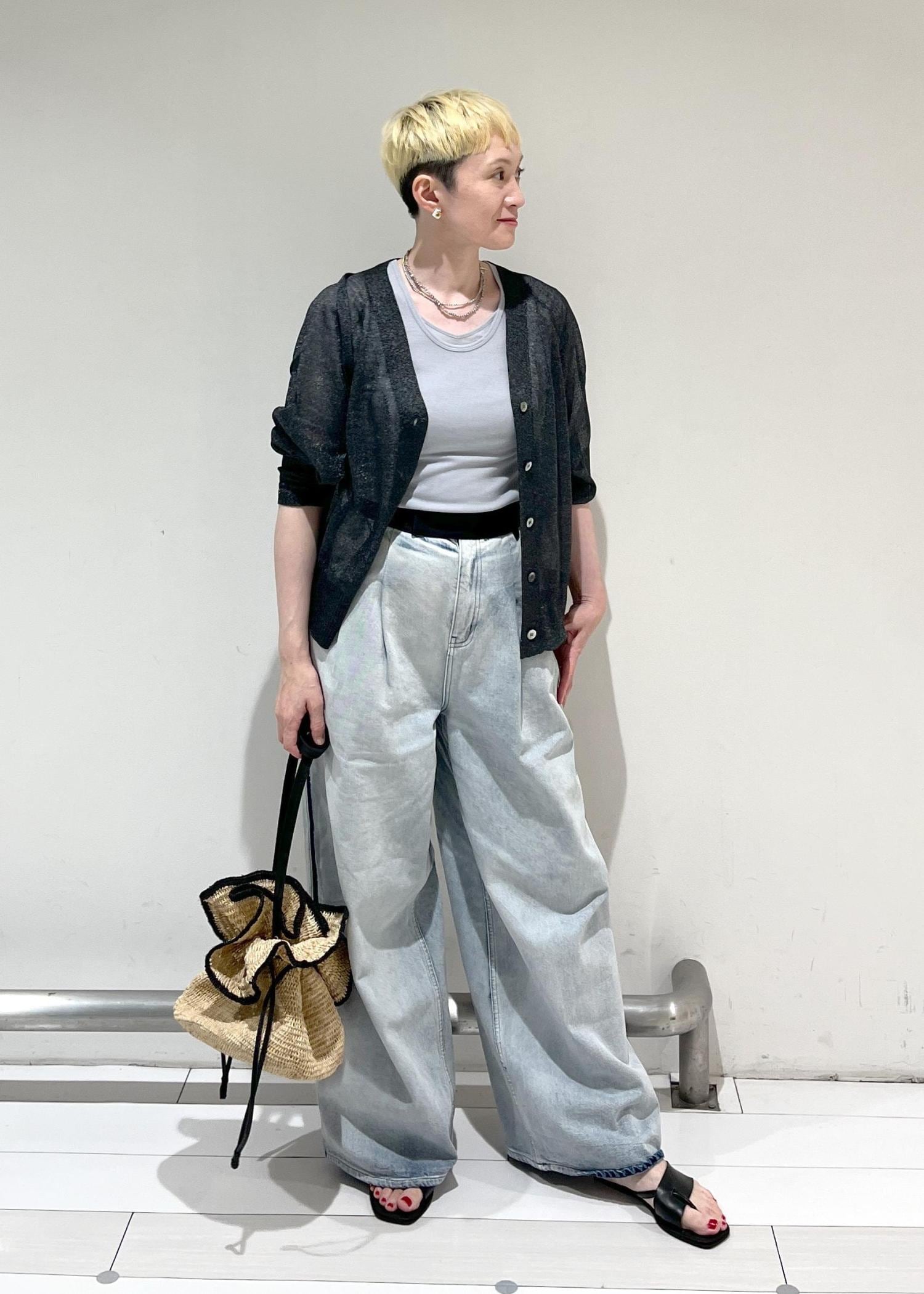 全体的にブルーグレーの柔らかなワントーンコーデに、さらりとしたシルバーのラメシアーカーディガンを重ねて、小物などで黒を差し込みました。