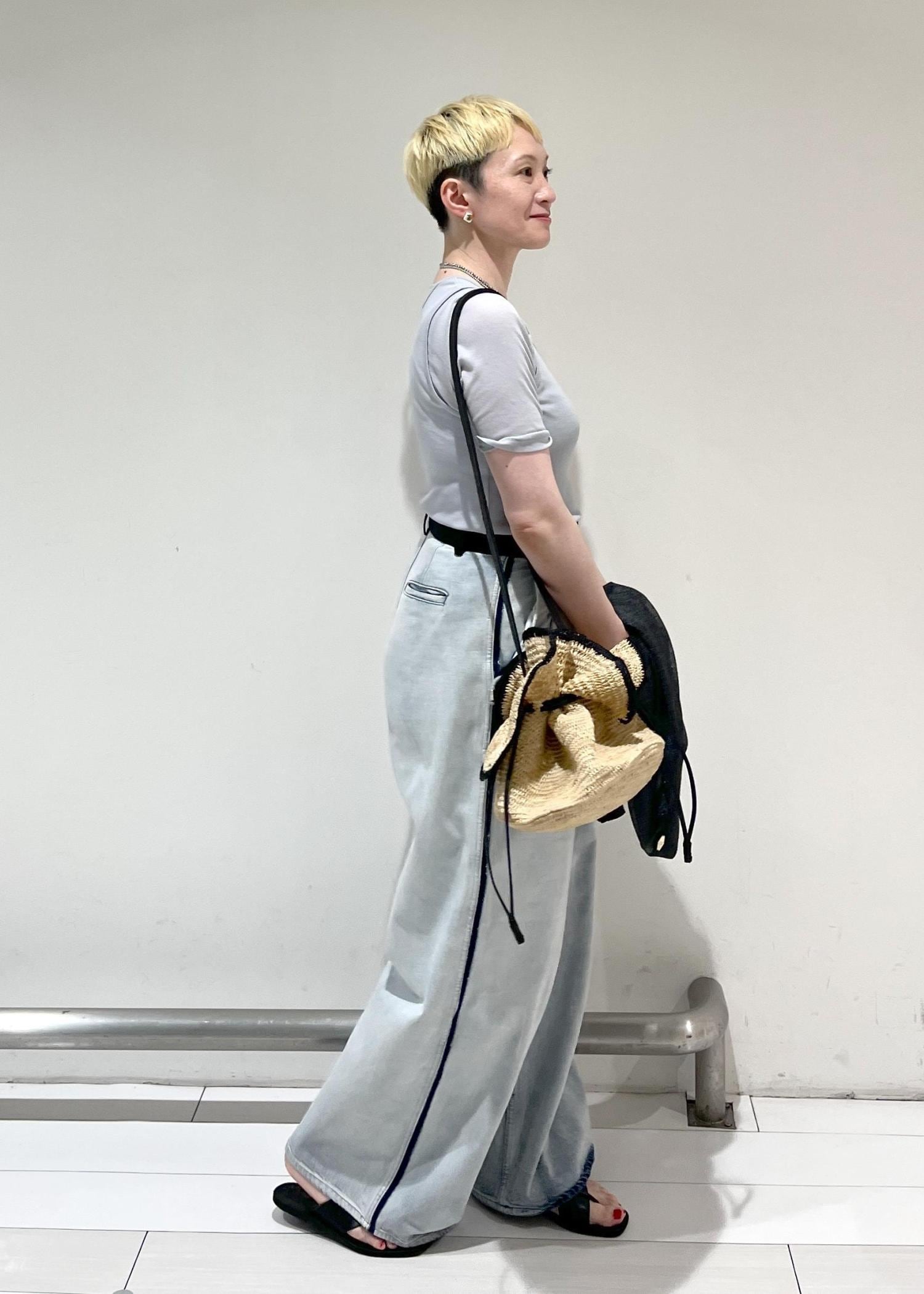 柔らかな素材のデニムなので着心地も楽です。裾のラインは前側が長くなっていて、スタイルアップ効果があります。