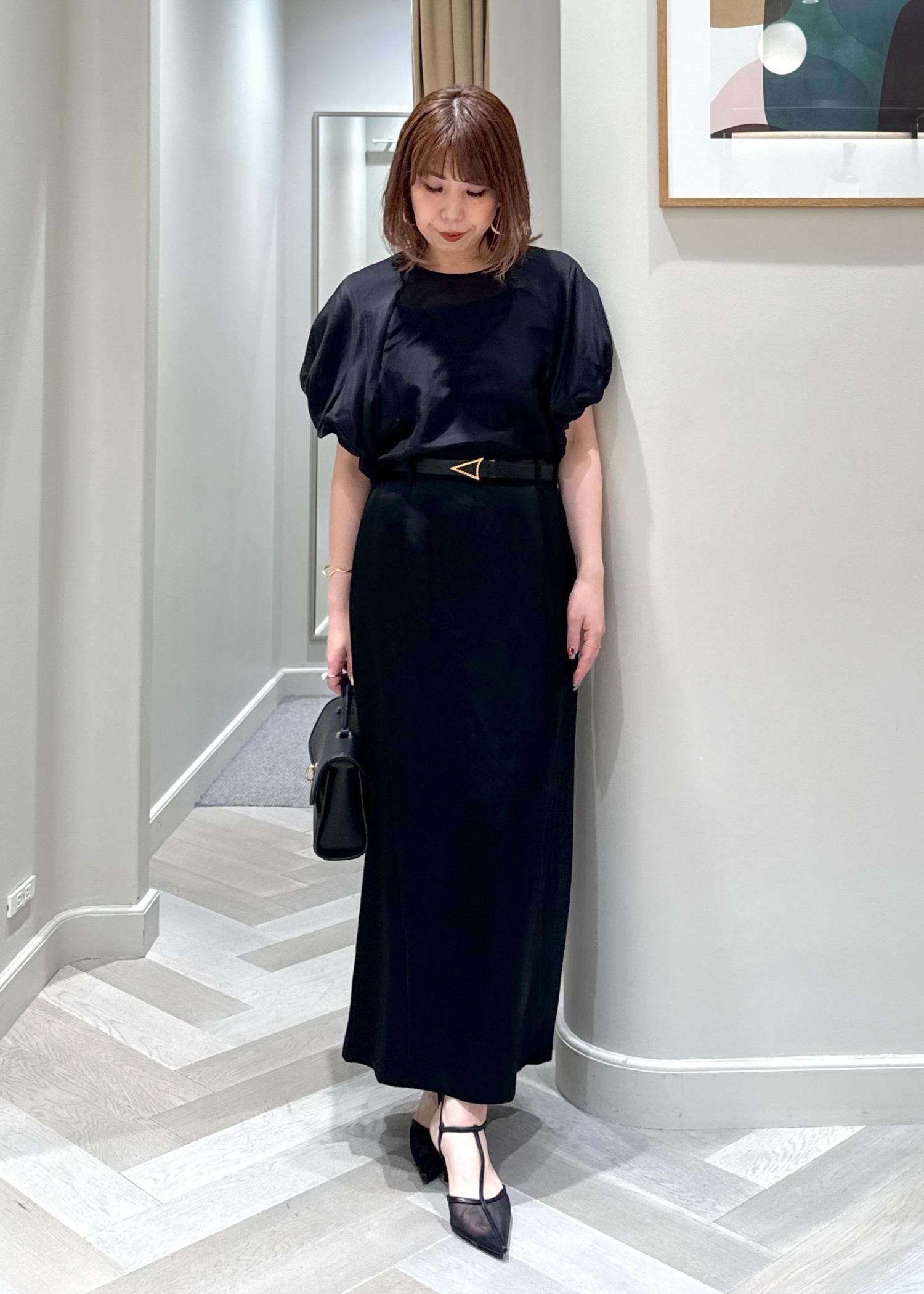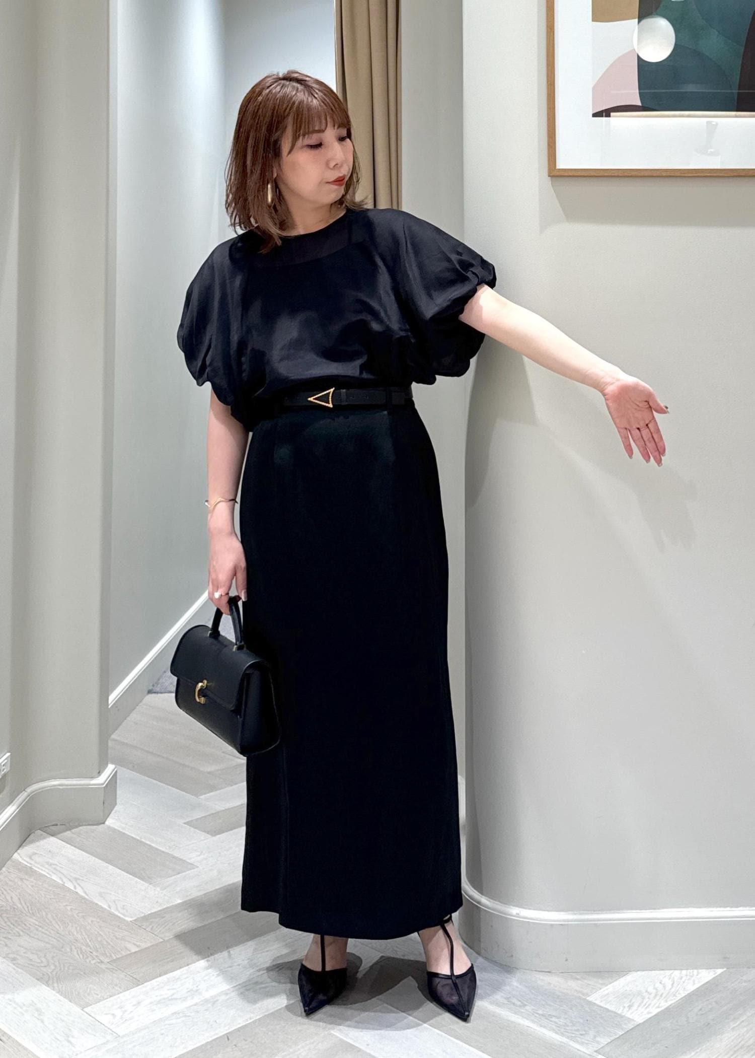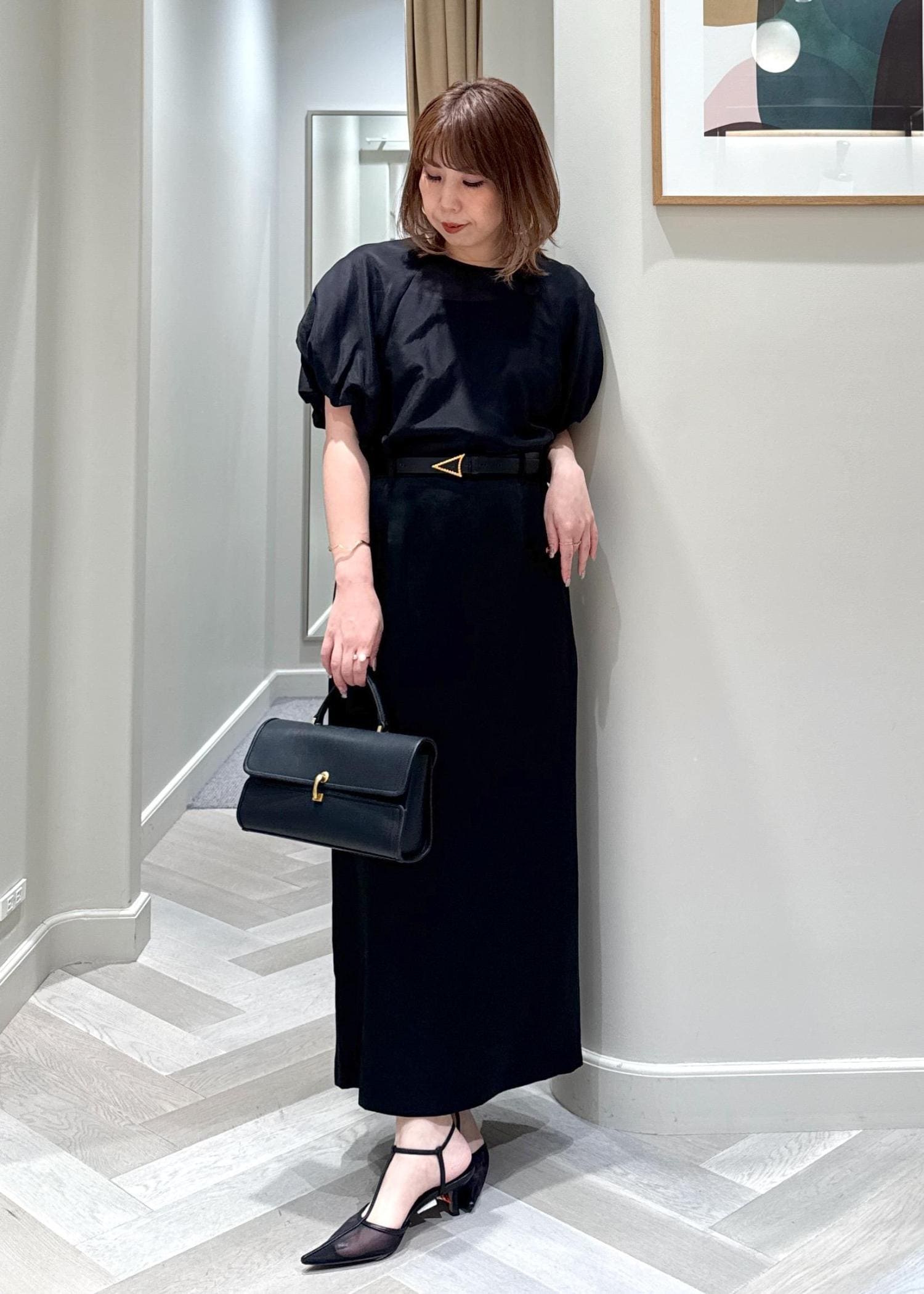 生地感が異なるブラックを組み合わせたオールブラックコーデ。さらっとした素材感なので重く見えません。