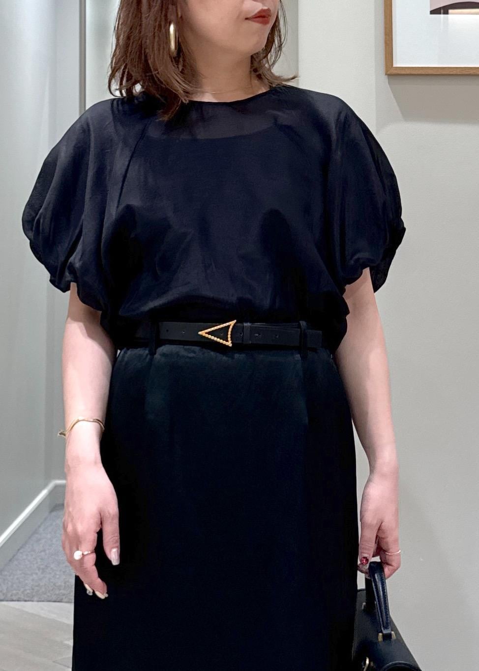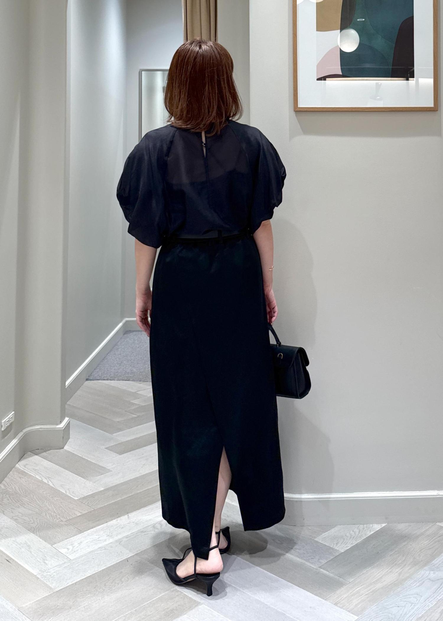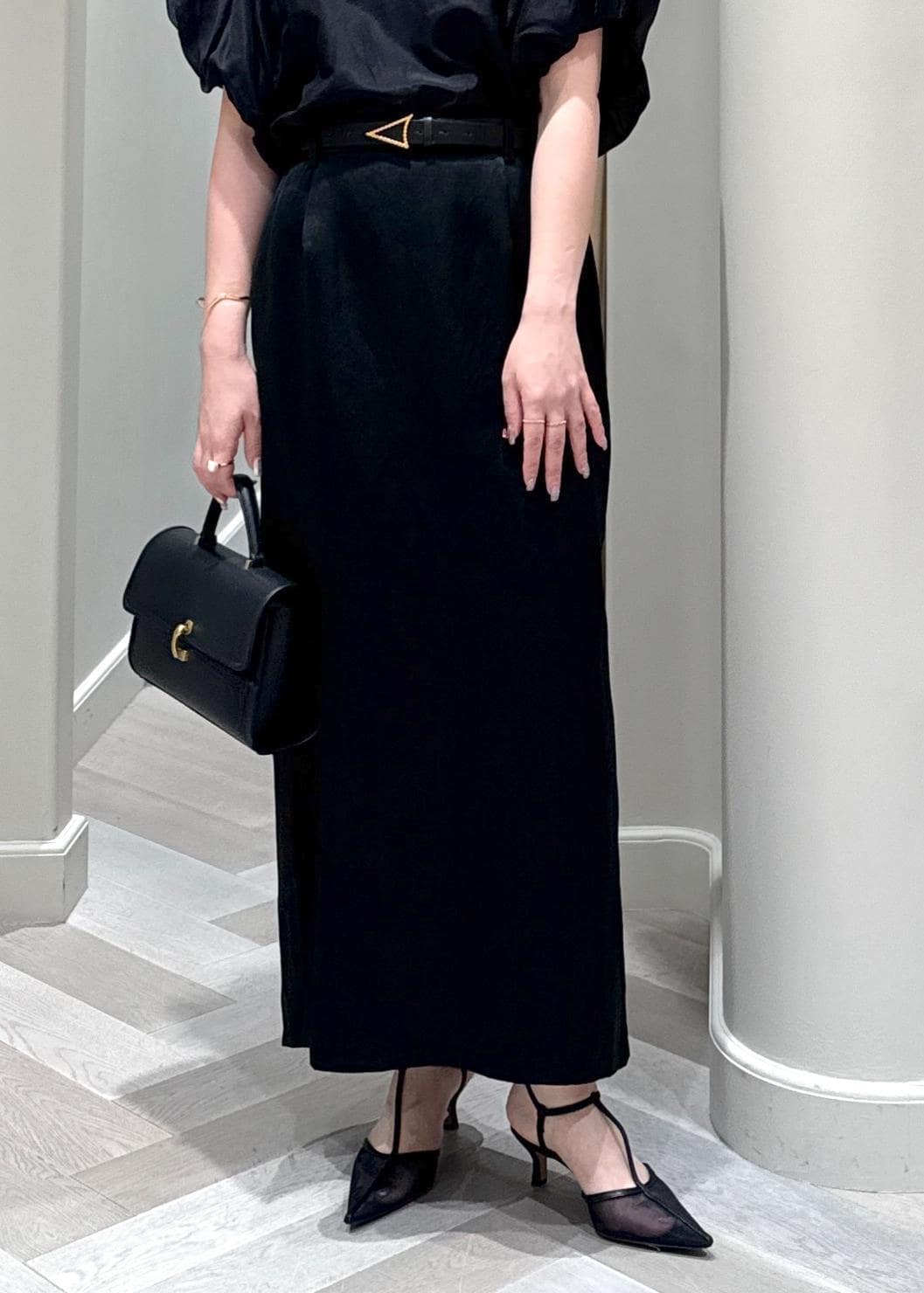 生地感が異なるブラックを組み合わせたオールブラックコーデ。さらっとした素材感なので重く見えません。