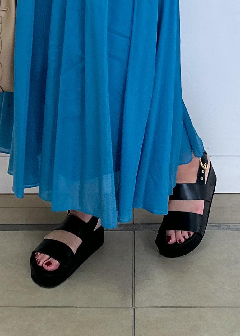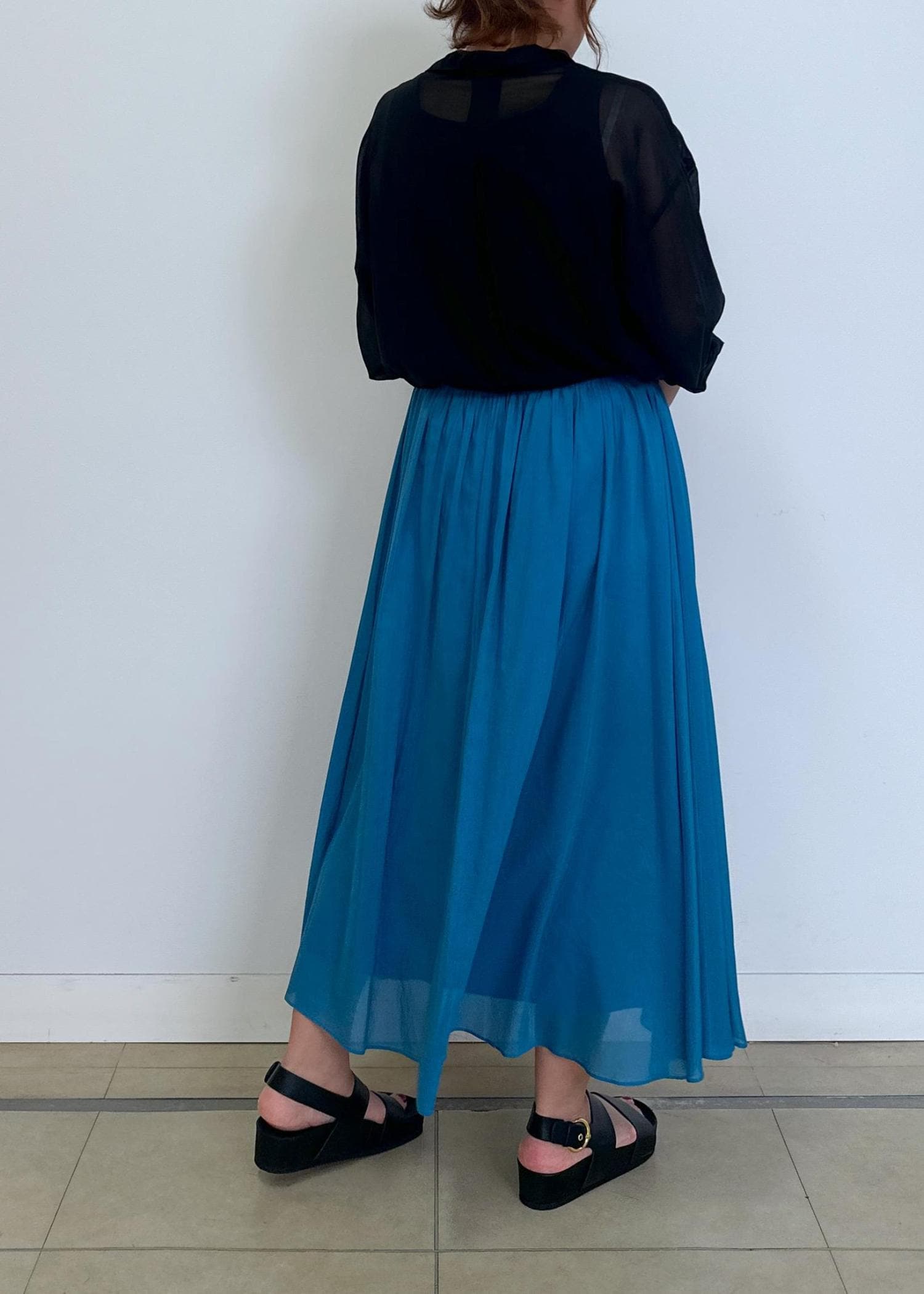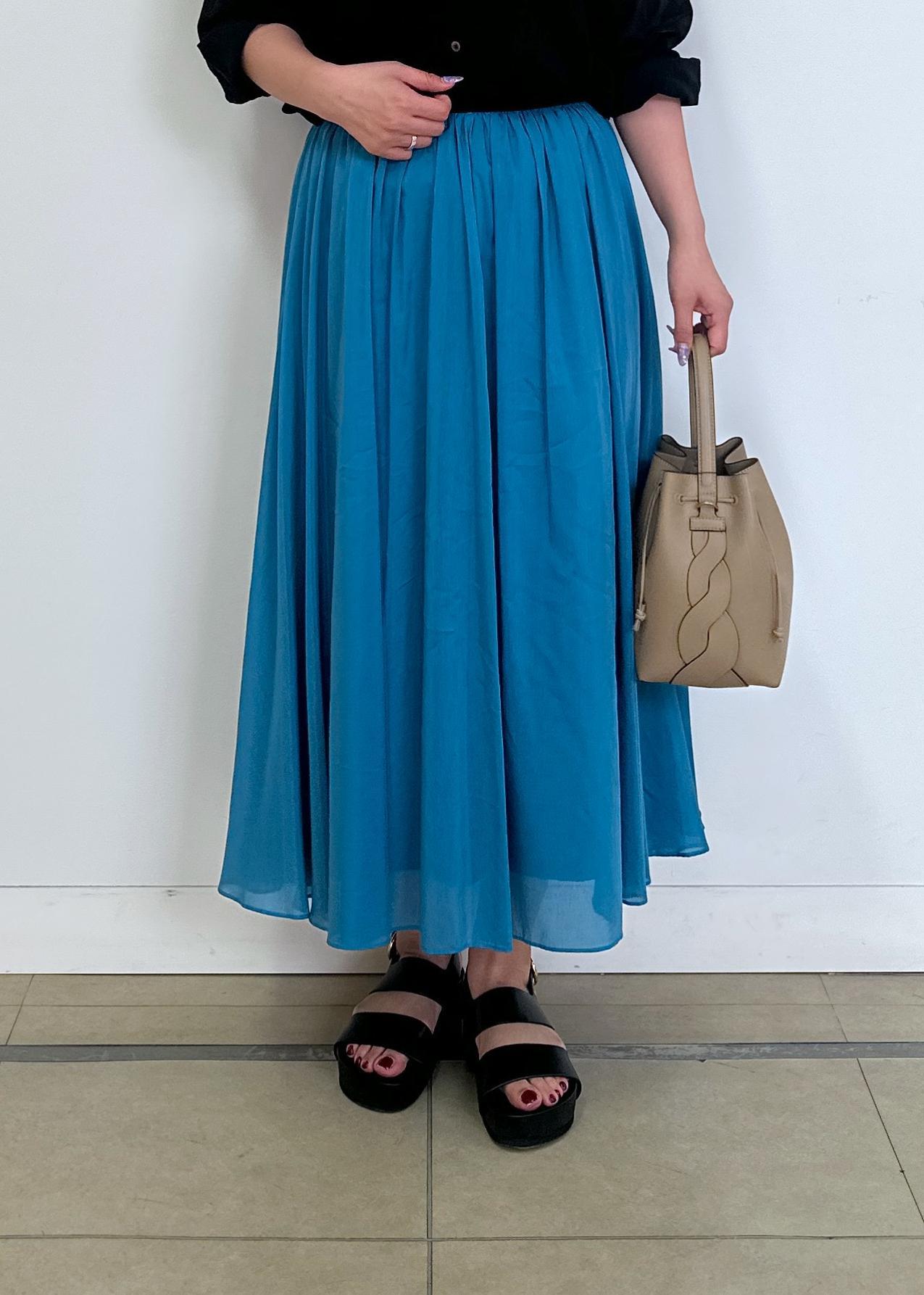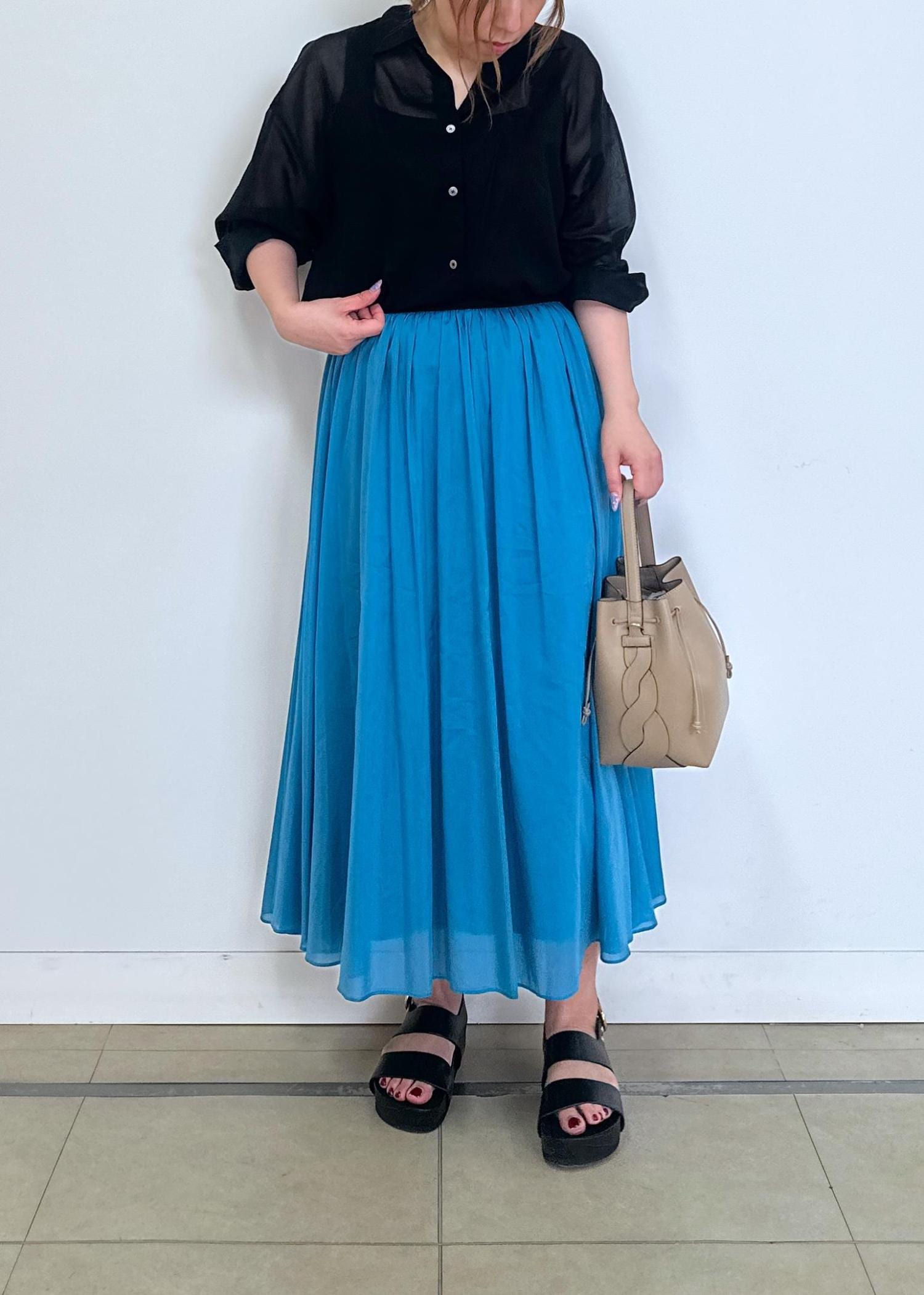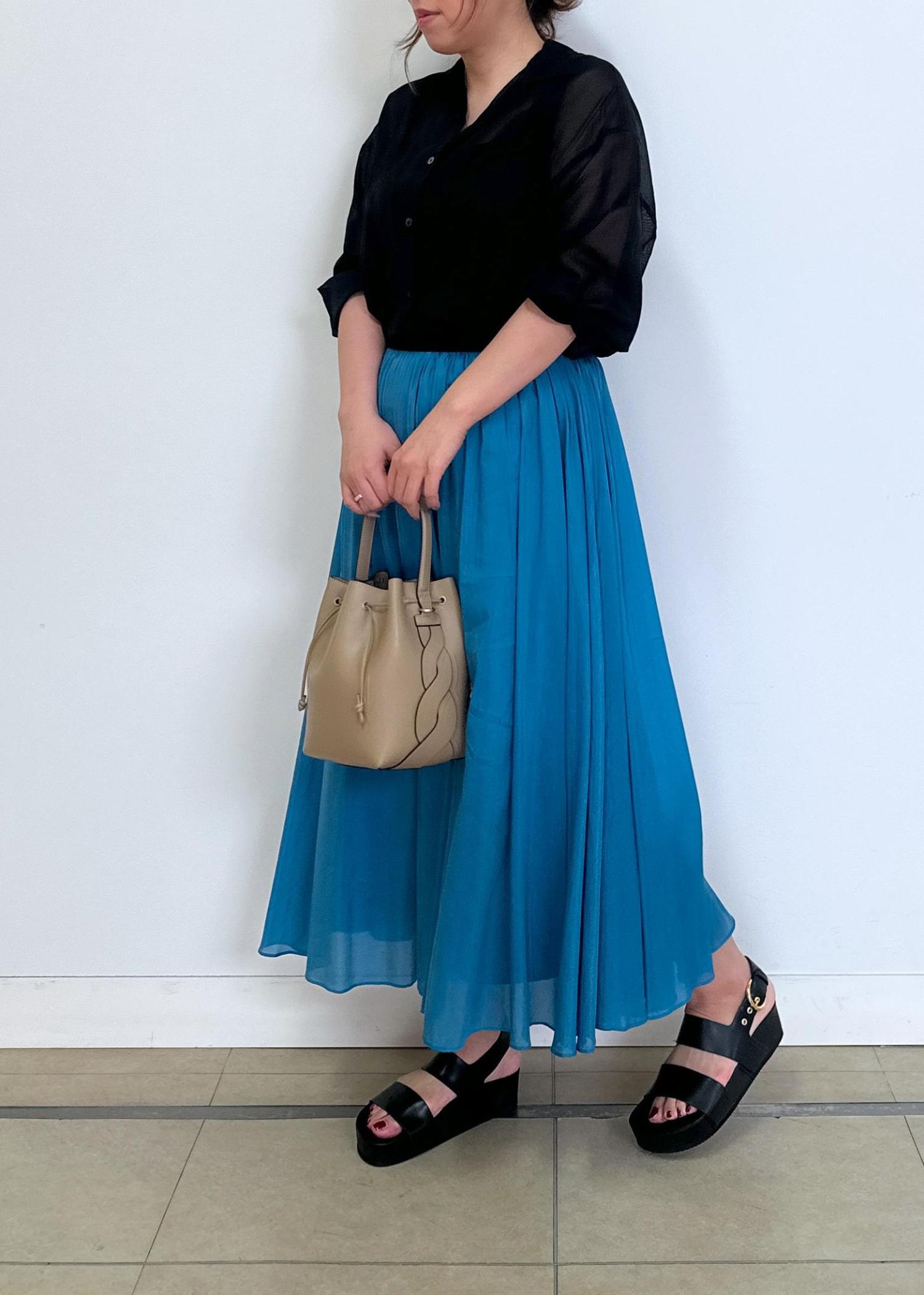 黒のシャツブラウスにターコイズブルーのスカートで合わせてみました。