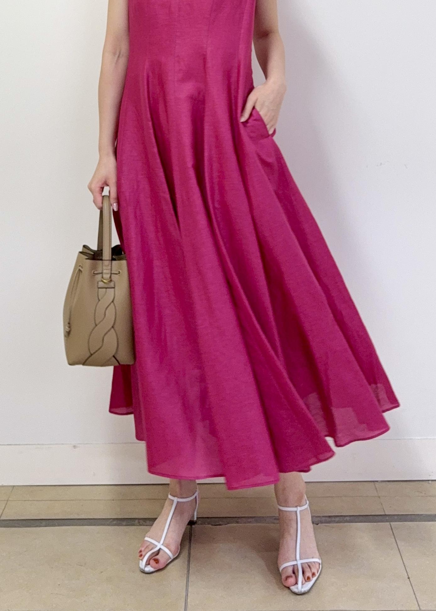 鮮やかなピンクのワンピースが主役のコーディネートです。