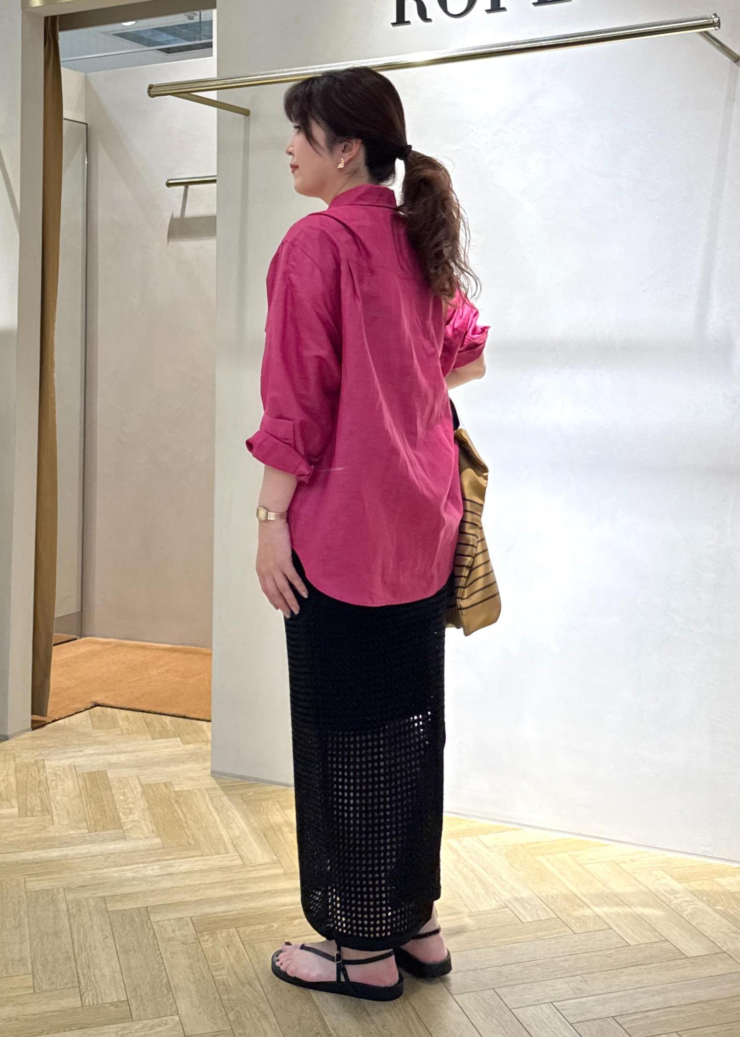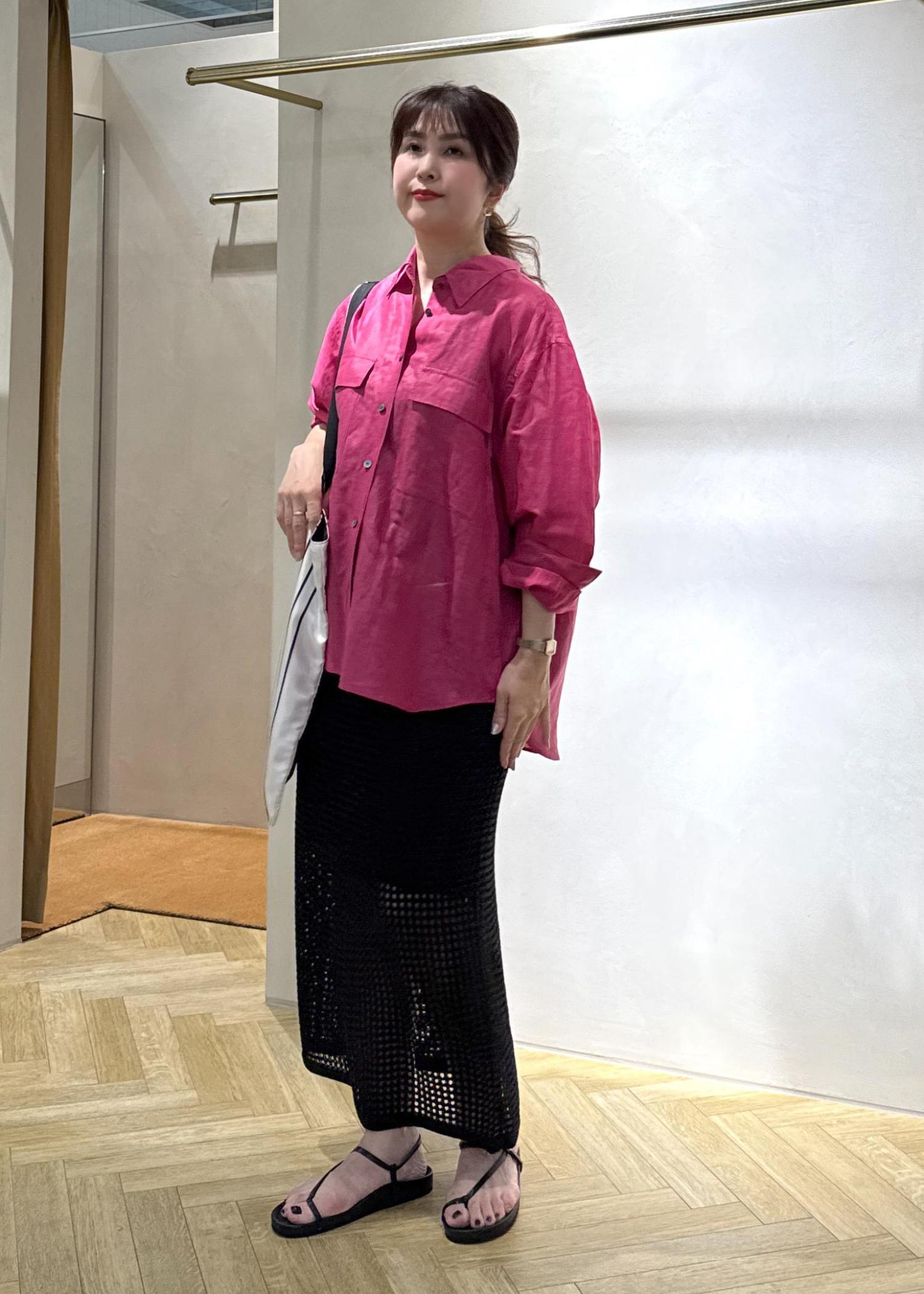 ゆとりのあるシルエットのリネン混シャツにタイトスカートを合わせればすっきり細見えスタイルに!
