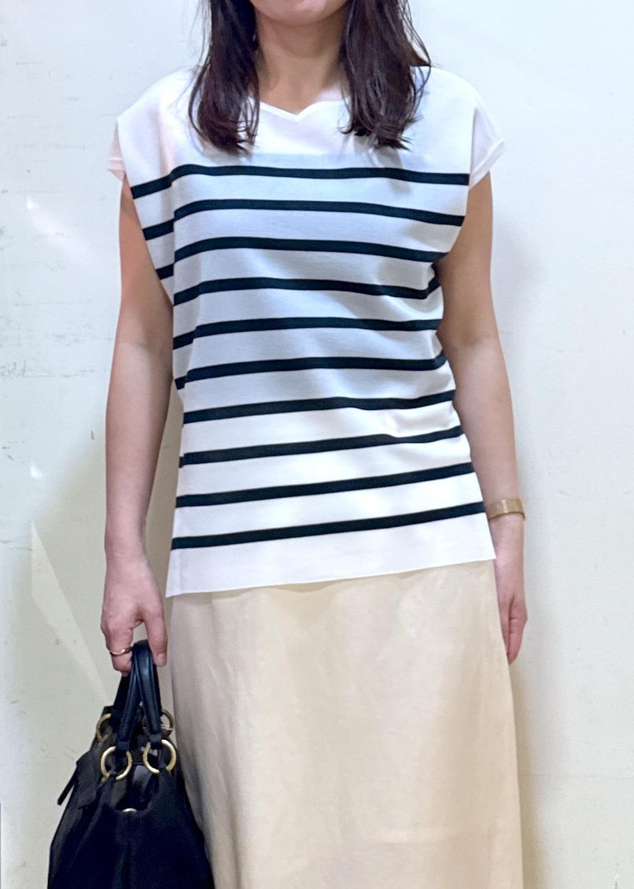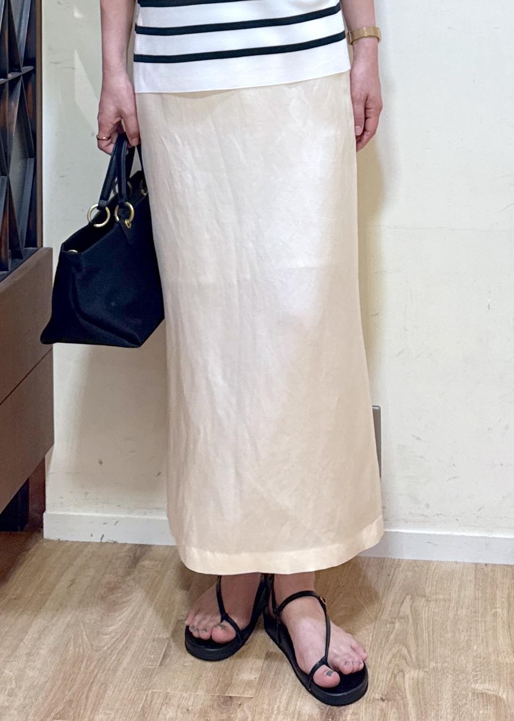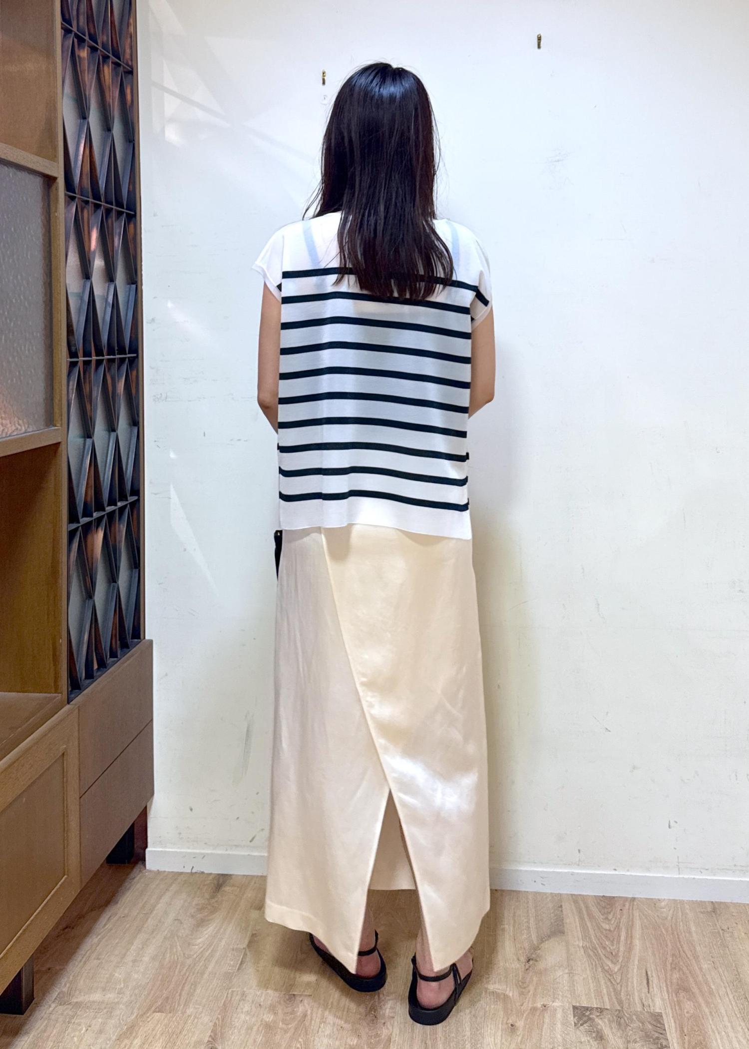 透け感のあるボーダーを艶のあるロングスカートとコーディネート。