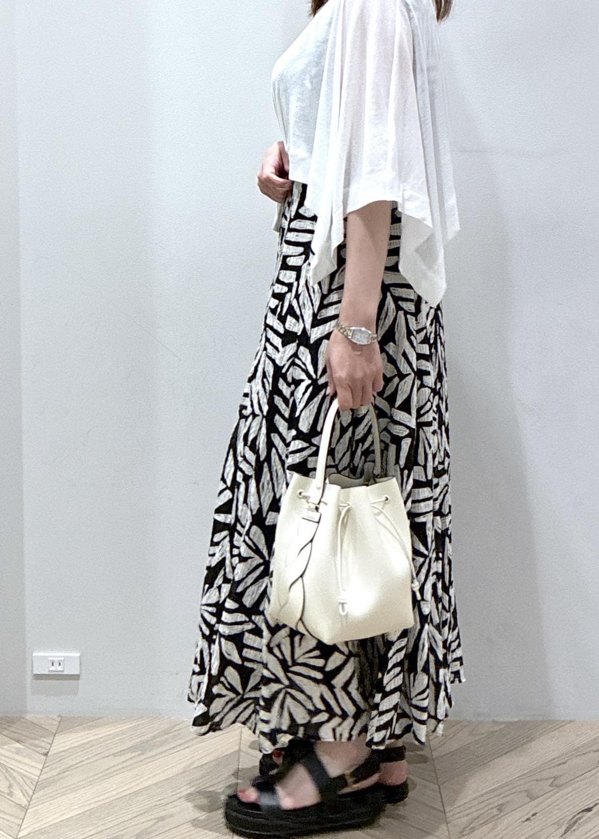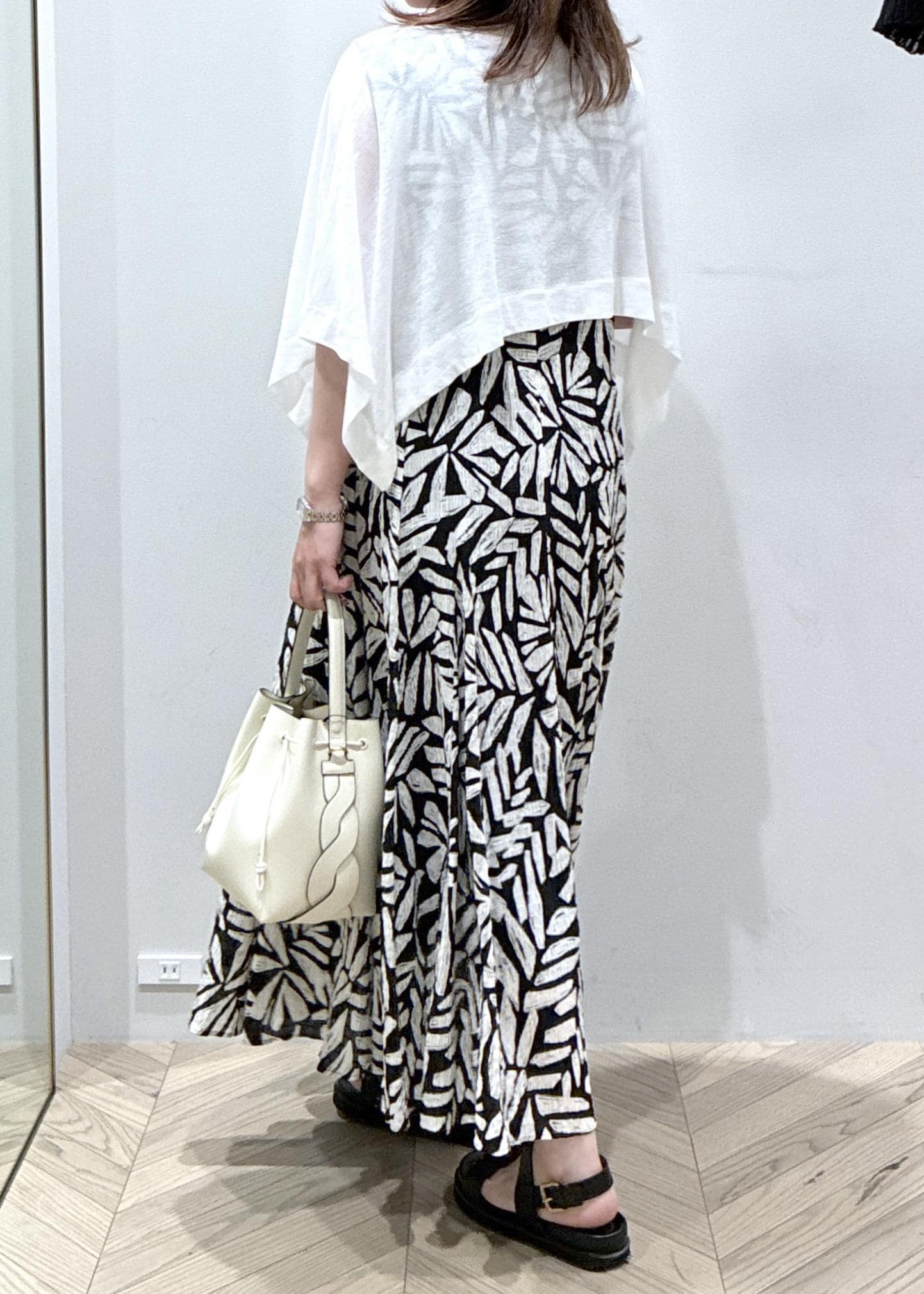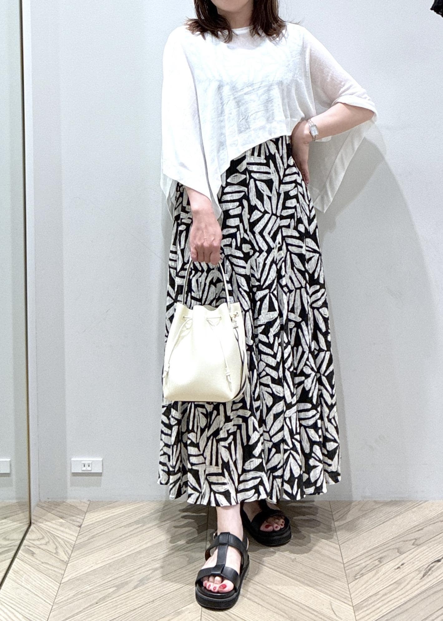 着丈はくるぶしが見える程度。首元も深すぎないVネックなのでデコルテがキレイに見えますし、アクセサリーも映えるカットになっています。