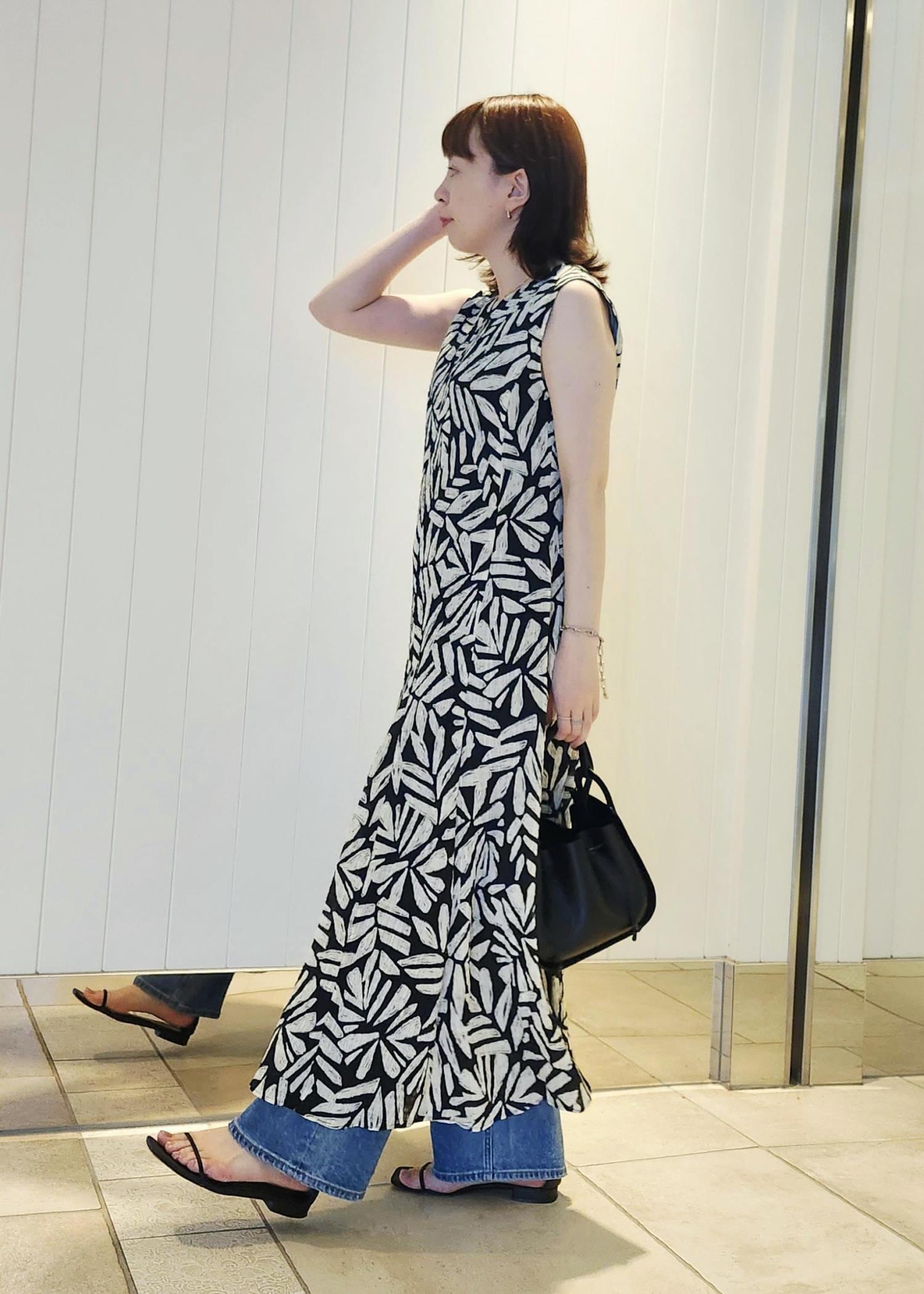 モノトーンの中にデニムのブルーを足して、柄ワンピースでも印象が強すぎないようバランスをとりました◎