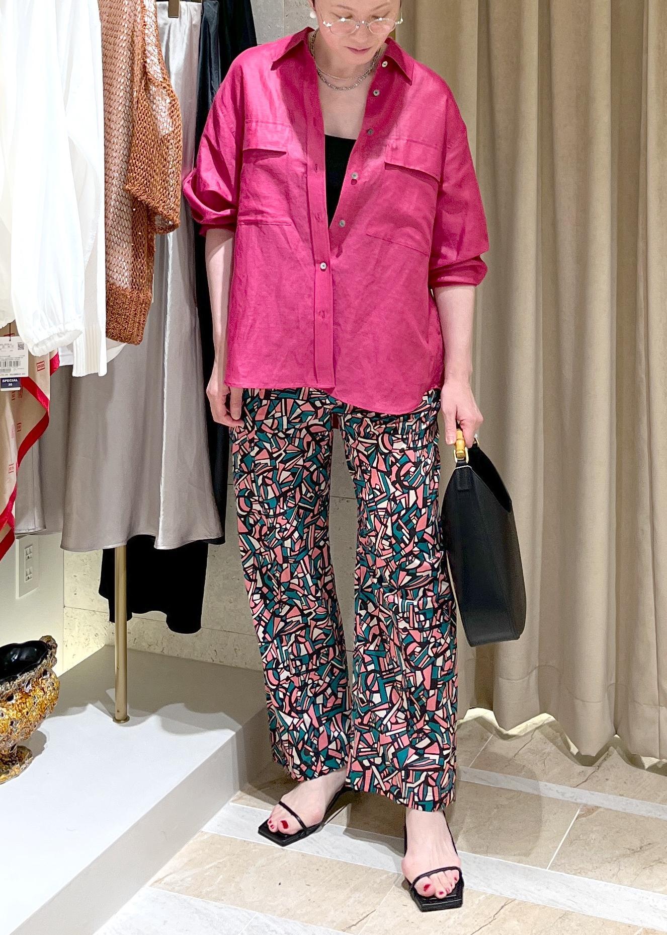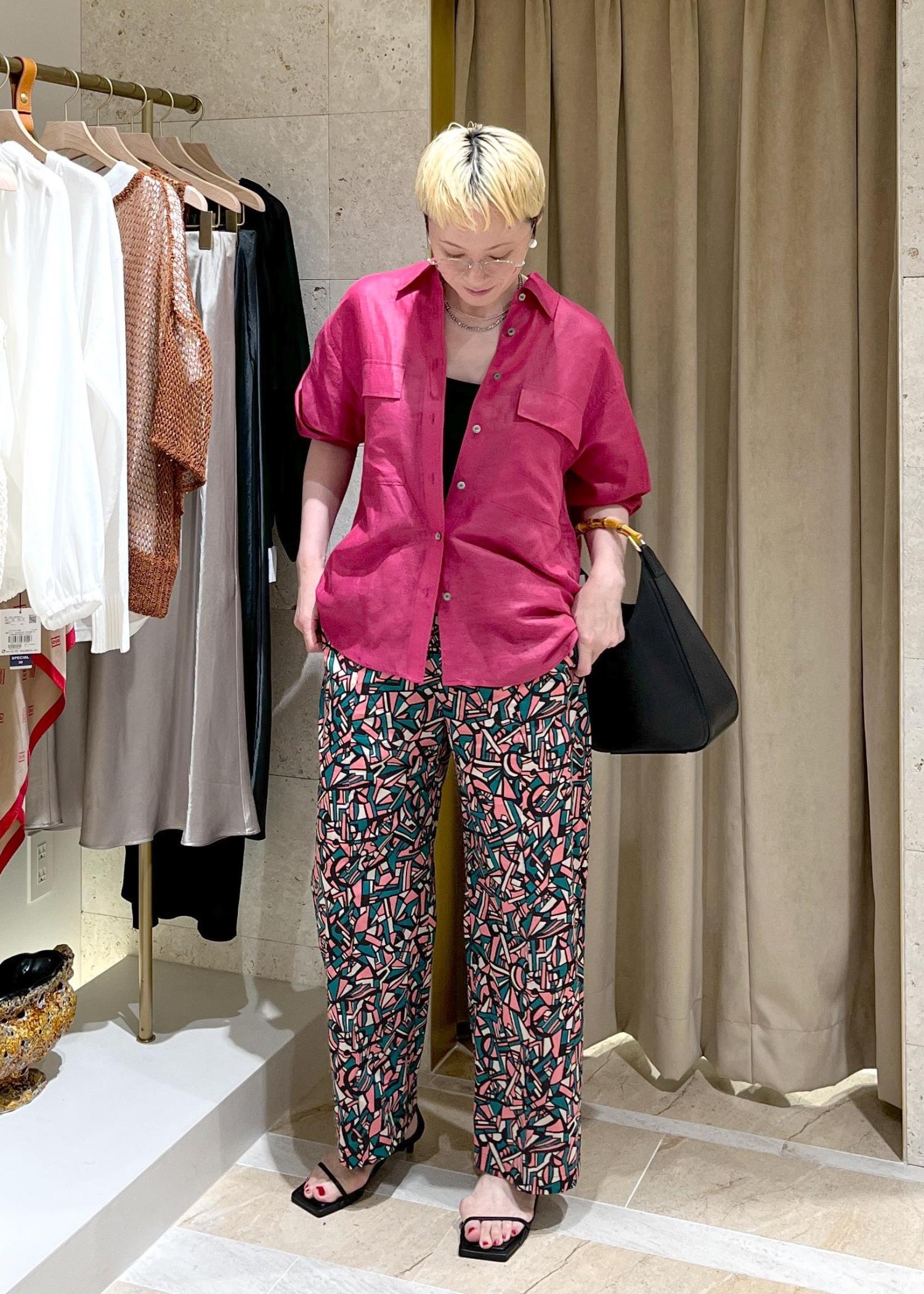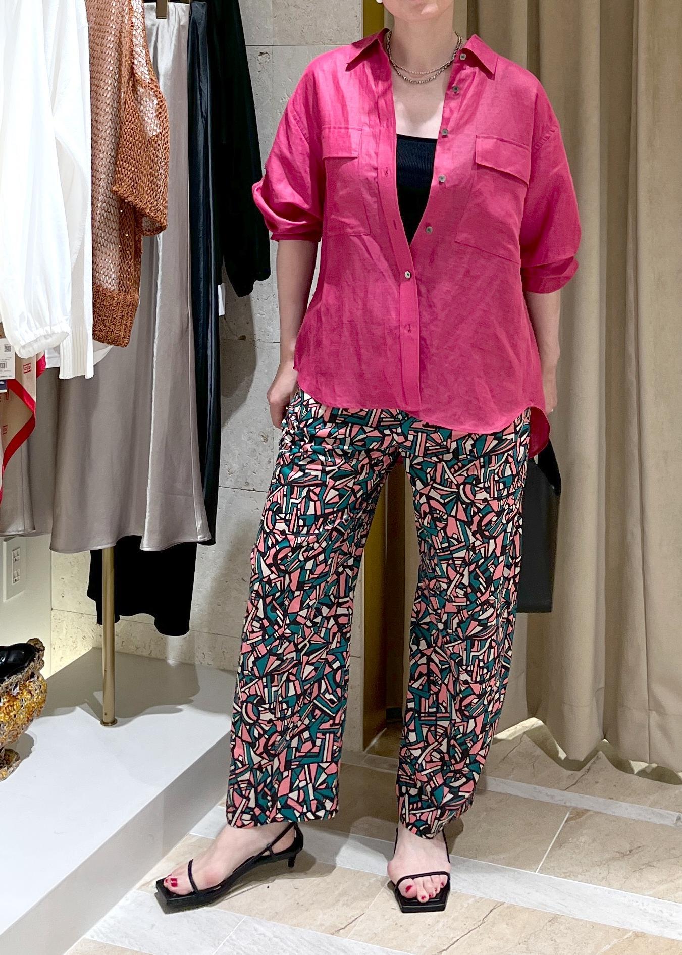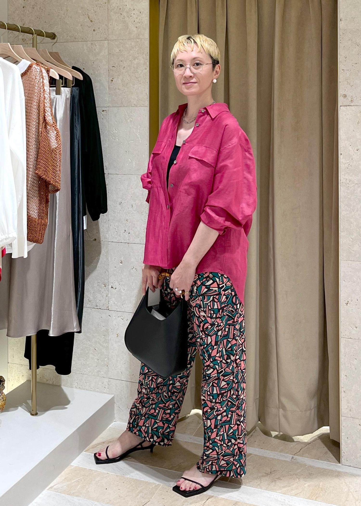 鮮やかなローズピンクのリネンシャツを合わせて、夏気分満載にしました。