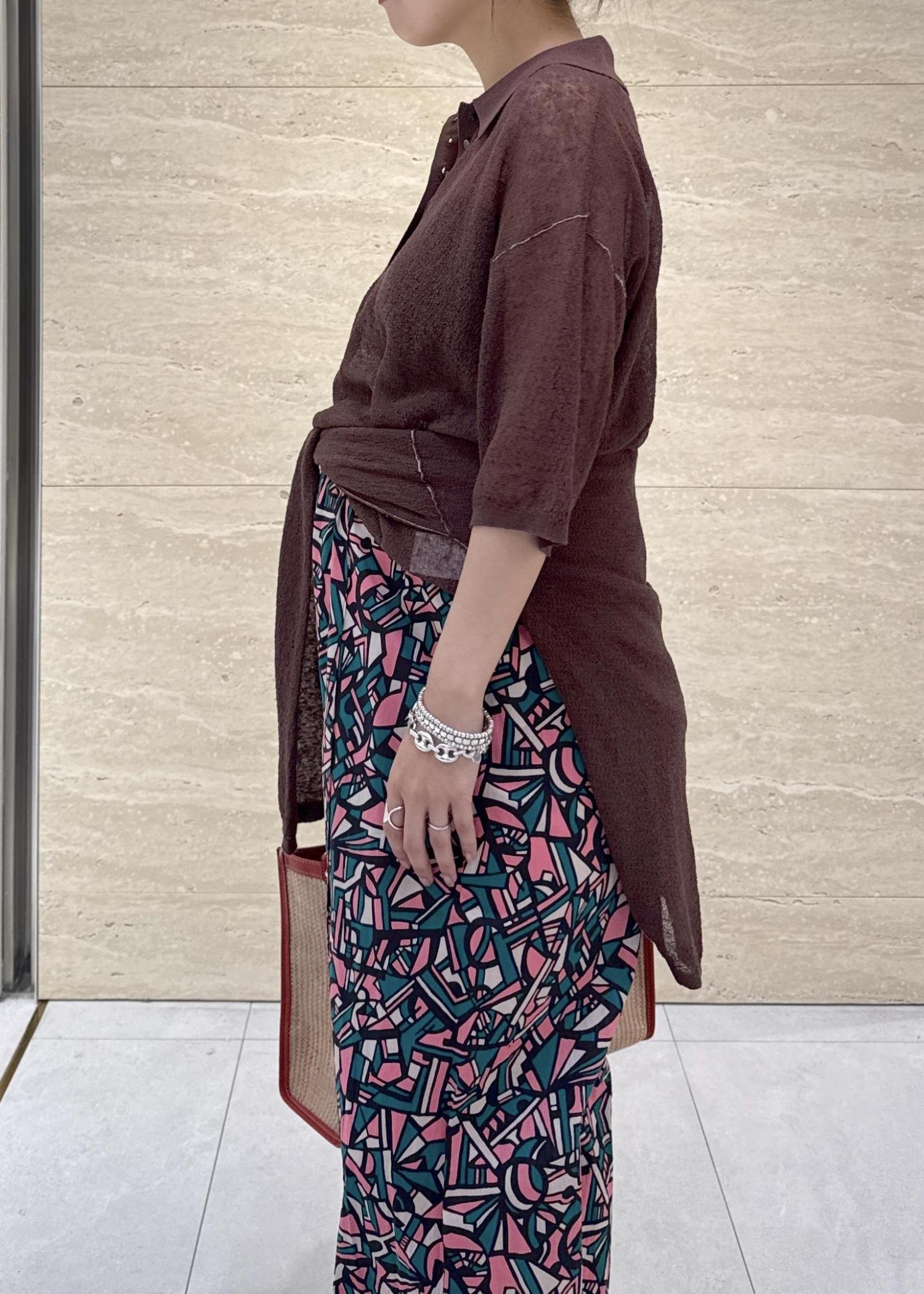 同素材のカーディガンを腰巻きし、リラックスしたコーディネートにしてみました。