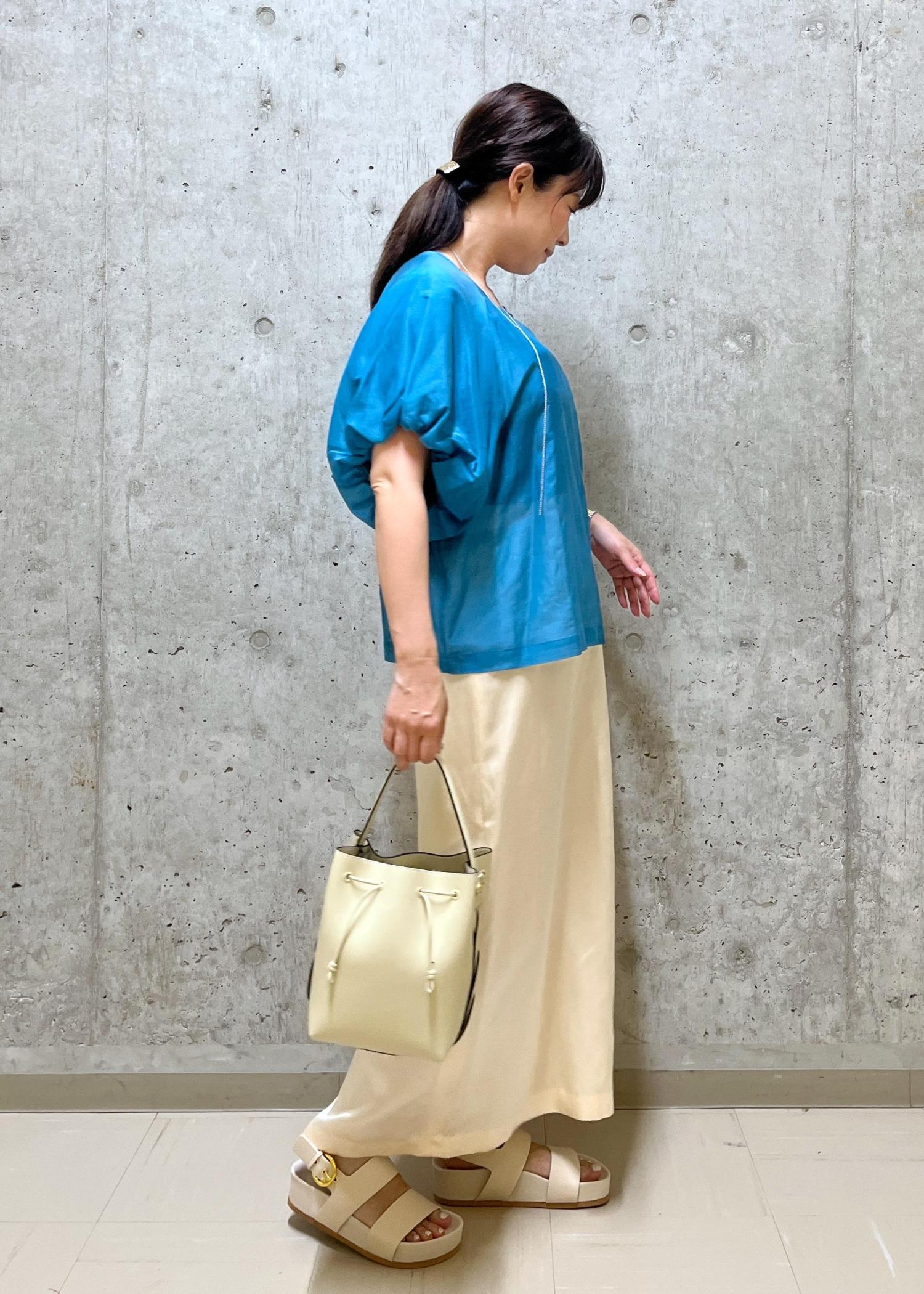バルーン袖が可愛いトップスは、Iラインシルエットのスカートで少し落ち着いた印象になるようにしました。