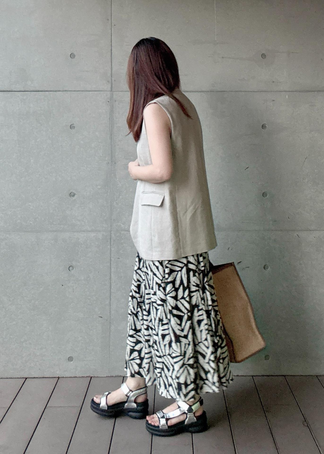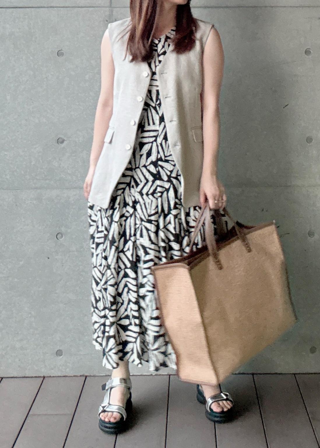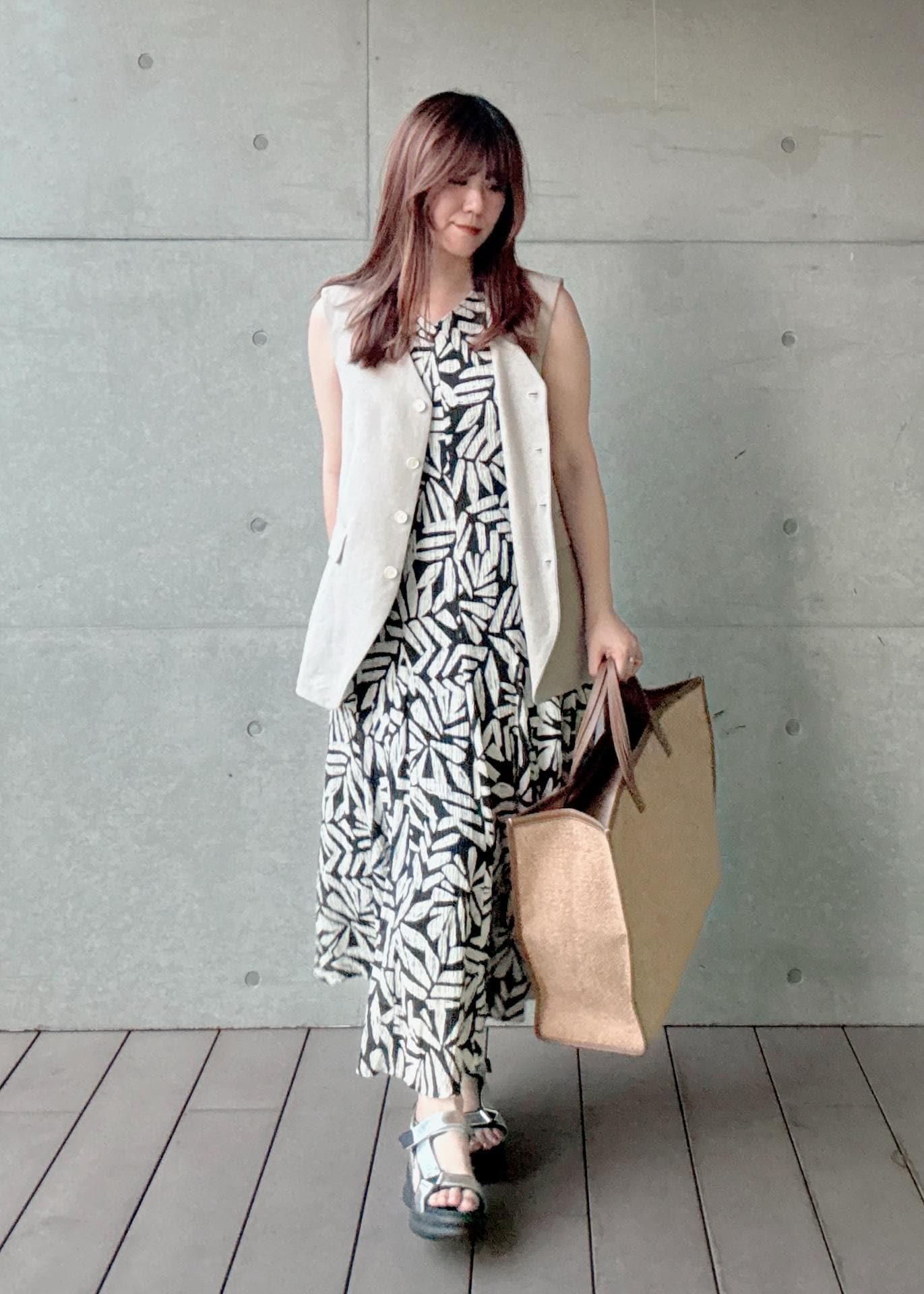 動きやすいワンピースと楽にはけるスポーツサンダルで快適に。気温調整にもかかせないジレをプラスすることで移動中や室内でも安心です。