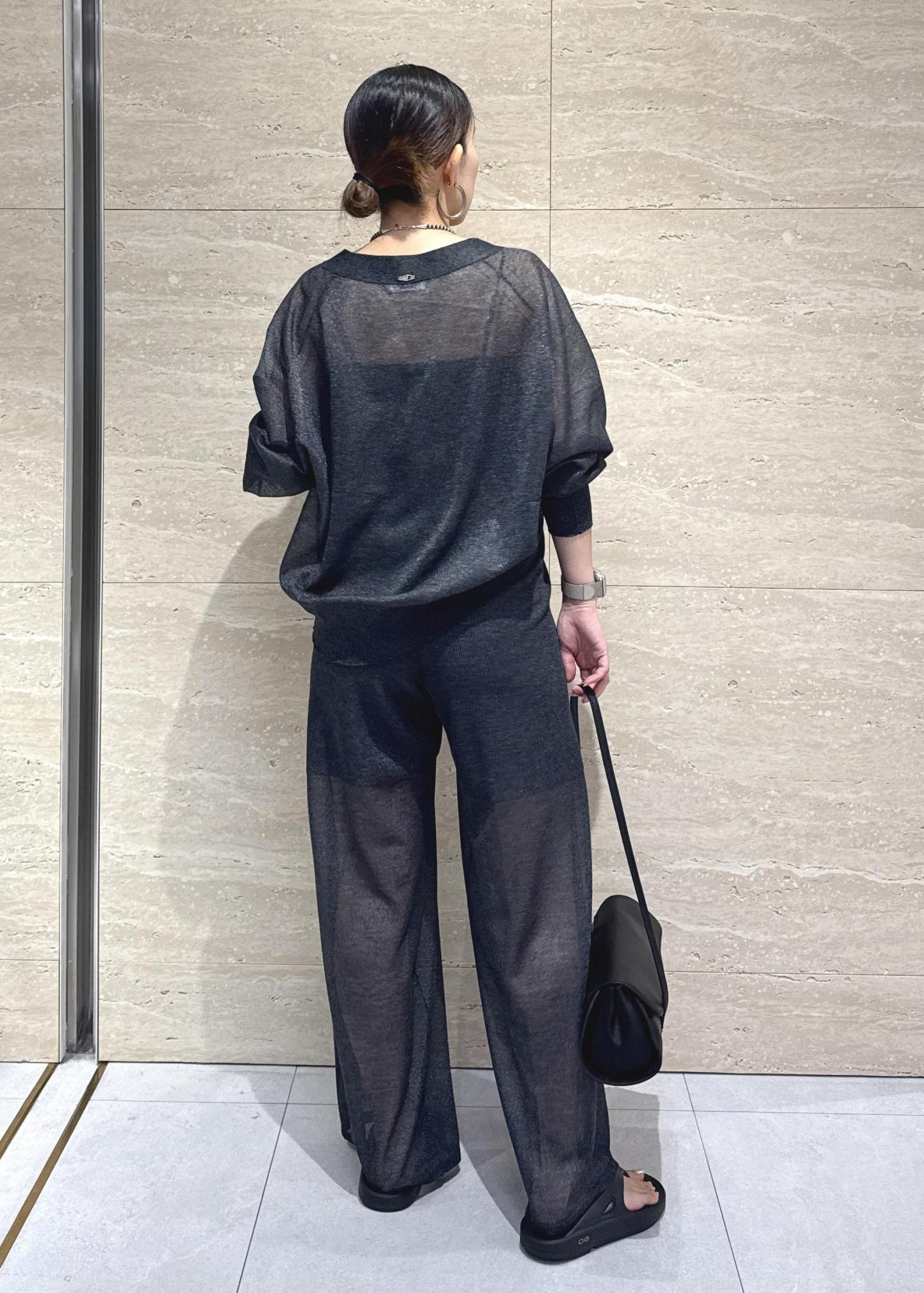 大人気のカーディガンと同素材のパンツを合わせたセットアップコーデ。